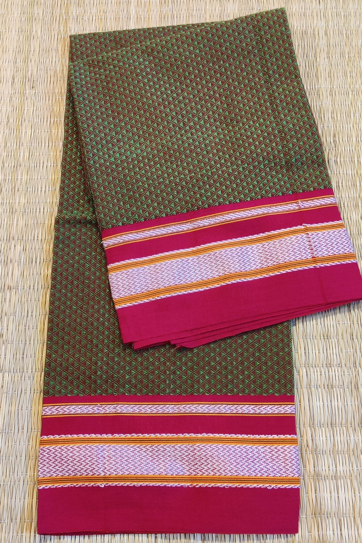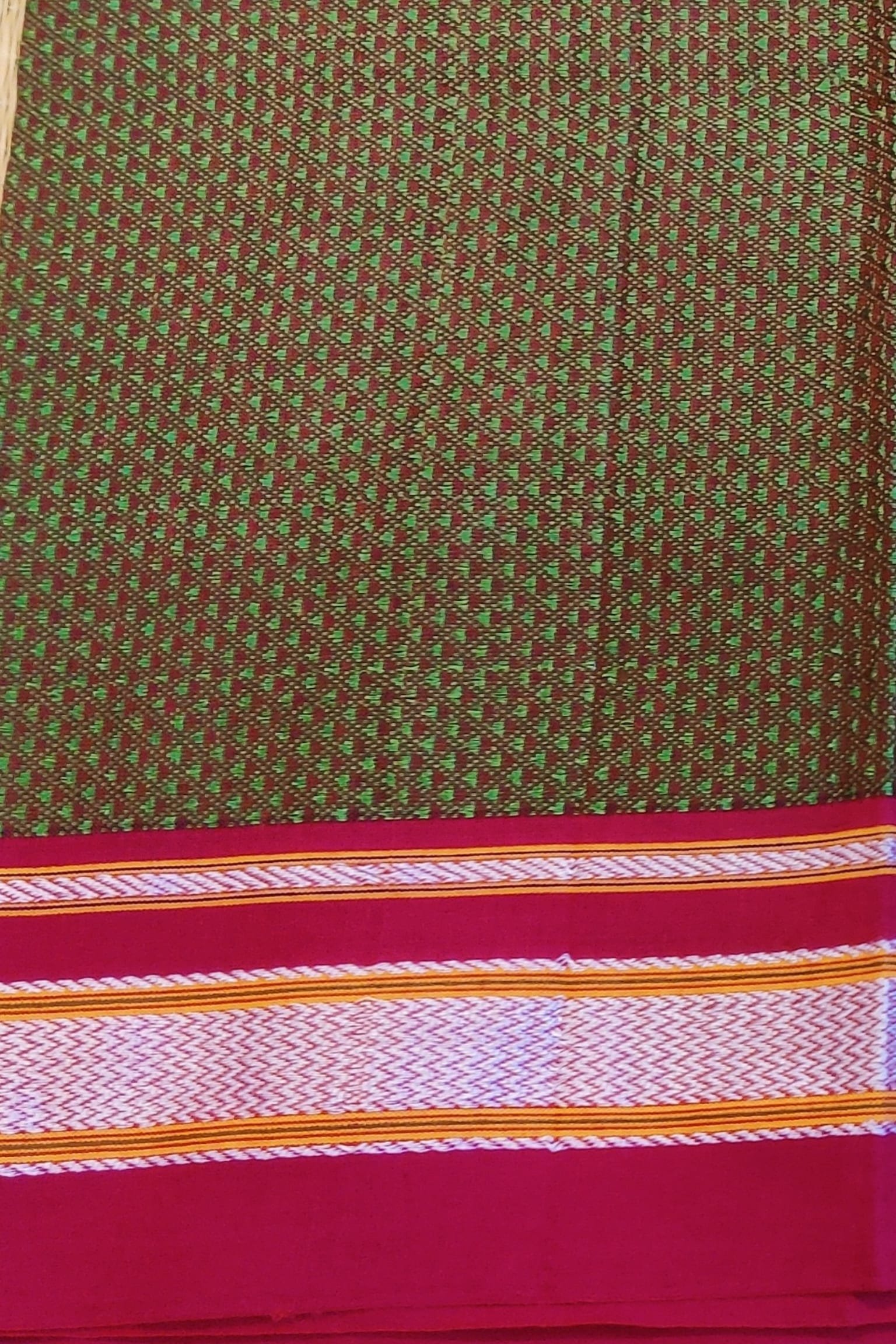 A vibrant green cotton silk Ilkal blouse piece woven in the traditional Khun pattern, accented with a striking red border featuring zigzag weave in offwhite and golden threads. The lively colour contrast and geometric pattern create a bold handcrafted aesthetic, while the breathable cotton silk base ensures comfort with a graceful sheen. This blouse piece adds a refreshing pop to festive and traditional saree styling.