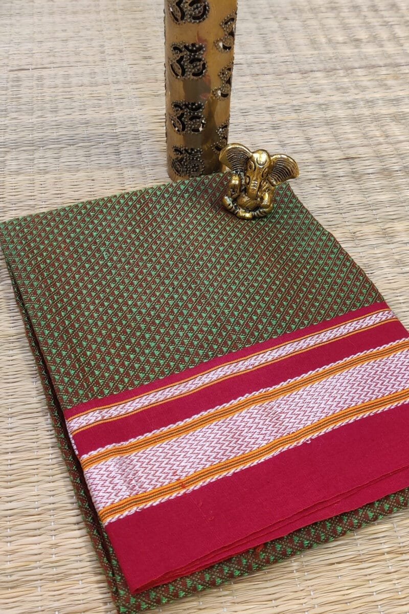 Green Khun Weave Ilkal Blouse Piece with Red Zigzag Border in Offwhite and Golden Thread