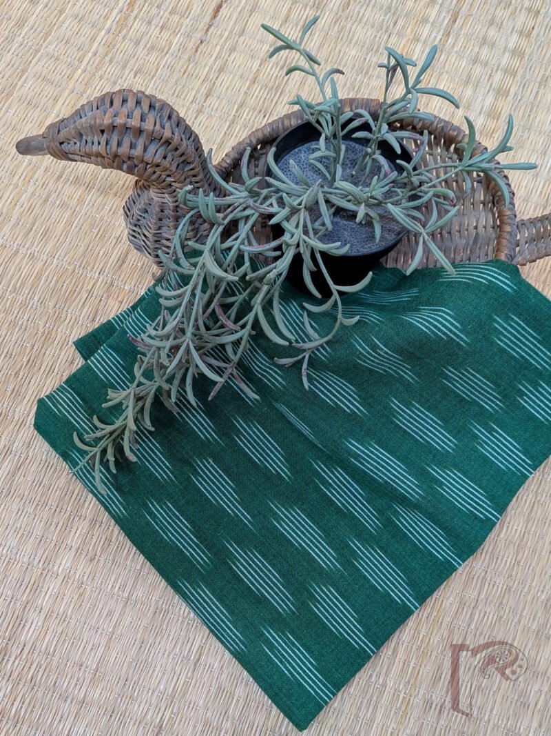 This green cotton ikkat blouse piece stands out for its refreshing simplicity, designed with a series of fine white lines running across the fabric to create a clean and structured look. The vibrant green base brings freshness, while the linear pattern adds rhythm and balance. Made from soft, breathable pure cotton, it offers excellent comfort and a flattering drape, making it ideal for long wear. Its versatile design allows effortless pairing with a wide range of sarees—from printed cottons to rich silks. With its crisp line detailing and timeless ikkat weaving, this blouse piece beautifully blends modern minimalism with traditional craftsmanship.