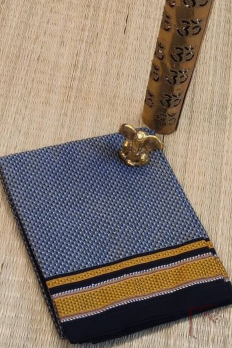 A refined dark grey cotton silk Ilkal blouse piece featuring the timeless Khun weave, elevated by a rich black border with elegant gold and white thread stripes. The interplay of deep hues and metallic accents gives it a subtle festive charm, perfect for pairing with earthy or bold sarees alike. Soft yet structured, this fabric offers durability and elegance in equal measure.