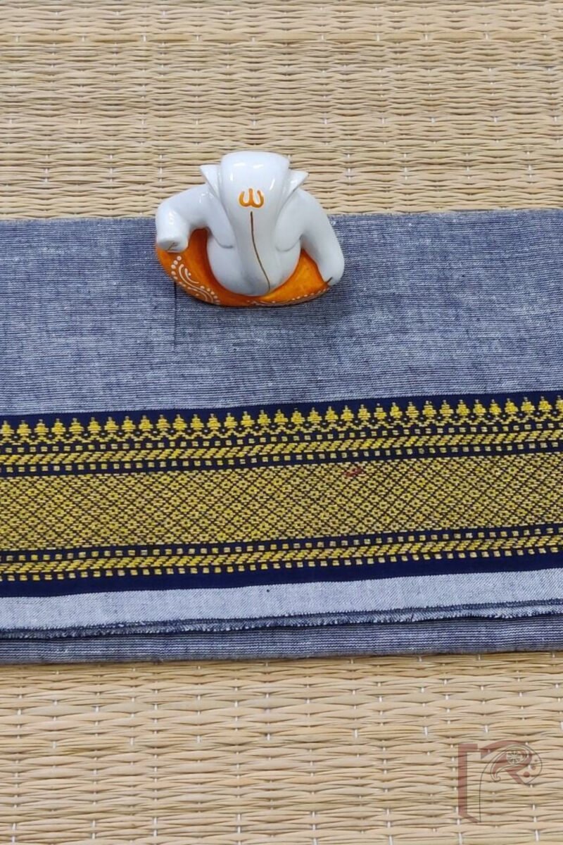A classy grey Mangalgiri slub cotton blouse piece featuring a rich navy blue border intricately woven with yellow jaal patterns. The dual-toned shading on the body combined with the delicate border makes it a refined choice for sarees in both bold and pastel shades. The jaal design adds a touch of artisanal flair, perfect for semi-traditional or formal wear.
