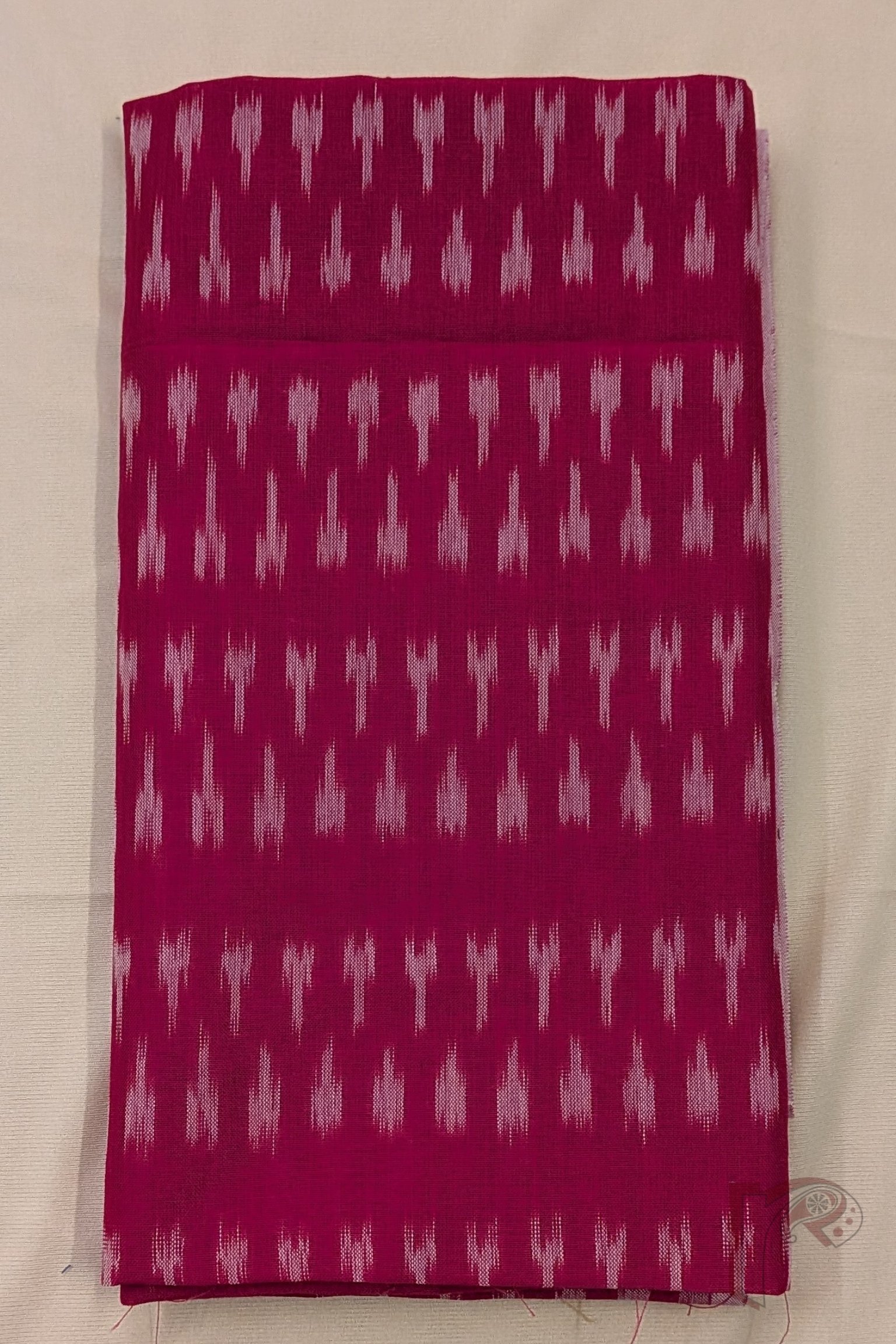This radiant hot pink mercerized cotton silk Ikkat blouse piece features closely woven small white motifs that create a dense and eye-catching pattern across the fabric. The vivid pink base shines beautifully thanks to the mercerized finish, giving it a soft glow that enhances its festive appeal. The tiny white motifs are evenly spaced, reflecting the finesse of traditional Ikkat craftsmanship. Made from mercerized cotton with a silk-like sheen, this blouse piece offers enhanced durability, vibrant color retention, and breathable comfort. It is perfect for pairing with contrasting or tonal sarees for a bold yet refined ethnic statement.