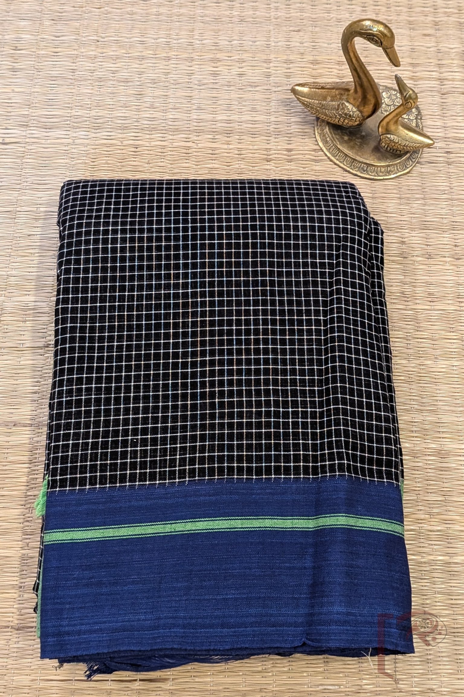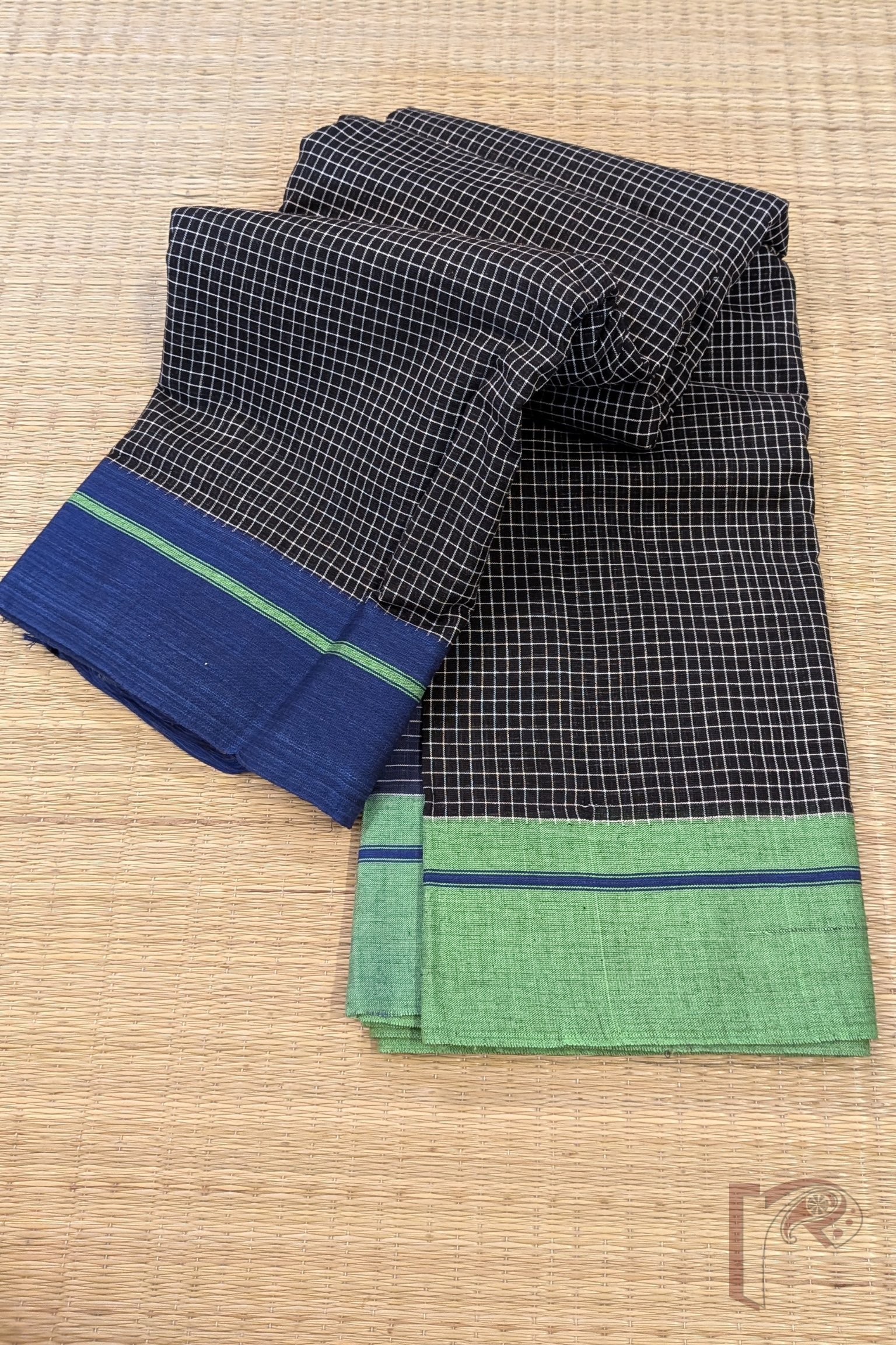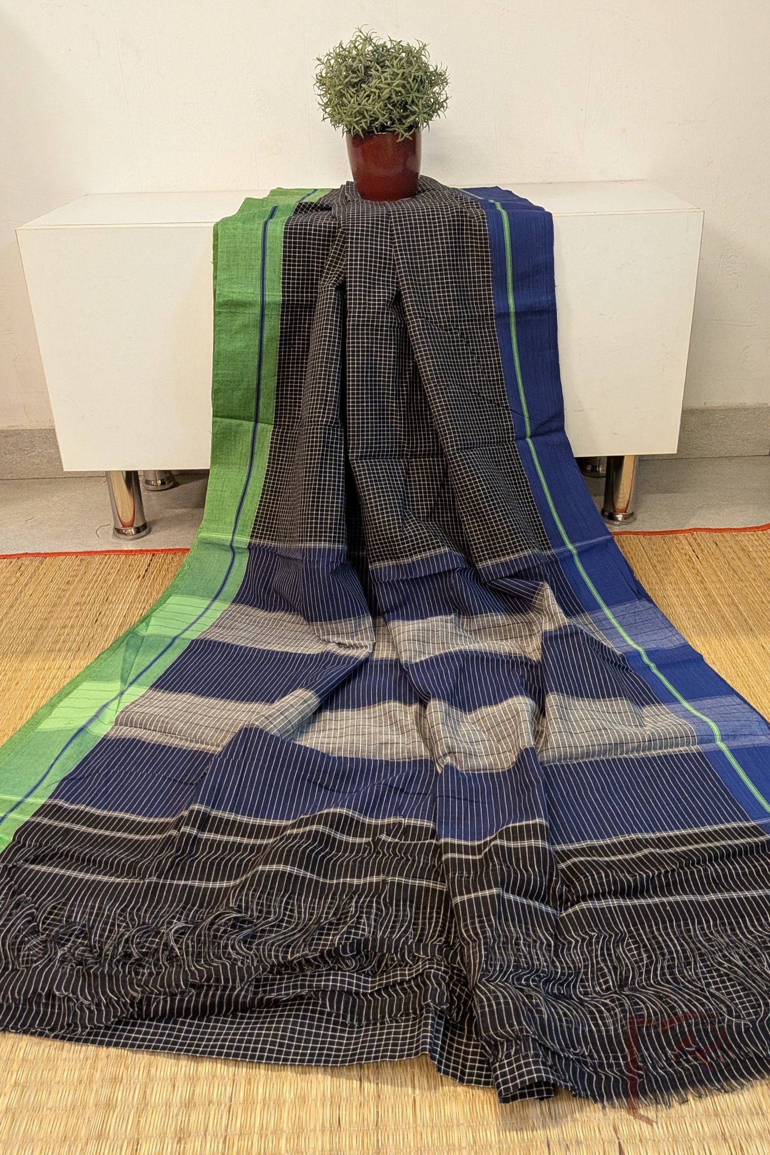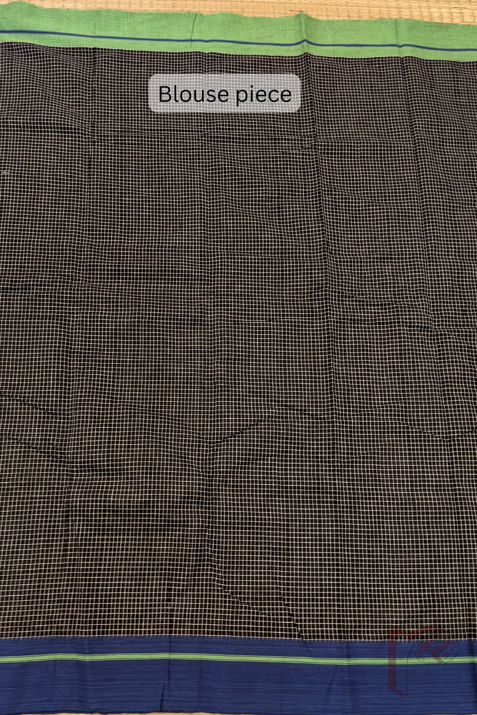 This unique saree features a black checked cotton body complemented by dual borders — blue on the upper edge and green on the lower edge. The interplay of contrasting colors gives it a contemporary yet traditional appeal. Lightweight and breathable, it is ideal for day-long wear and festive occasions. The saree comes with a running blouse piece, making it a perfect choice for those who appreciate bold contrasts and authentic handloom artistry.