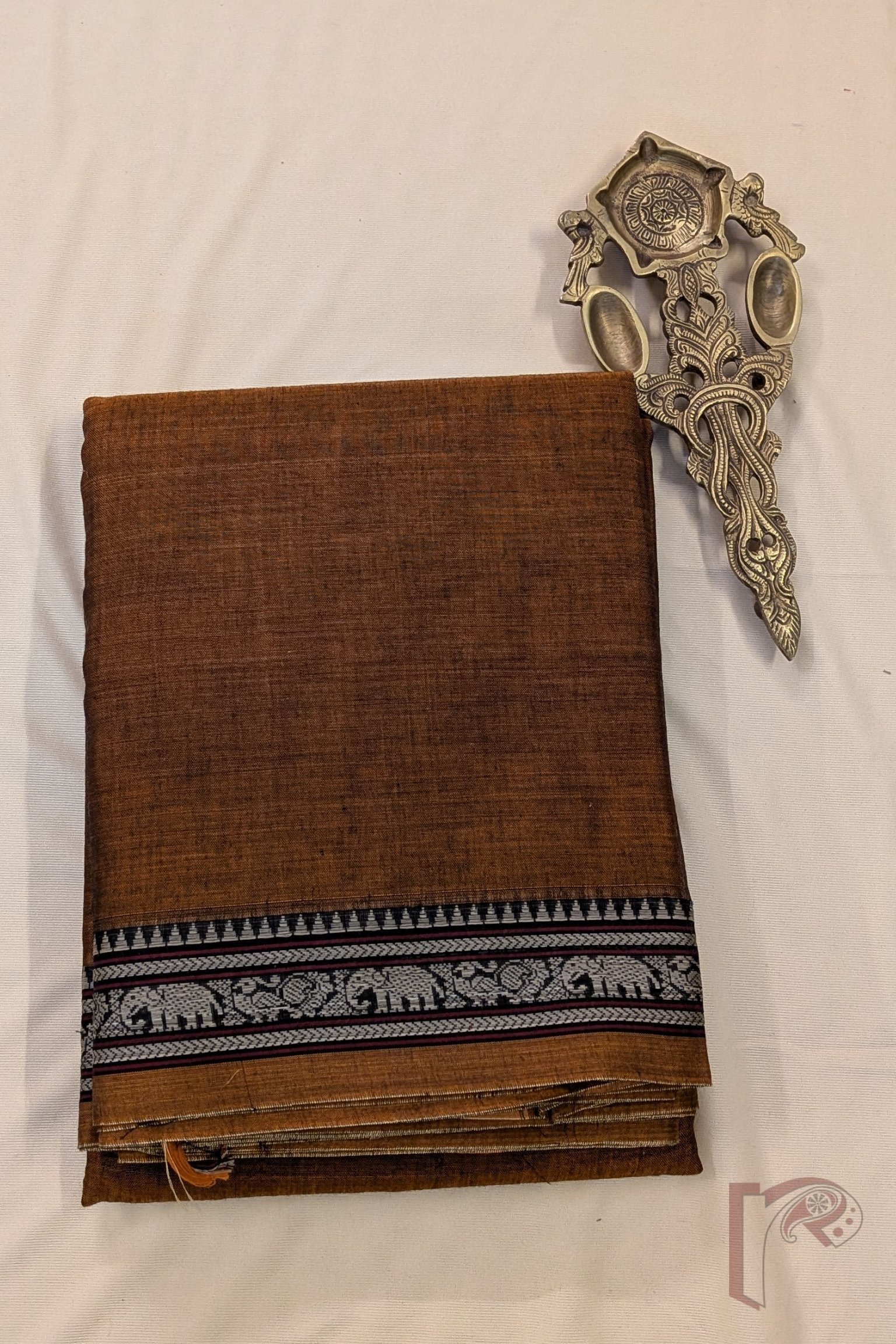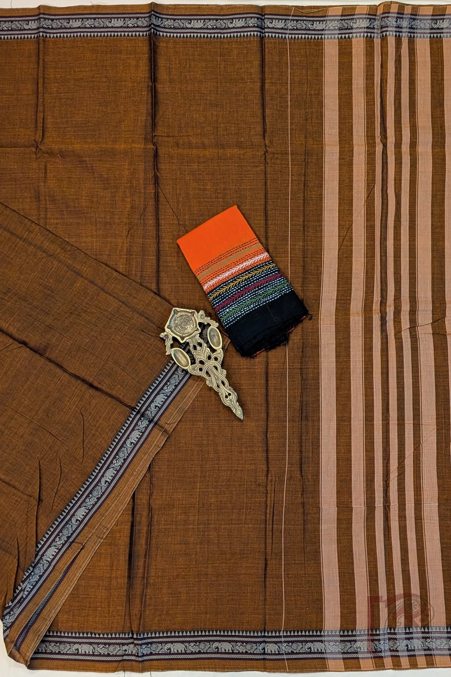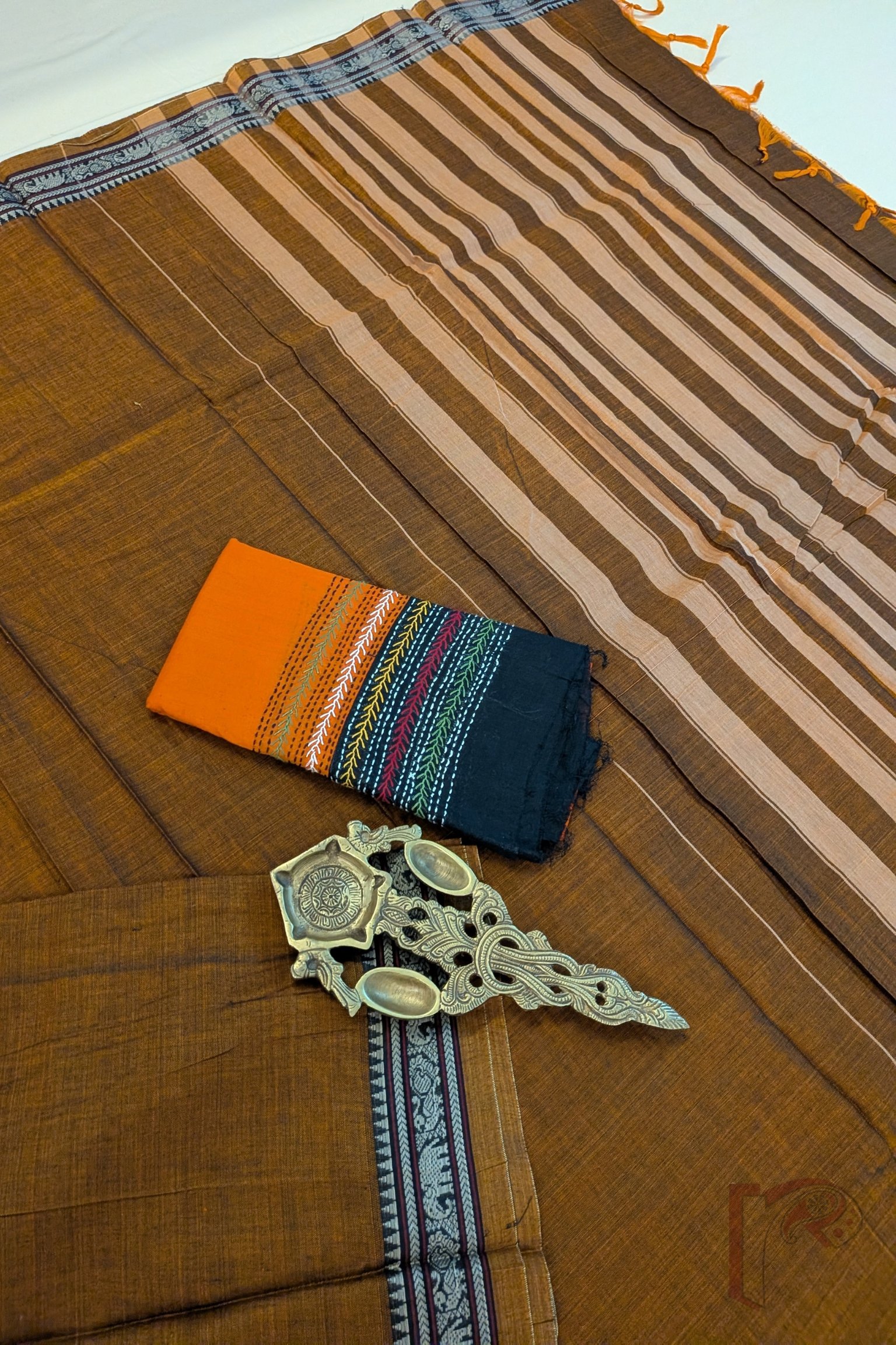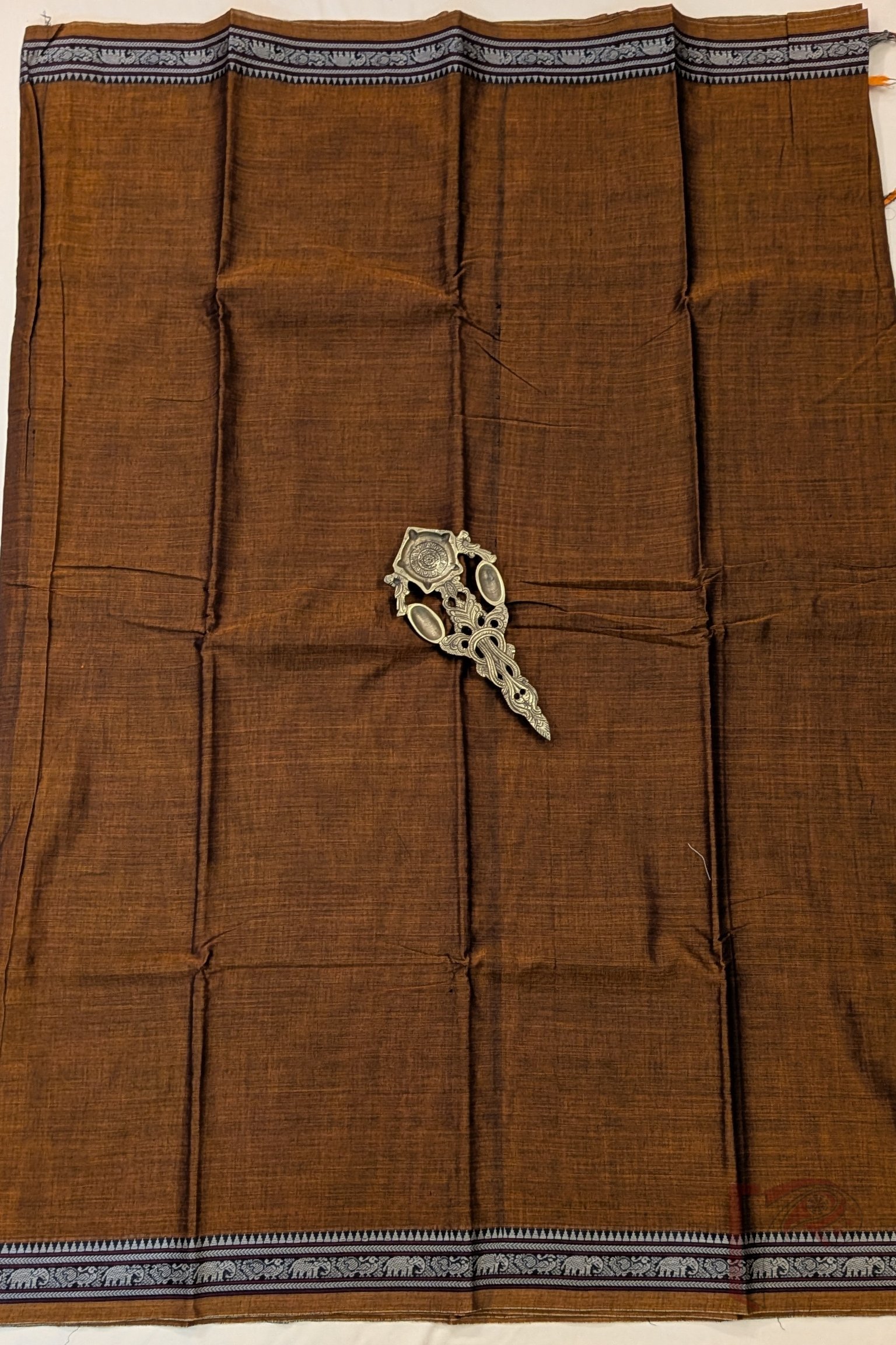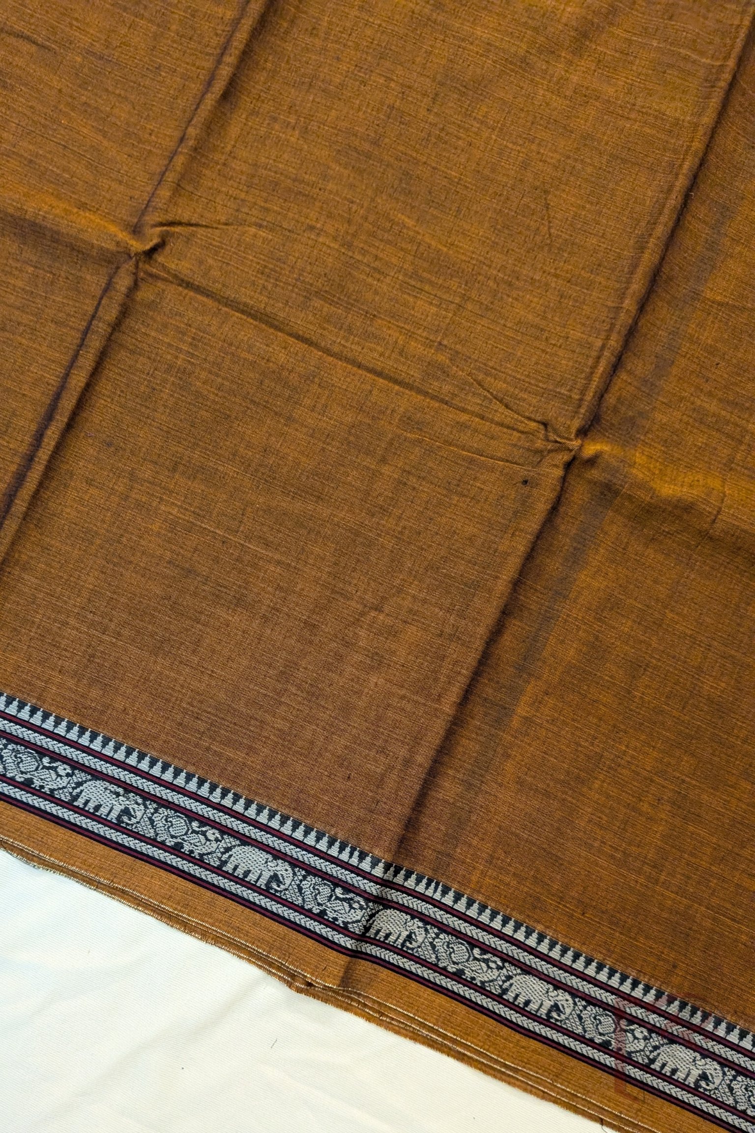 Radiating warmth and richness, this dark mustard yellow Ilkal saree is woven in fine mercerized cotton with a clean solid body and 2-inch border. The matching pallu features thin and thick light orange stripes, lending depth and a gentle play of colour. Lightweight and breathable, this saree offers ease of movement with a polished finish, making it suitable for both casual and festive occasions. Comes with a running blouse for effortless coordination.