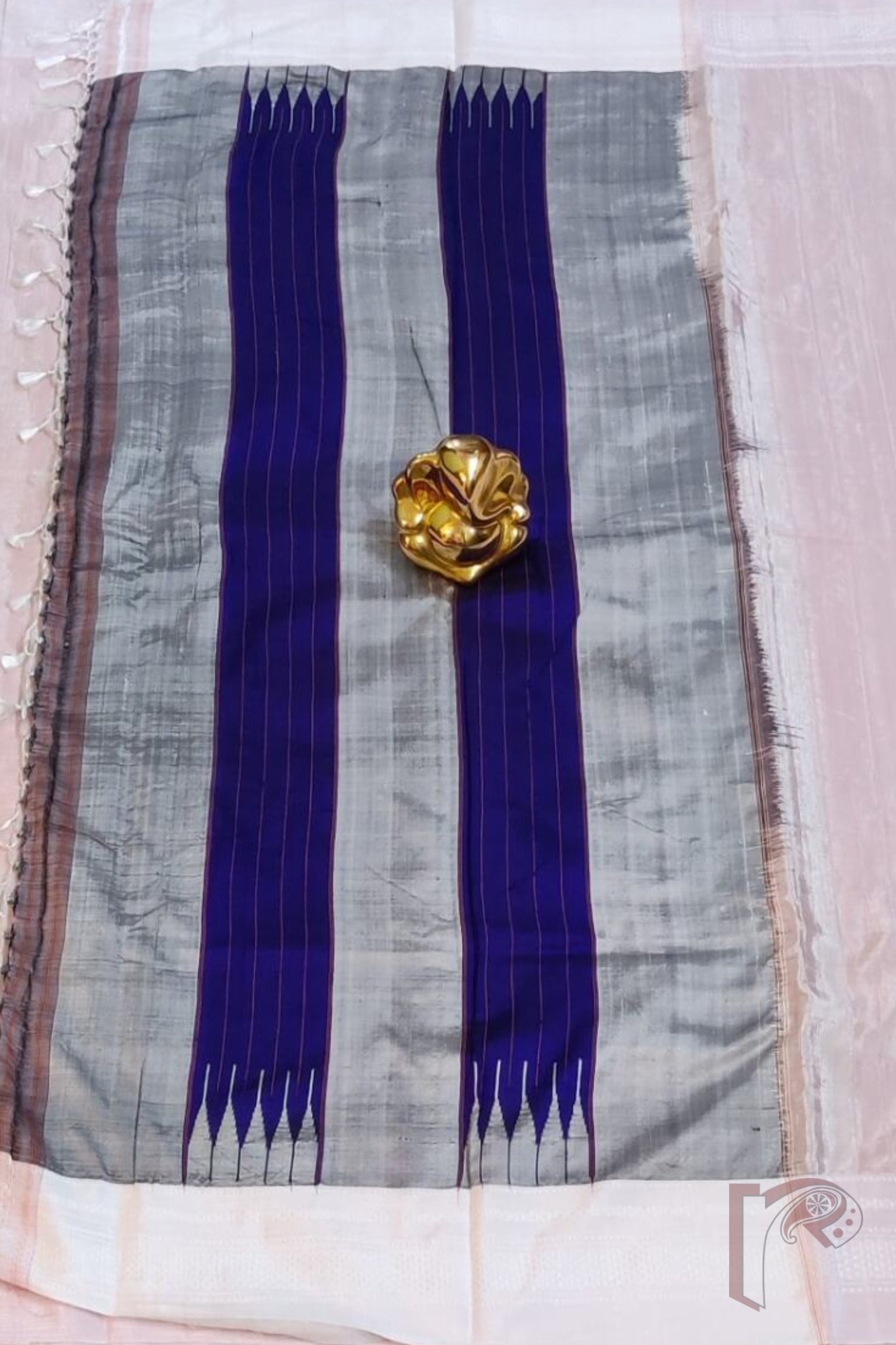 This Ilkal saree radiates delicate charm with its light baby pink mercerized cotton silk body, exuding freshness and soft femininity. The saree features a subtle self-woven border with fine white thread work, giving it a textured elegance that stands apart. Its highlight is the traditional pure silk pallu, seamlessly woven to the body using the authentic Ilkal technique, adorned with vertical stripes in shades of grey and blue. This combination of pastel beauty with bold striped contrast makes it a perfect drape for occasions where you want understated grace with a touch of cultural richness. Lightweight, comfortable, and timeless, this saree is a must-have in your handloom collection.