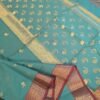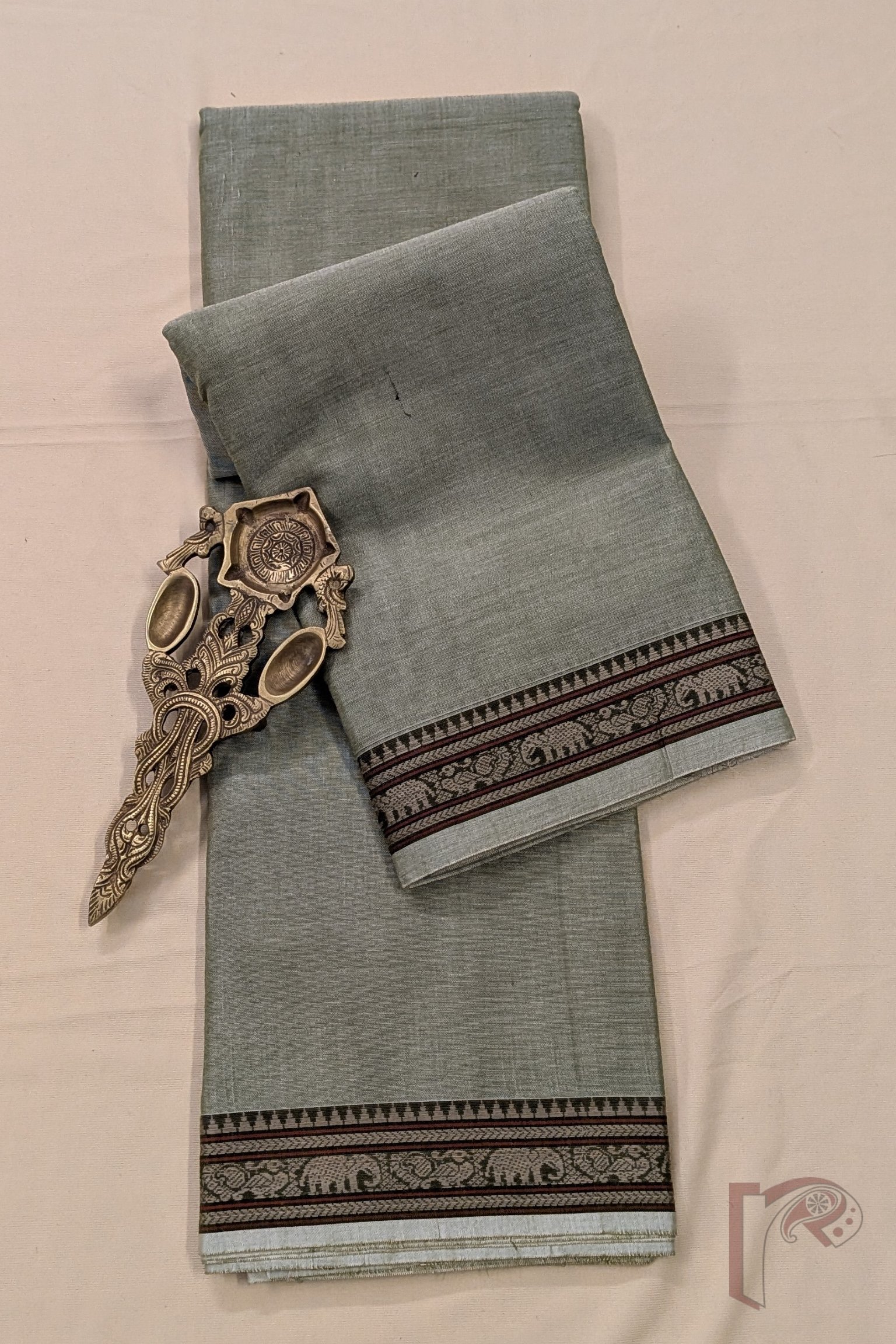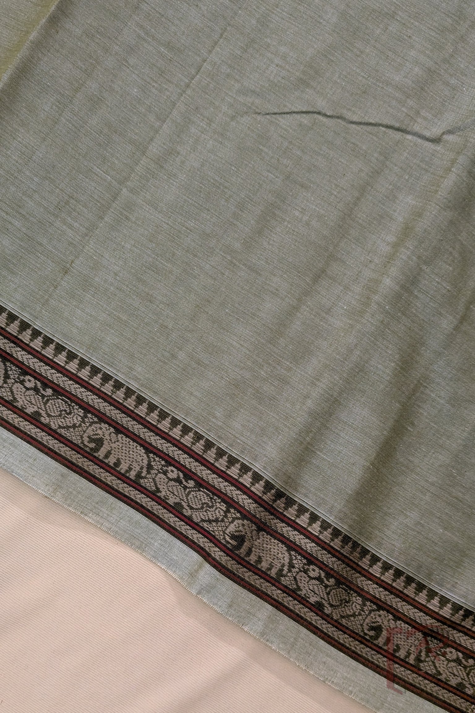 Subtle and refreshing, this light pista green Ilkal saree is woven in premium mercerized cotton with a minimal solid body and 2-inch border. The coordinated pallu features thin and thick off white stripes, lending a soft contrast that enhances the saree’s understated charm. The smooth texture and breathable weave make it perfect for warm climates and long wear, complete with a running blouse for a polished finish.
