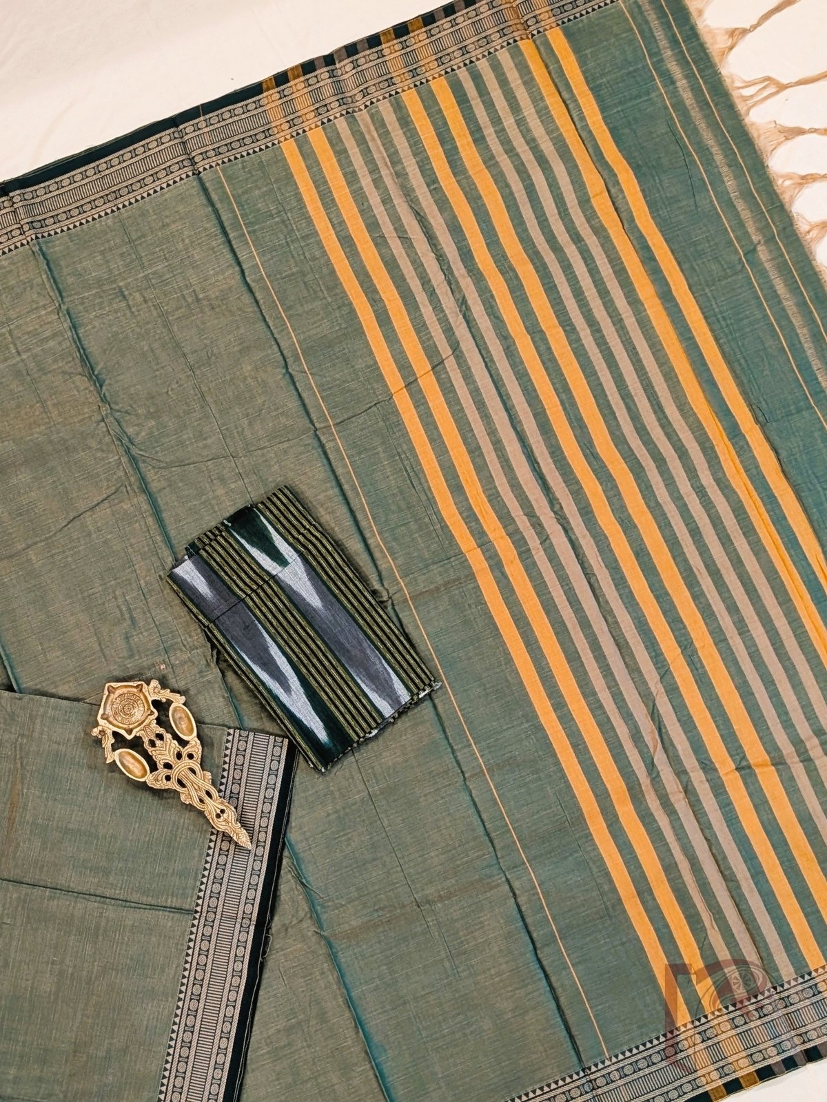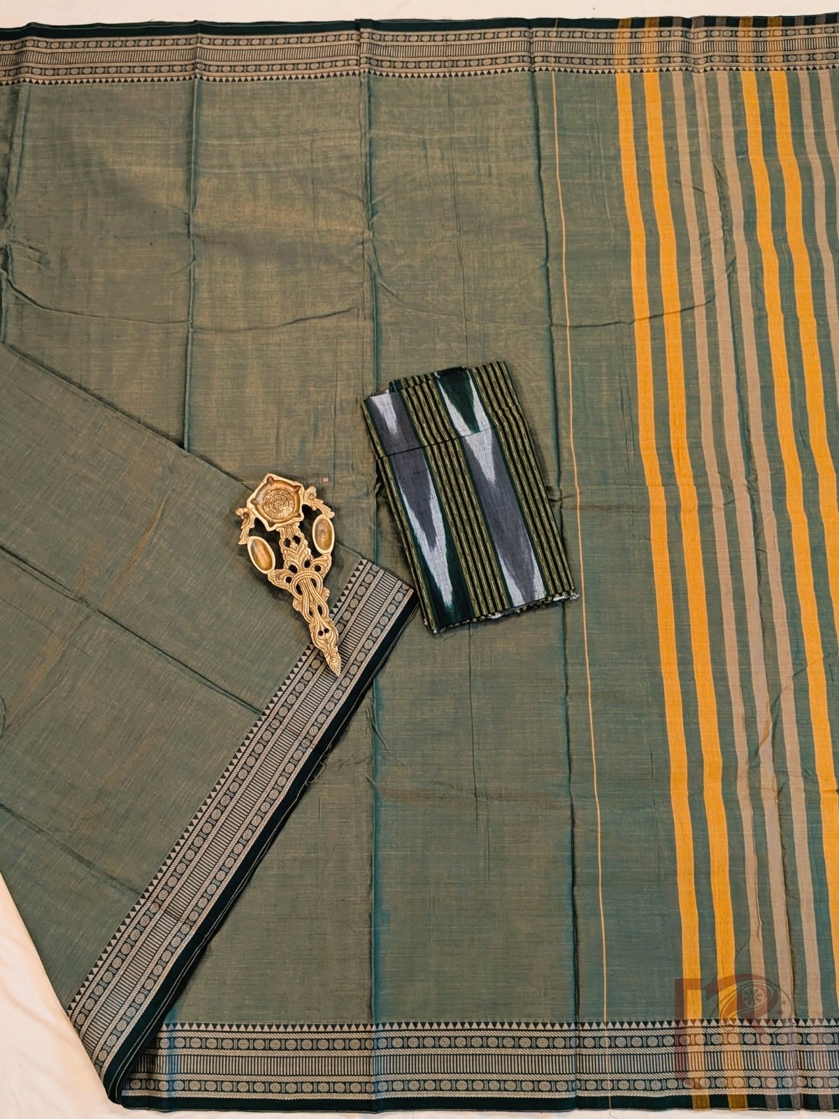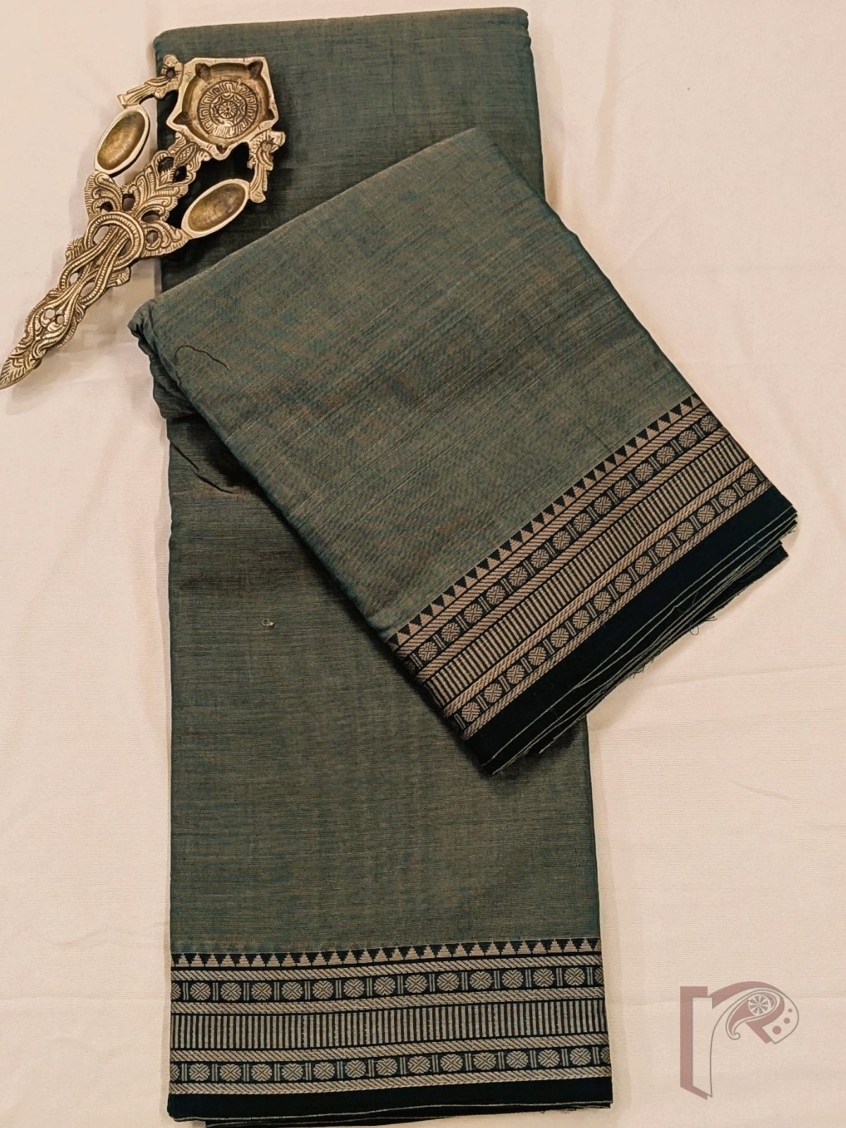 This earthy-toned saree features a dark light olive green mercerized cotton body paired with a 3-inch thread border showcasing circles, lines, and temple motifs, adding rich traditional character. The pallu is adorned with thin and thick stripes in orange and beige, creating a balanced and elegant contrast. The mercerized cotton weave ensures a lightweight, breathable drape with enhanced durability, making it both functional and stylish. Comes with a running blouse for a complete look.