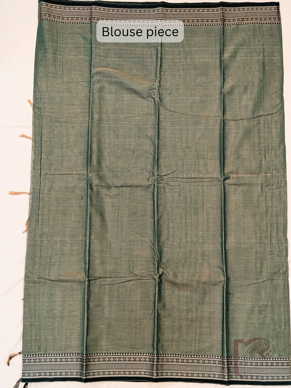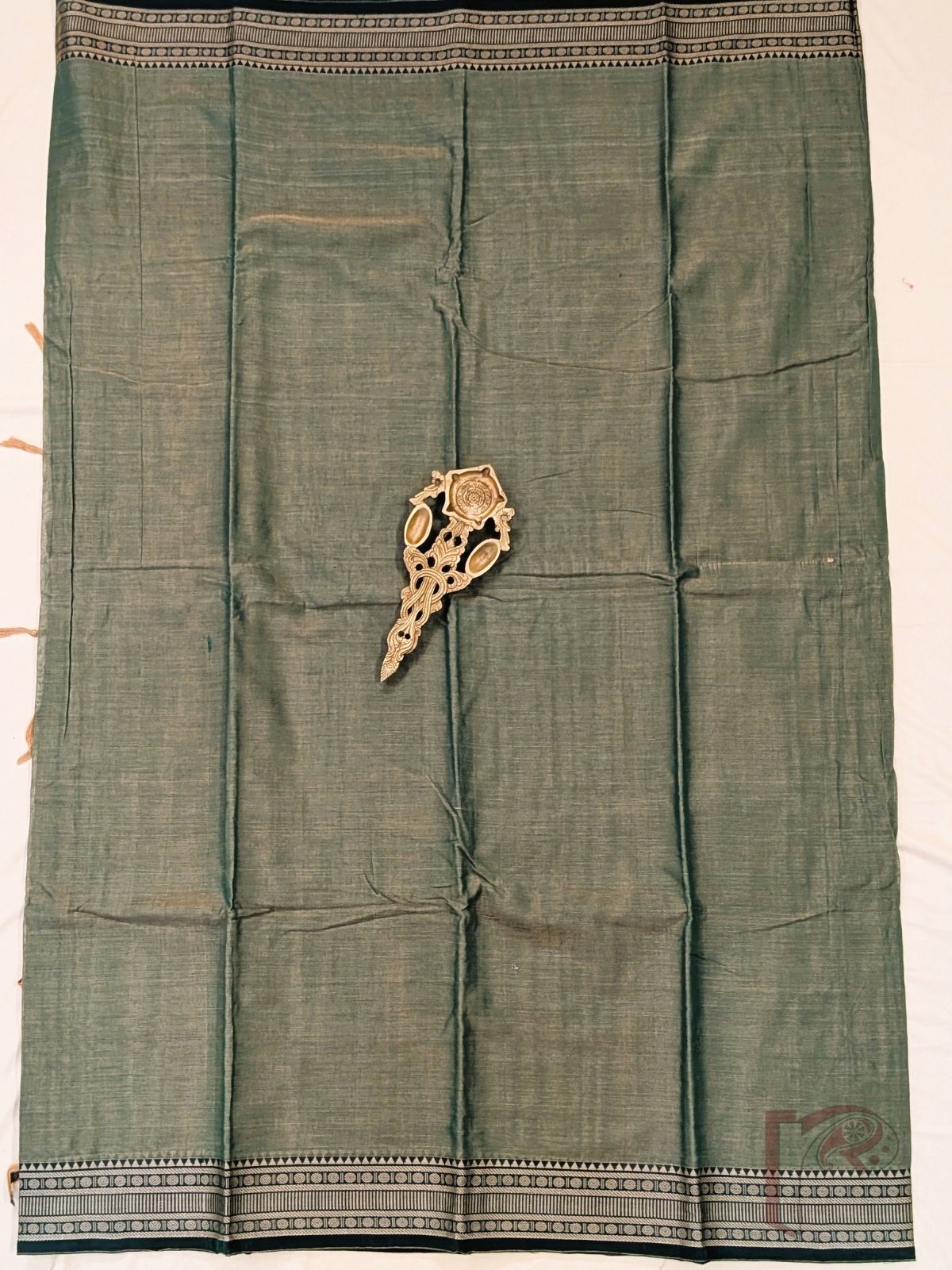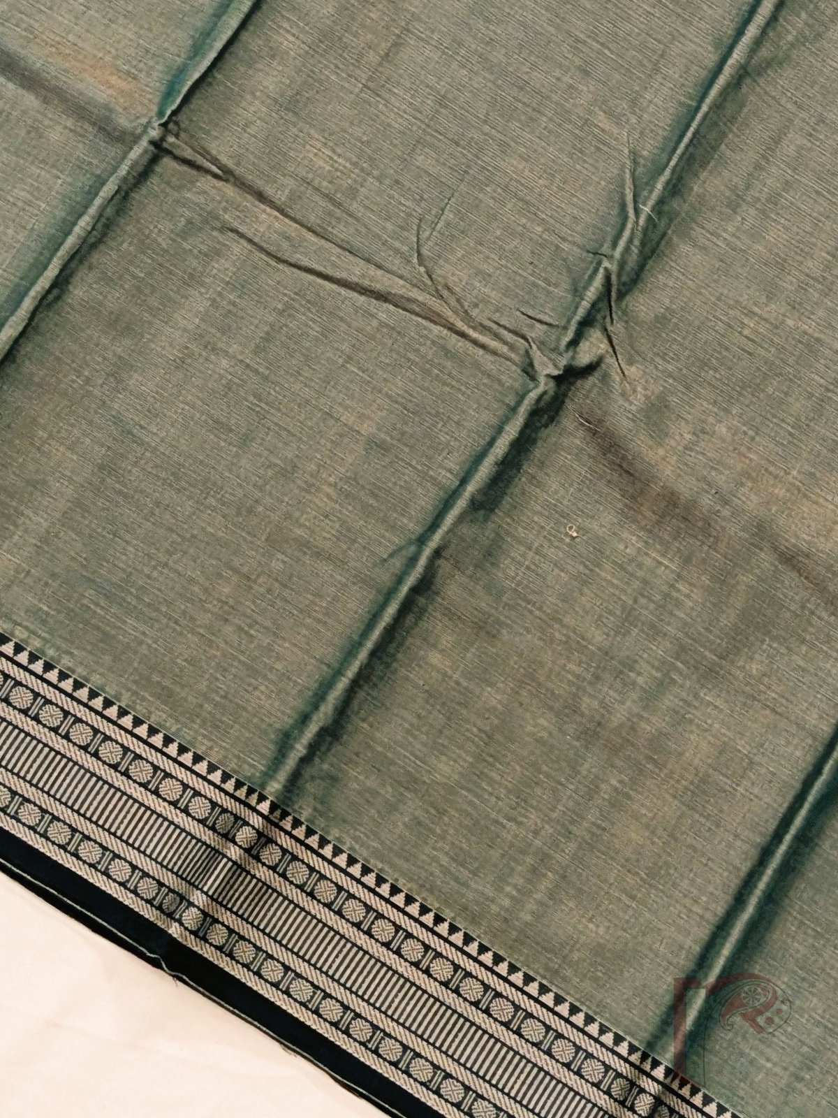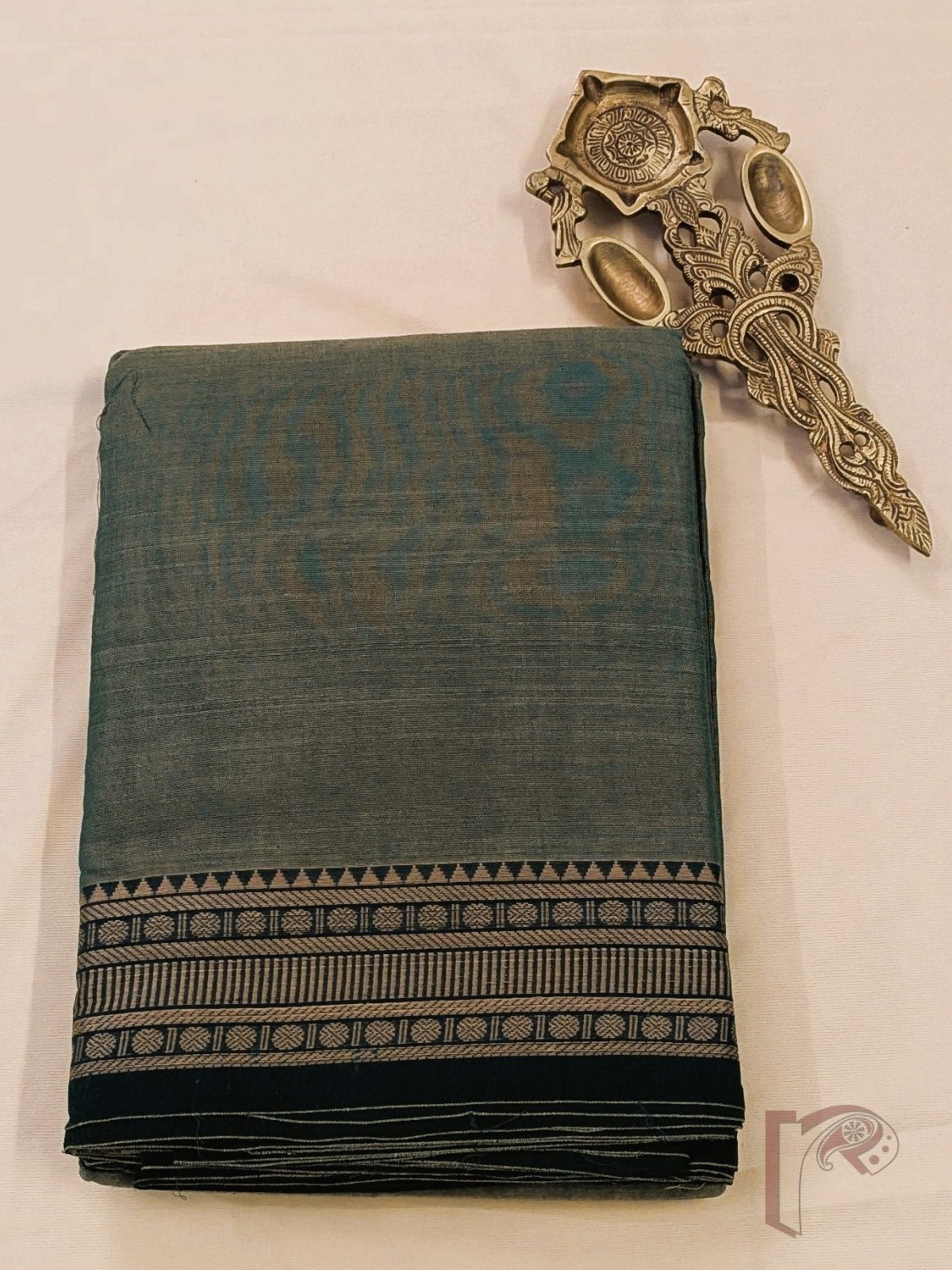 This earthy-toned saree features a dark light olive green mercerized cotton body paired with a 3-inch thread border showcasing circles, lines, and temple motifs, adding rich traditional character. The pallu is adorned with thin and thick stripes in orange and beige, creating a balanced and elegant contrast. The mercerized cotton weave ensures a lightweight, breathable drape with enhanced durability, making it both functional and stylish. Comes with a running blouse for a complete look.