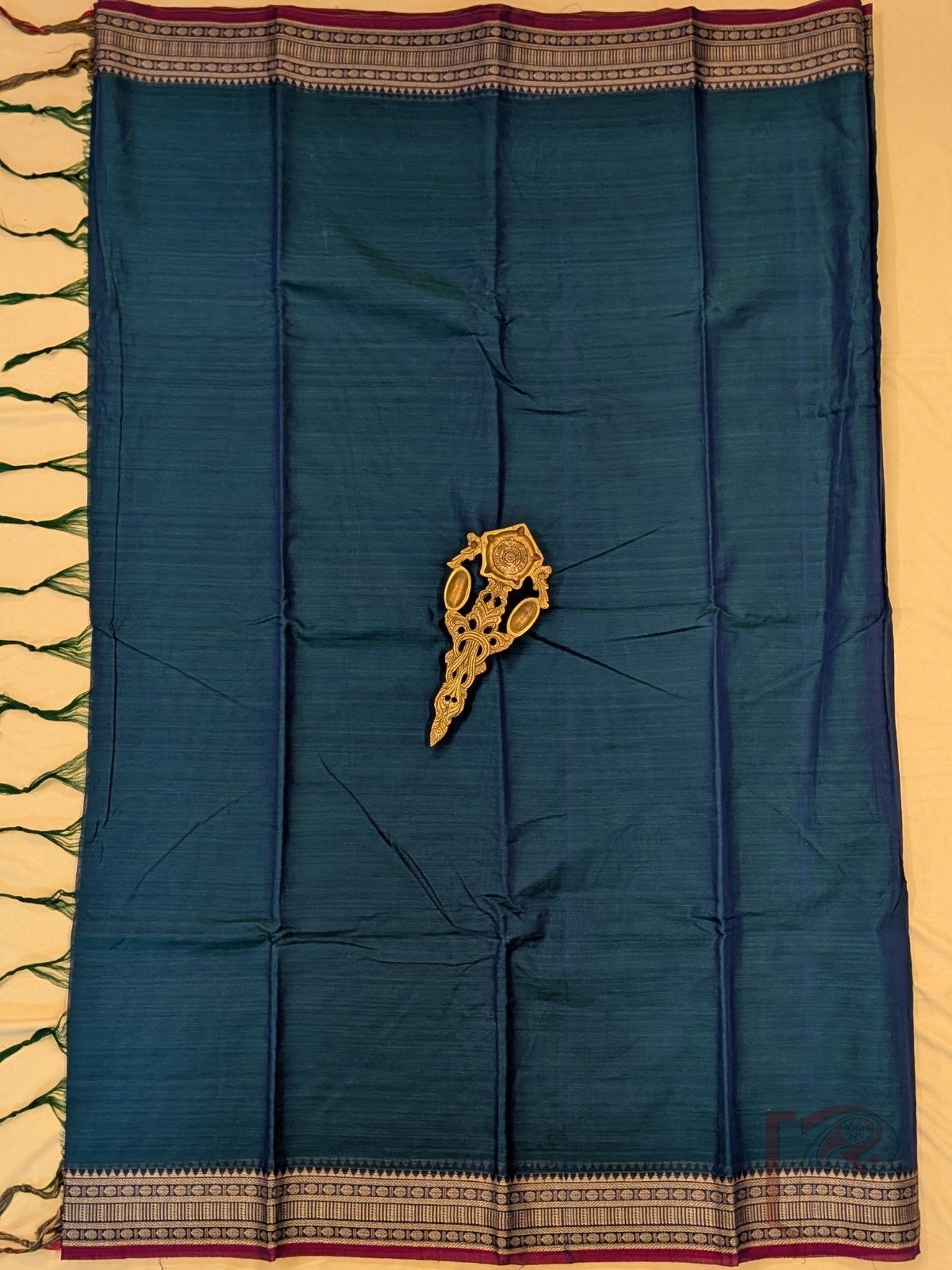 Ilkal Heritage – Peacock Blue Mercerized Cotton Ilkal Saree with Magenta Selvage and Orange-Green Striped Pallu