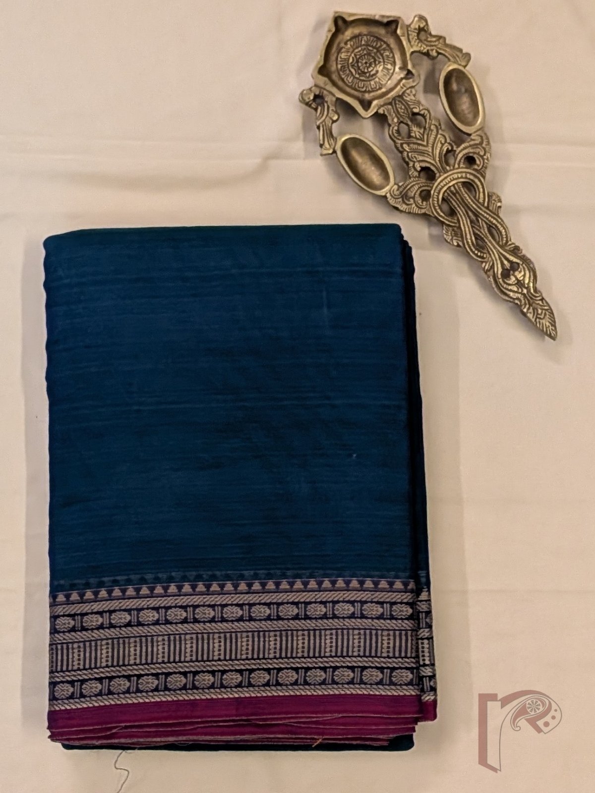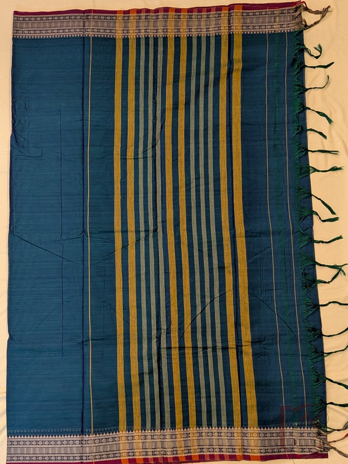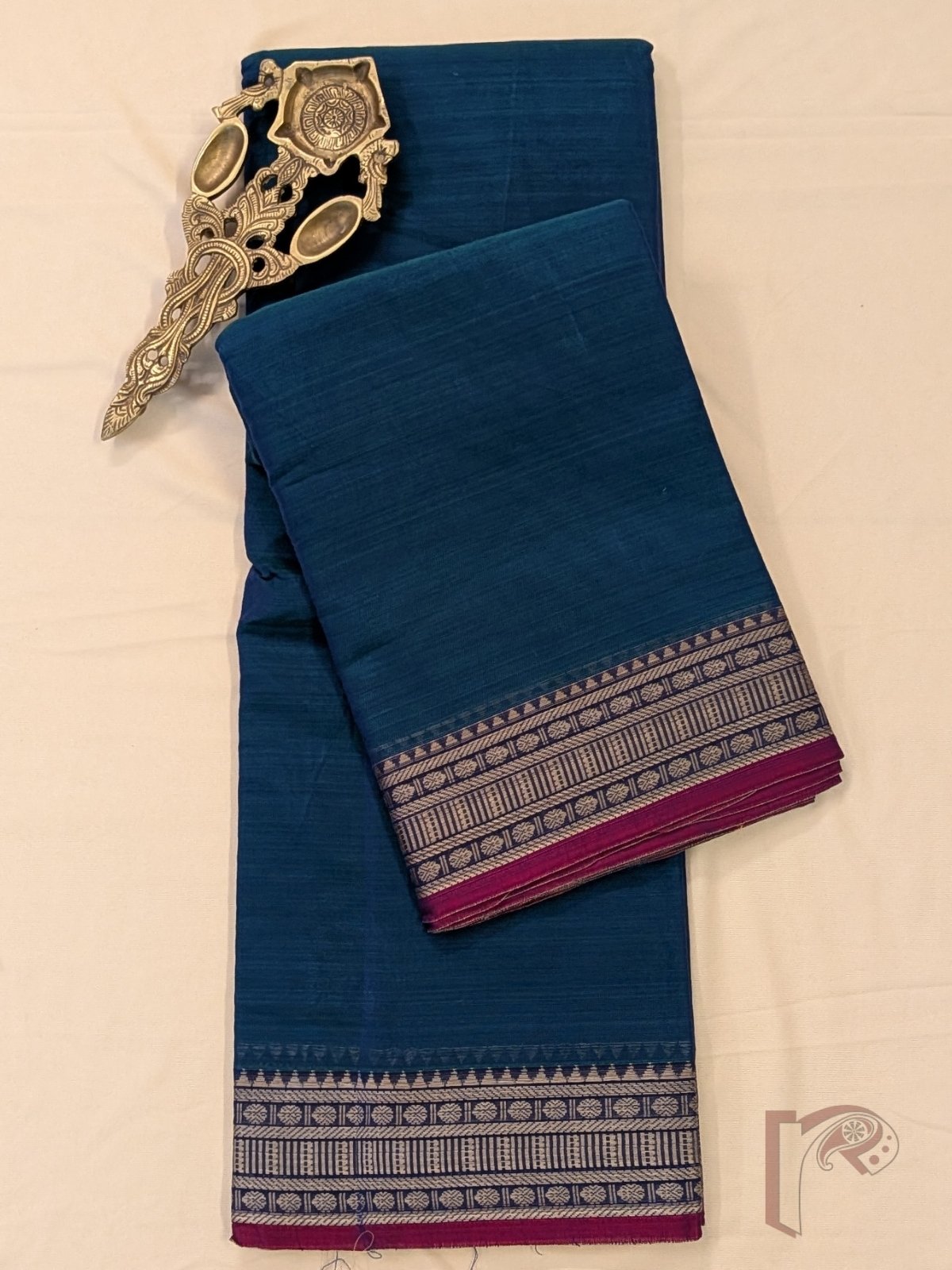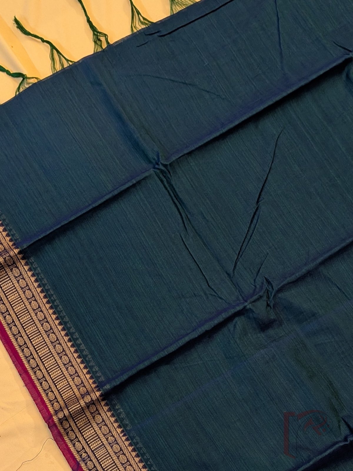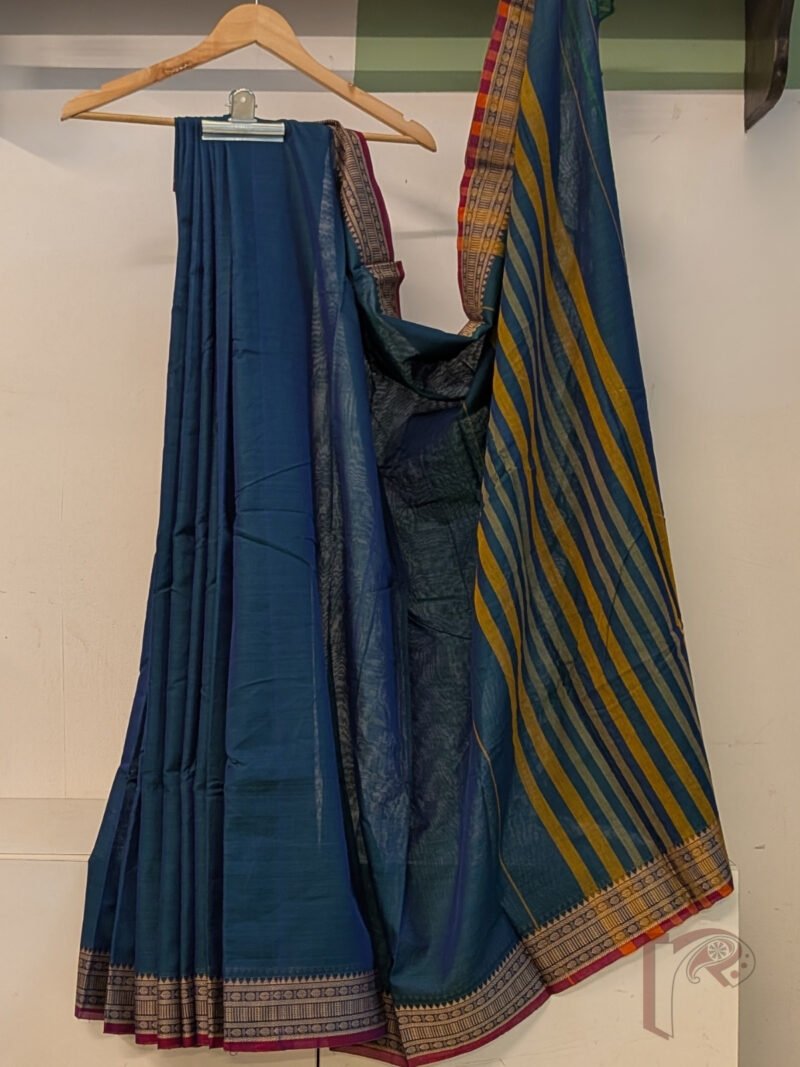 This vibrant saree showcases a peacock blue mercerized cotton body paired with a 3-inch traditional thread border featuring temple-inspired patterns and a magenta pink selvage. The pallu is highlighted with thin and thick stripes in orange and light green, creating a lively and festive appeal. The mercerized cotton fabric adds a smooth finish, soft sheen, and breathable comfort, making it perfect for long wear. Comes with a running blouse for easy styling.