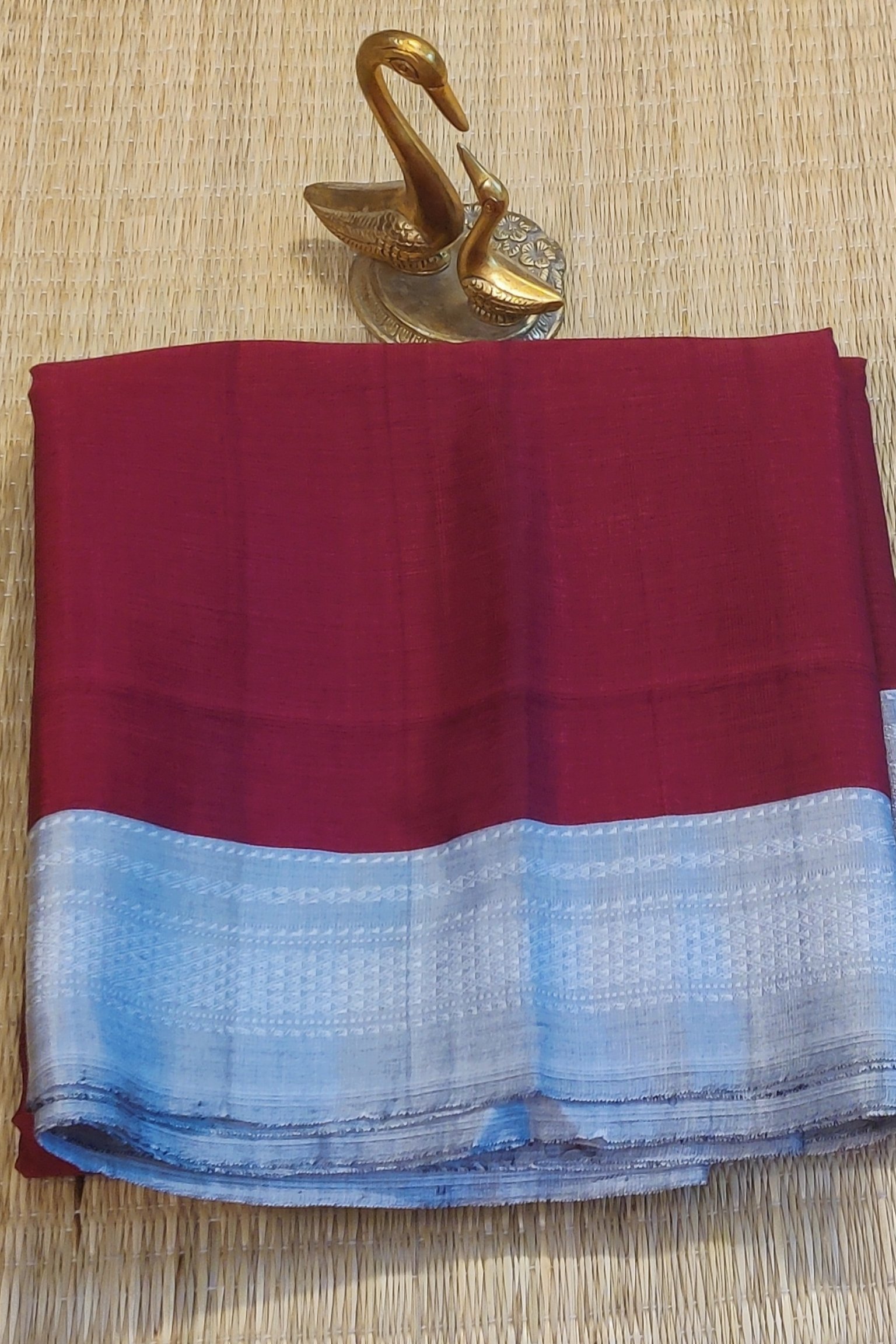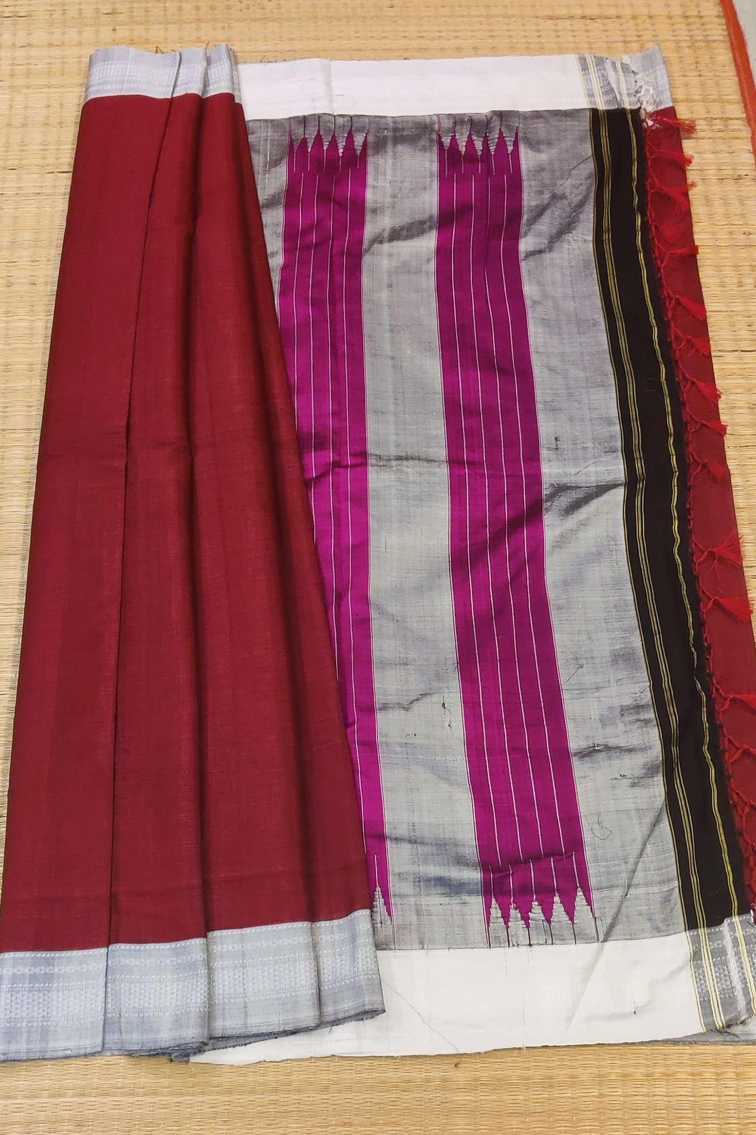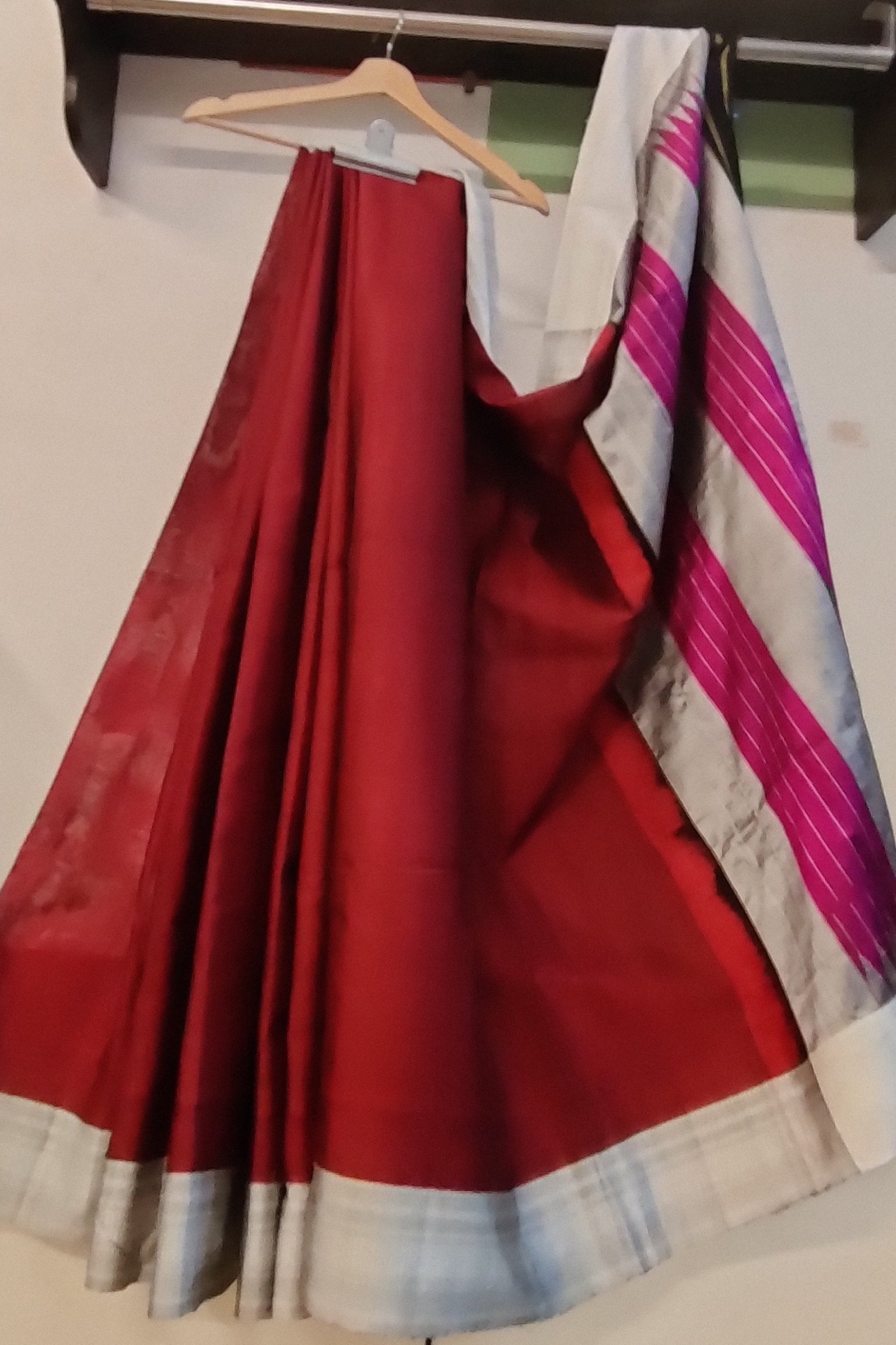 Ilkal sarees are available in a range of vibrant colors, including pomegranate red, peacock green, and parrot green. The saree’s borders are broad, typically ranging from 4 to 6 inches, and are woven with traditional designs like Gomi, Paraspet, and Gaadi, while the body features patterns of stripes, rectangles, and squares.