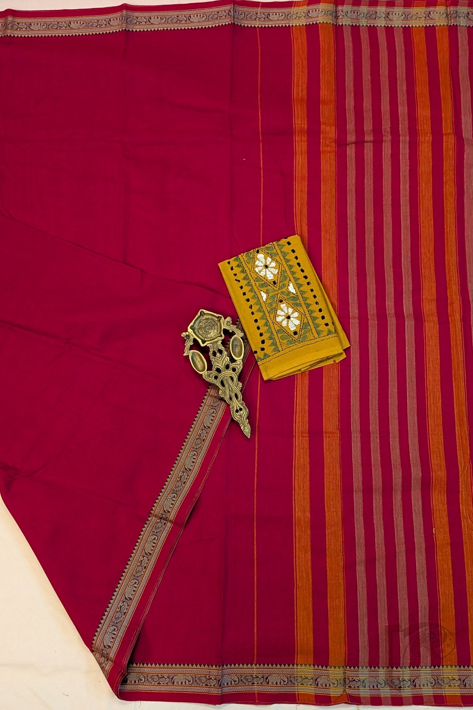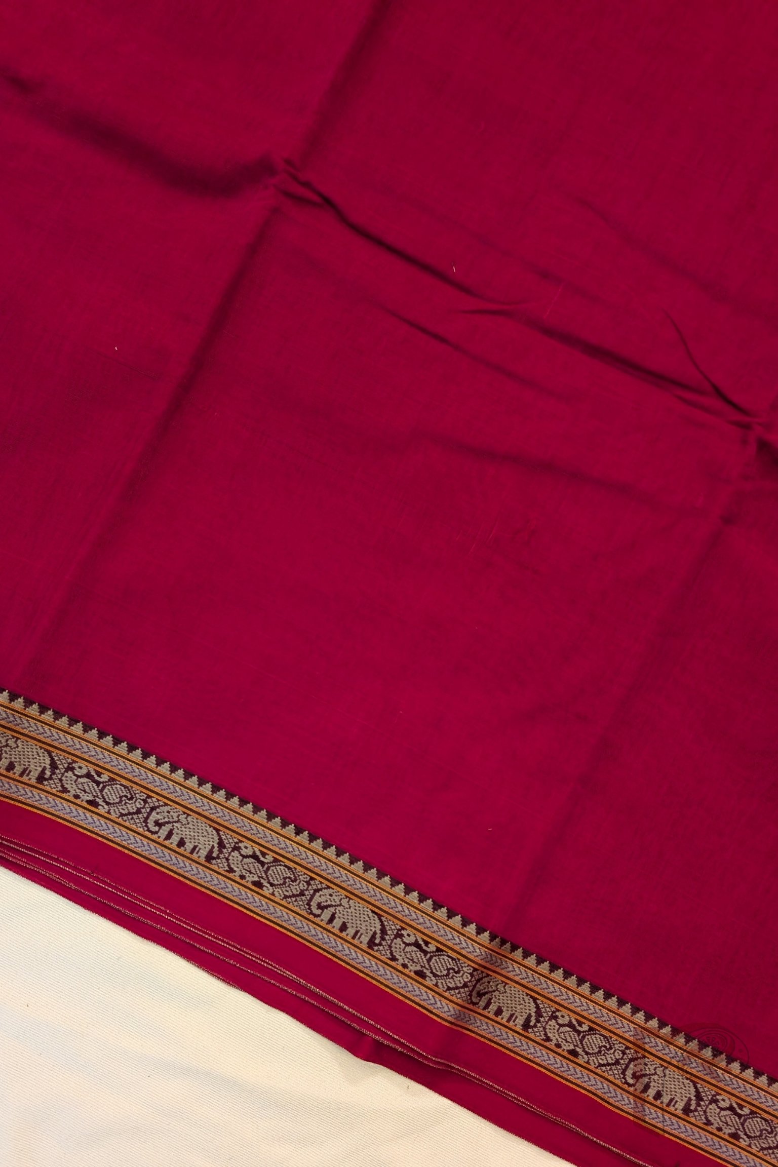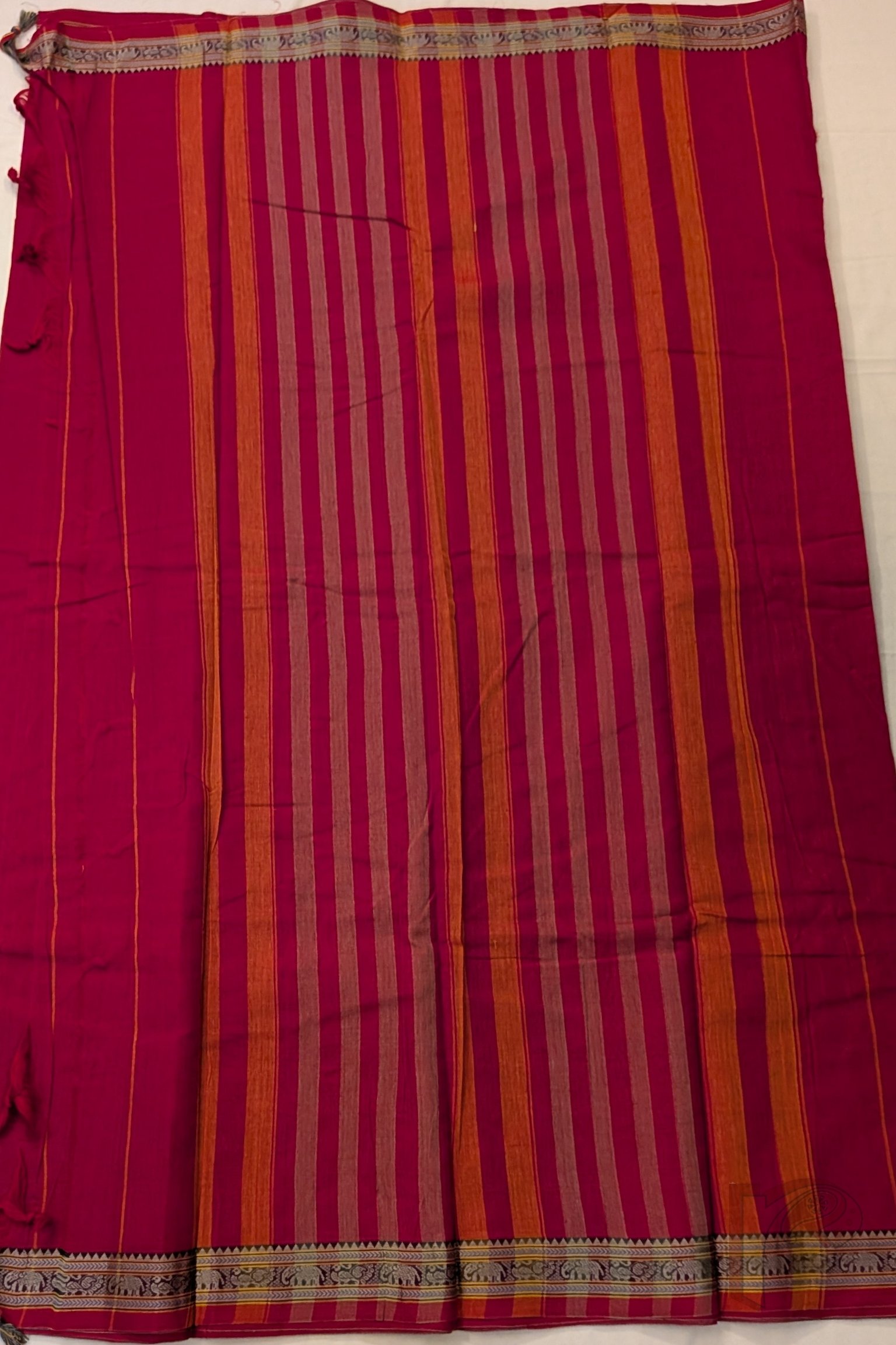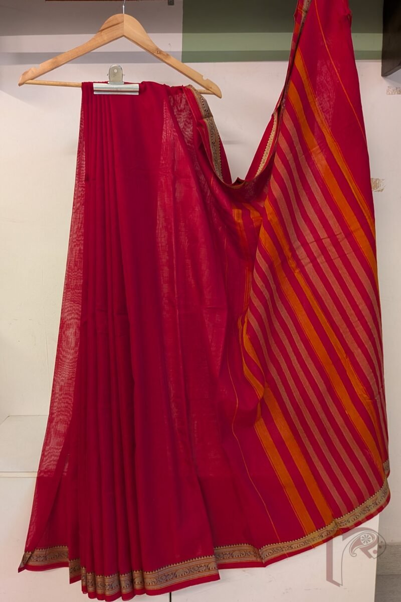 Fresh and lively, this tomato pink mercerized cotton Ilkal saree features a plain body with a classic 2-inch border, keeping the design clean and elegant. The matching pallu is enhanced with thin and thick orange and off white stripes, adding energy and contrast to the vibrant pink tone. Lightweight and breathable, this saree ensures day-long comfort with a refined handloom finish, paired with a running blouse for ease of styling.