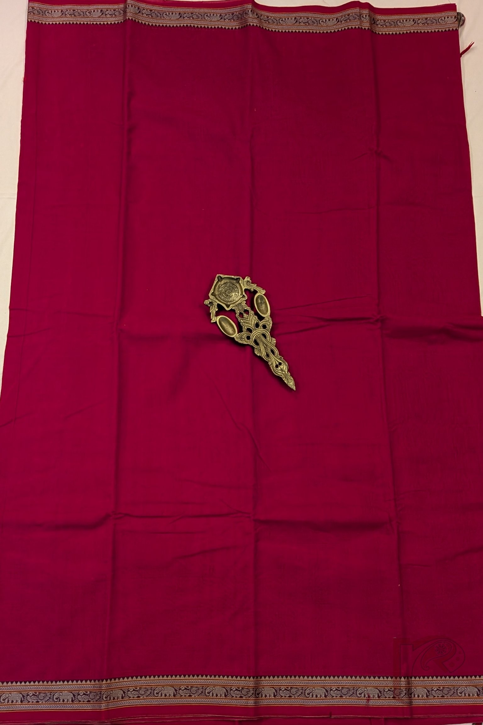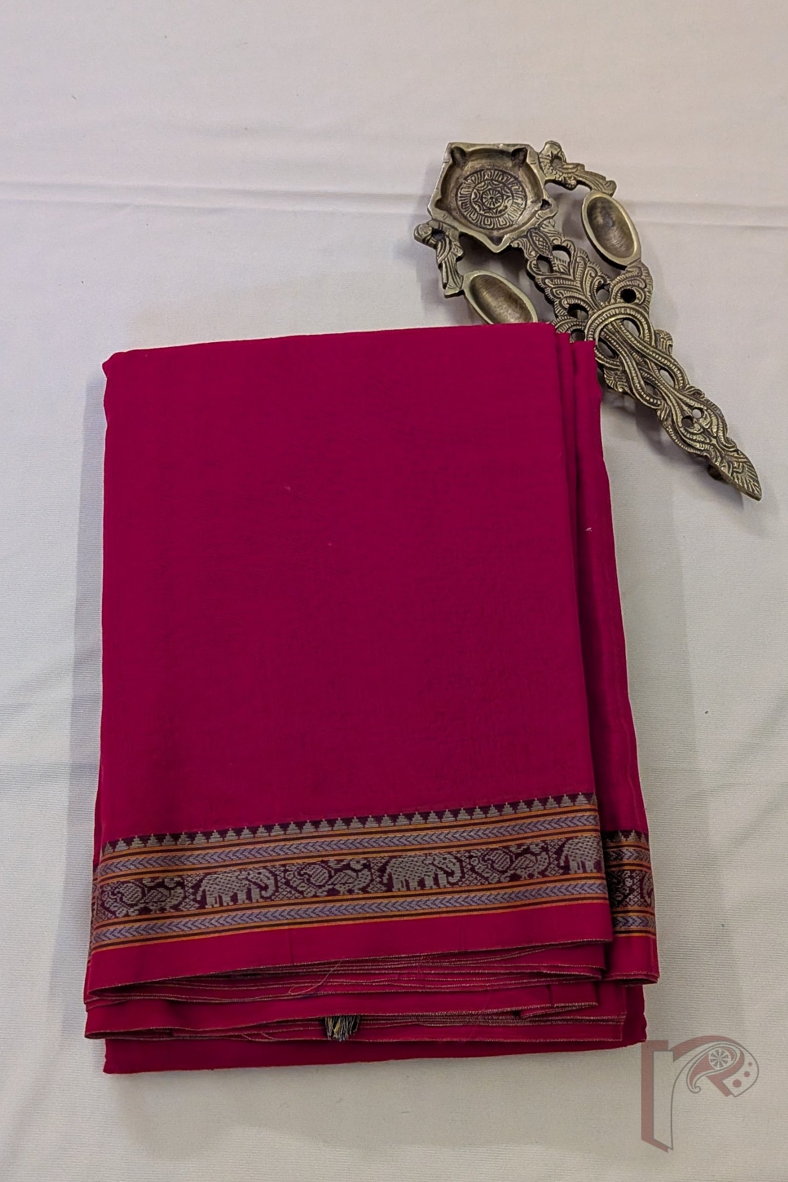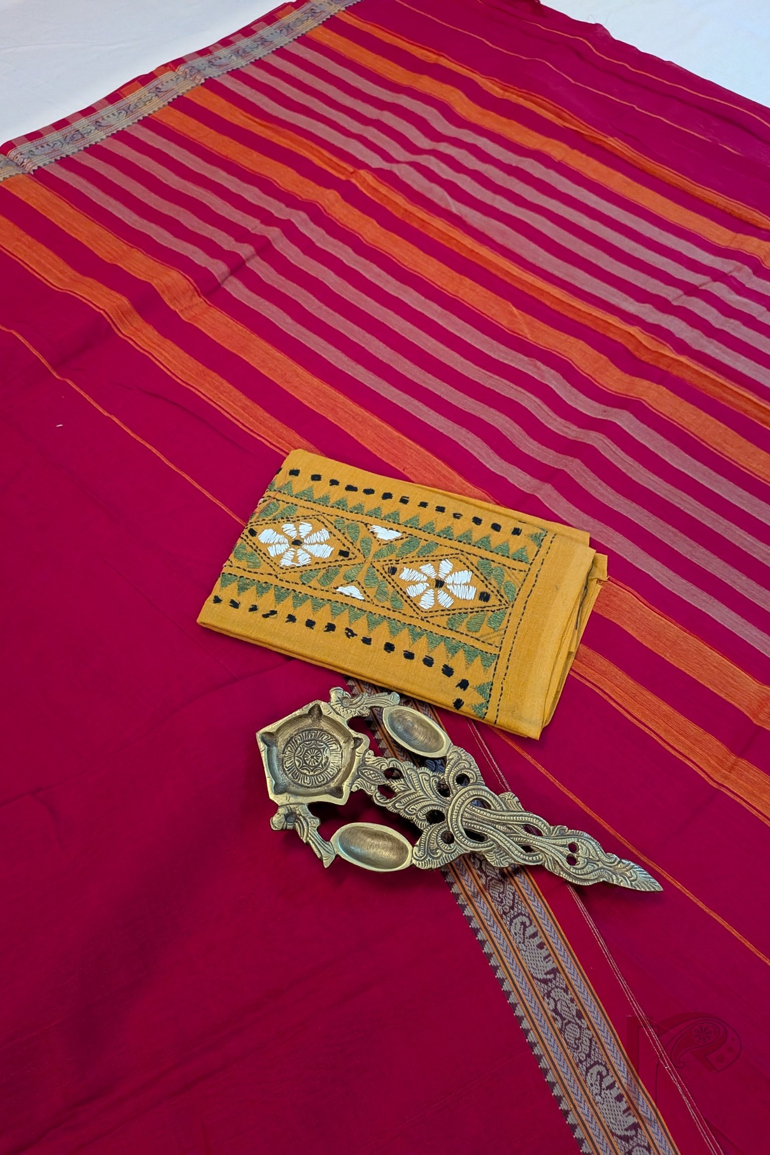 Fresh and lively, this tomato pink mercerized cotton Ilkal saree features a plain body with a classic 2-inch border, keeping the design clean and elegant. The matching pallu is enhanced with thin and thick orange and off white stripes, adding energy and contrast to the vibrant pink tone. Lightweight and breathable, this saree ensures day-long comfort with a refined handloom finish, paired with a running blouse for ease of styling.