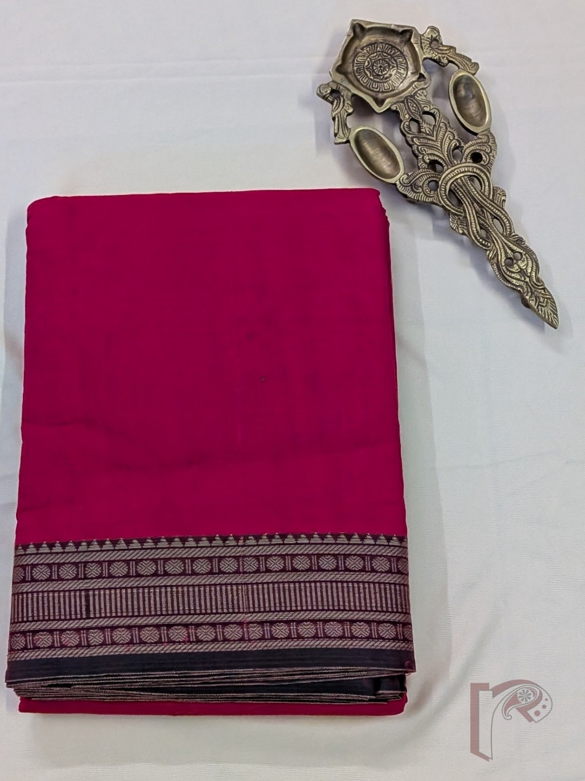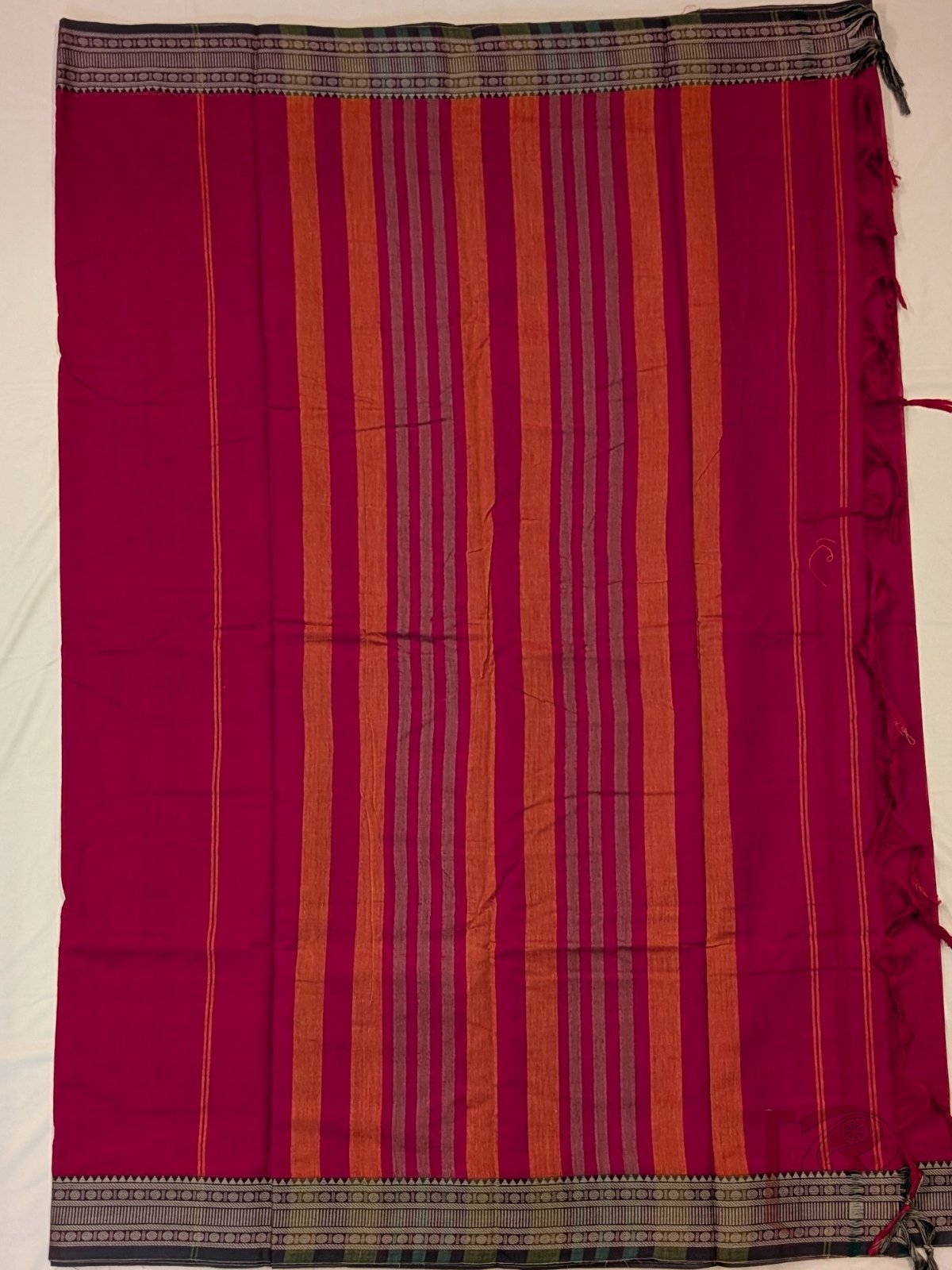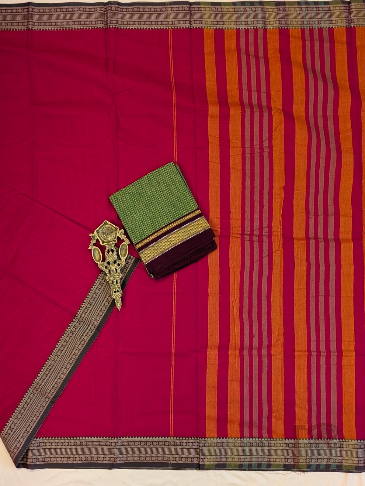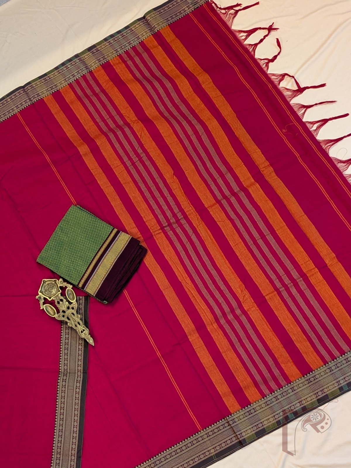 Bold and lively, this saree features a tomato red mercerized cotton body paired with a 3-inch border adorned with traditional motifs and a light green selvage. The pallu carries thin and thick orange and light green stripes, adding vibrance and dynamic movement to the saree. Crafted from high-quality mercerized cotton, it offers a soft sheen, breathable comfort, and structured drape. Completed with a running blouse, it is a perfect choice for festive and cultural occasions.