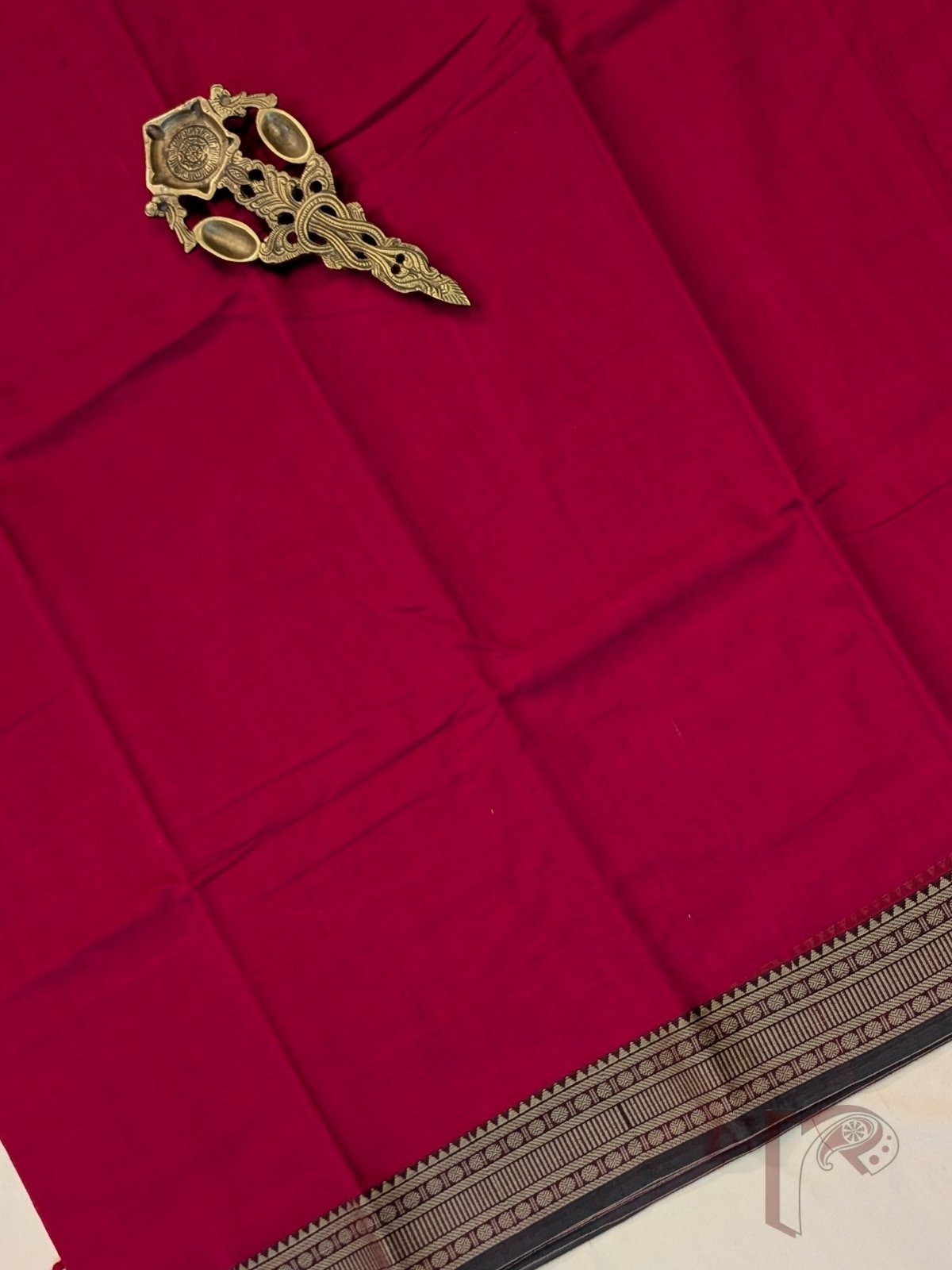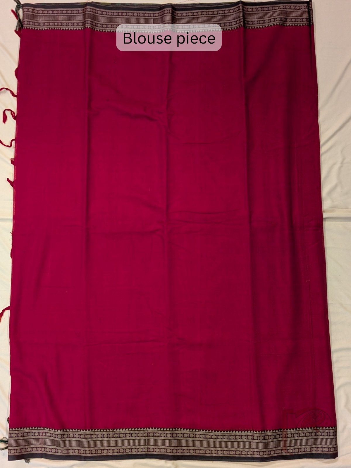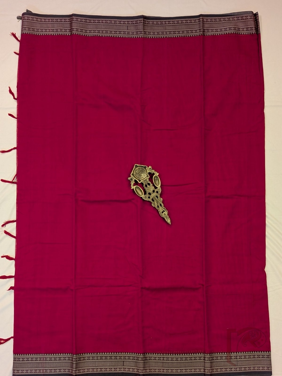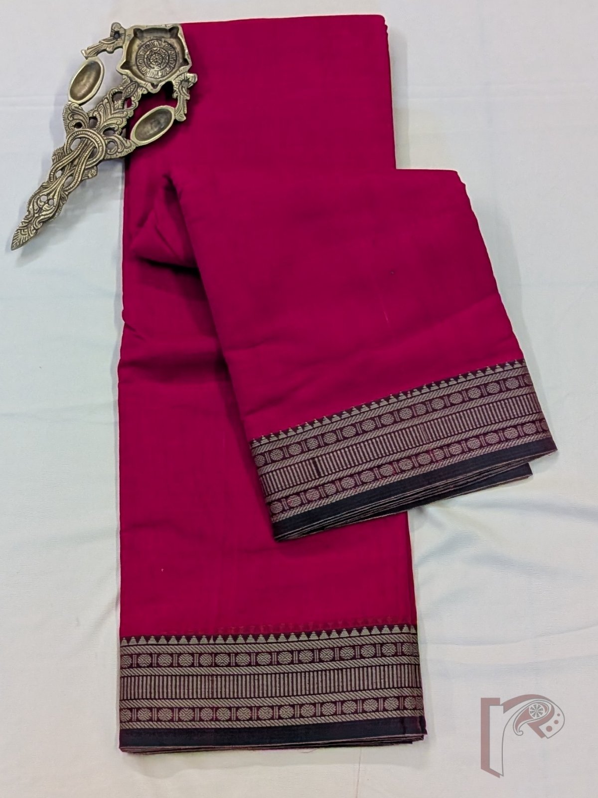 Bold and lively, this saree features a tomato red mercerized cotton body paired with a 3-inch border adorned with traditional motifs and a light green selvage. The pallu carries thin and thick orange and light green stripes, adding vibrance and dynamic movement to the saree. Crafted from high-quality mercerized cotton, it offers a soft sheen, breathable comfort, and structured drape. Completed with a running blouse, it is a perfect choice for festive and cultural occasions.
