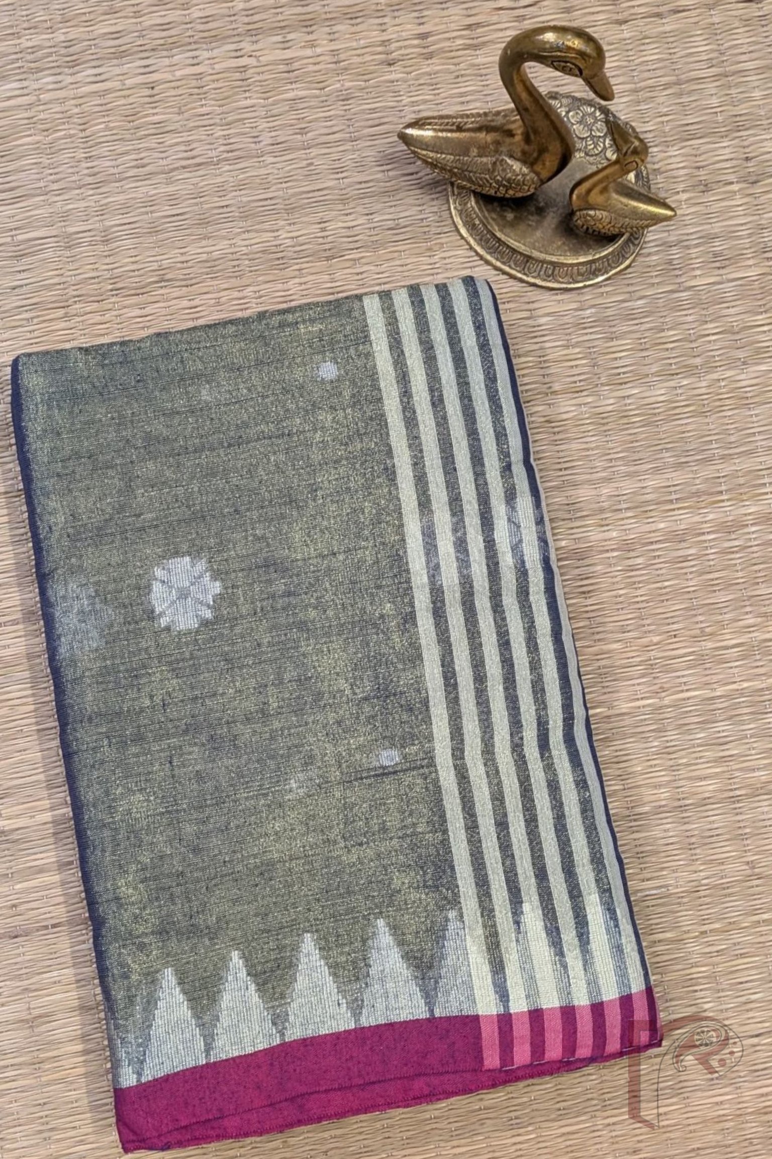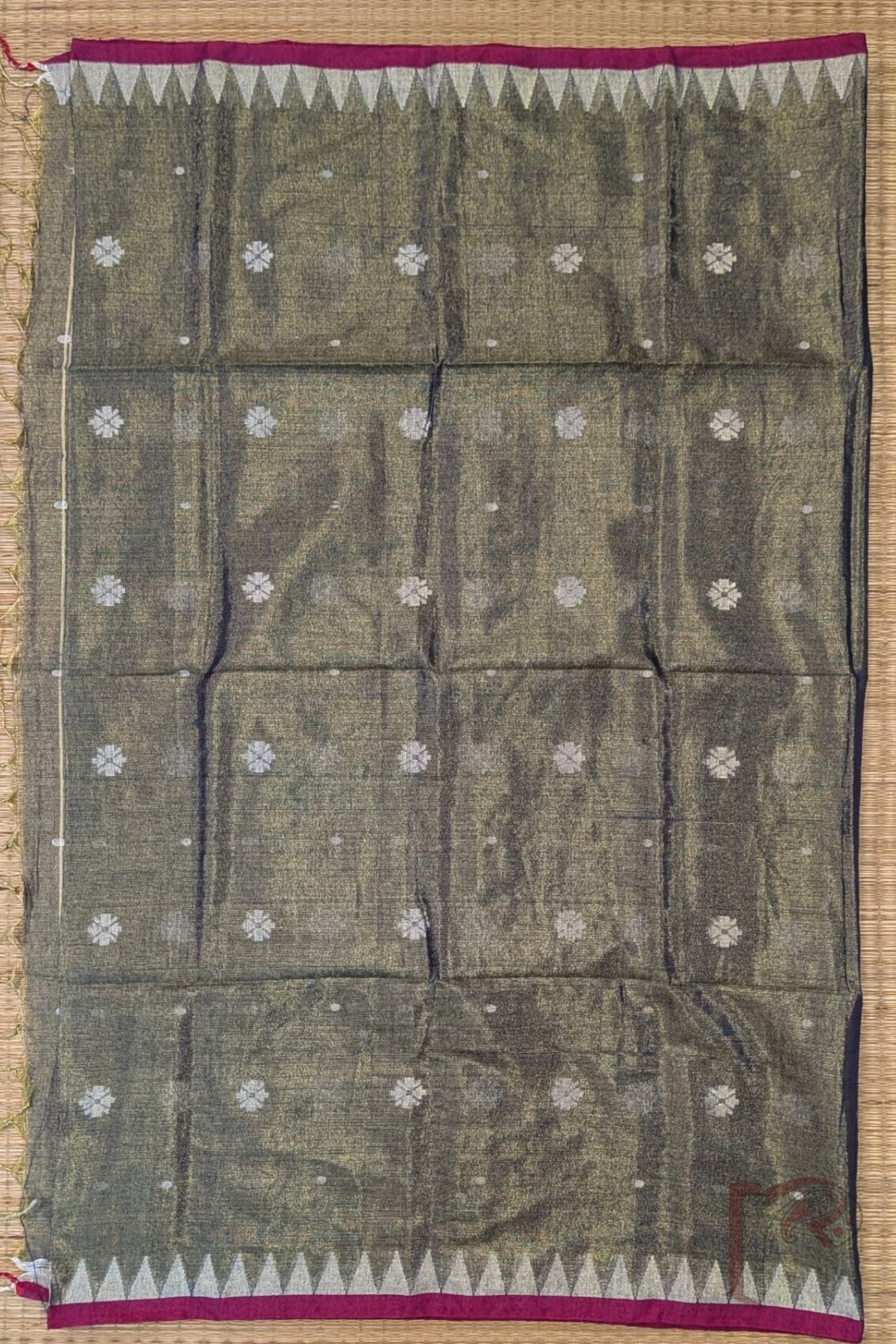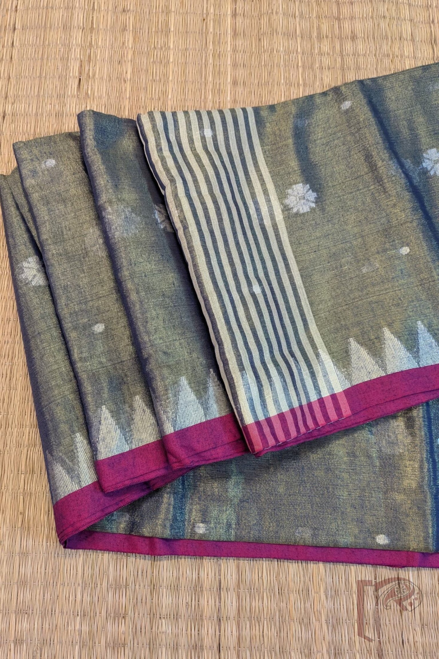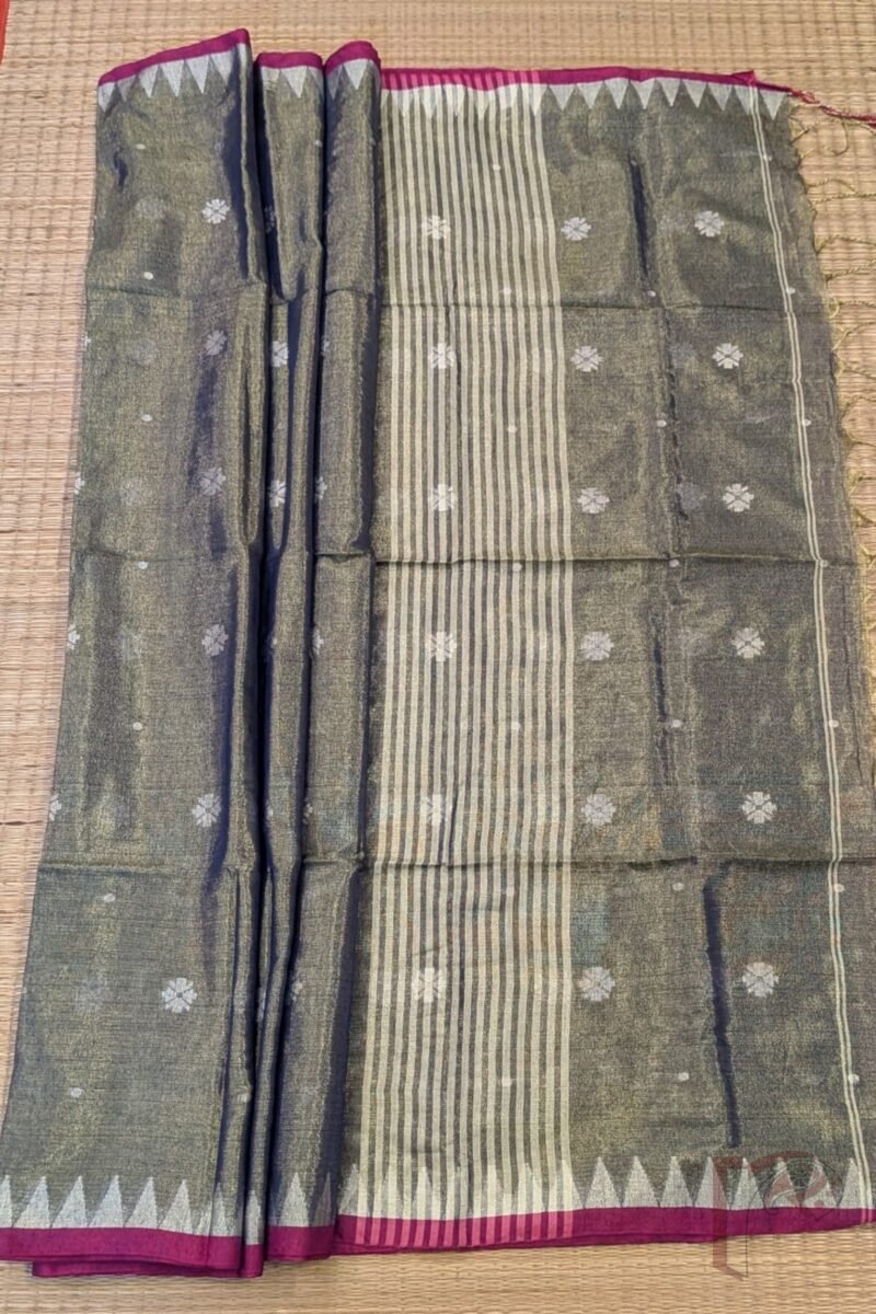Refreshing and graceful, this saree comes in a bluish green hue with a striking pink 1-inch border. The temple motifs woven in off-white enhance its traditional appeal, while the body is adorned with floral and polka Jamdani designs that shimmer on the khadi tissue base. The striped off-white pallu completes the look with subtle elegance. Lightweight and easy to drape, this saree is perfect for women who appreciate heritage weaving techniques blended with contemporary shades.