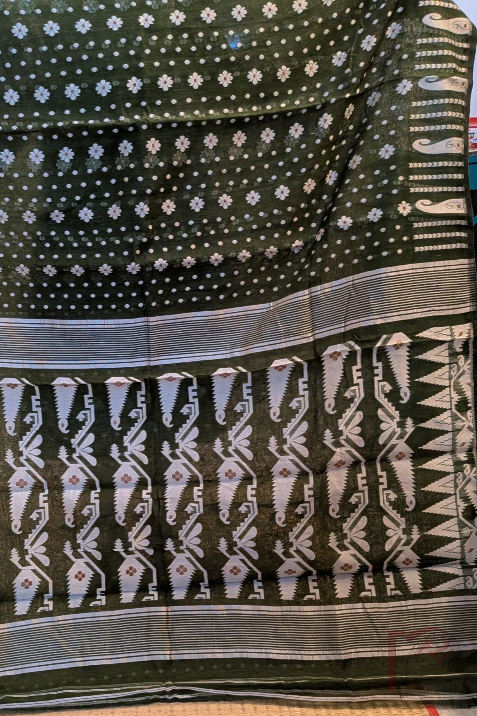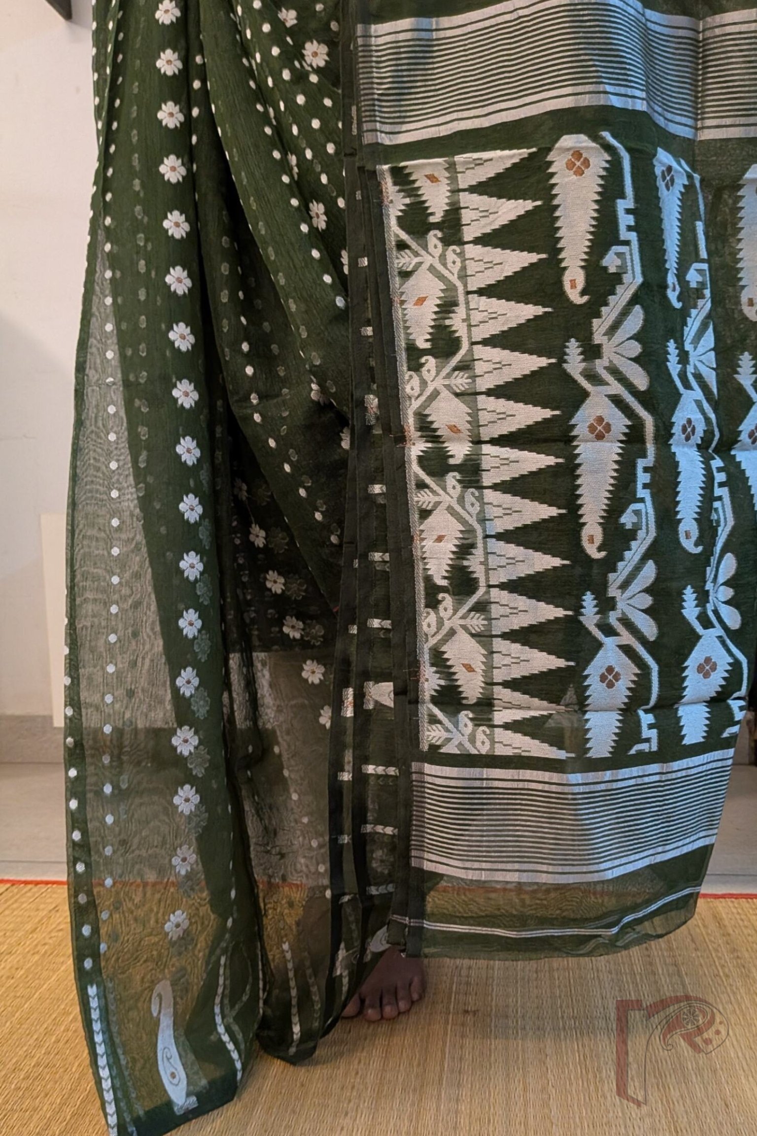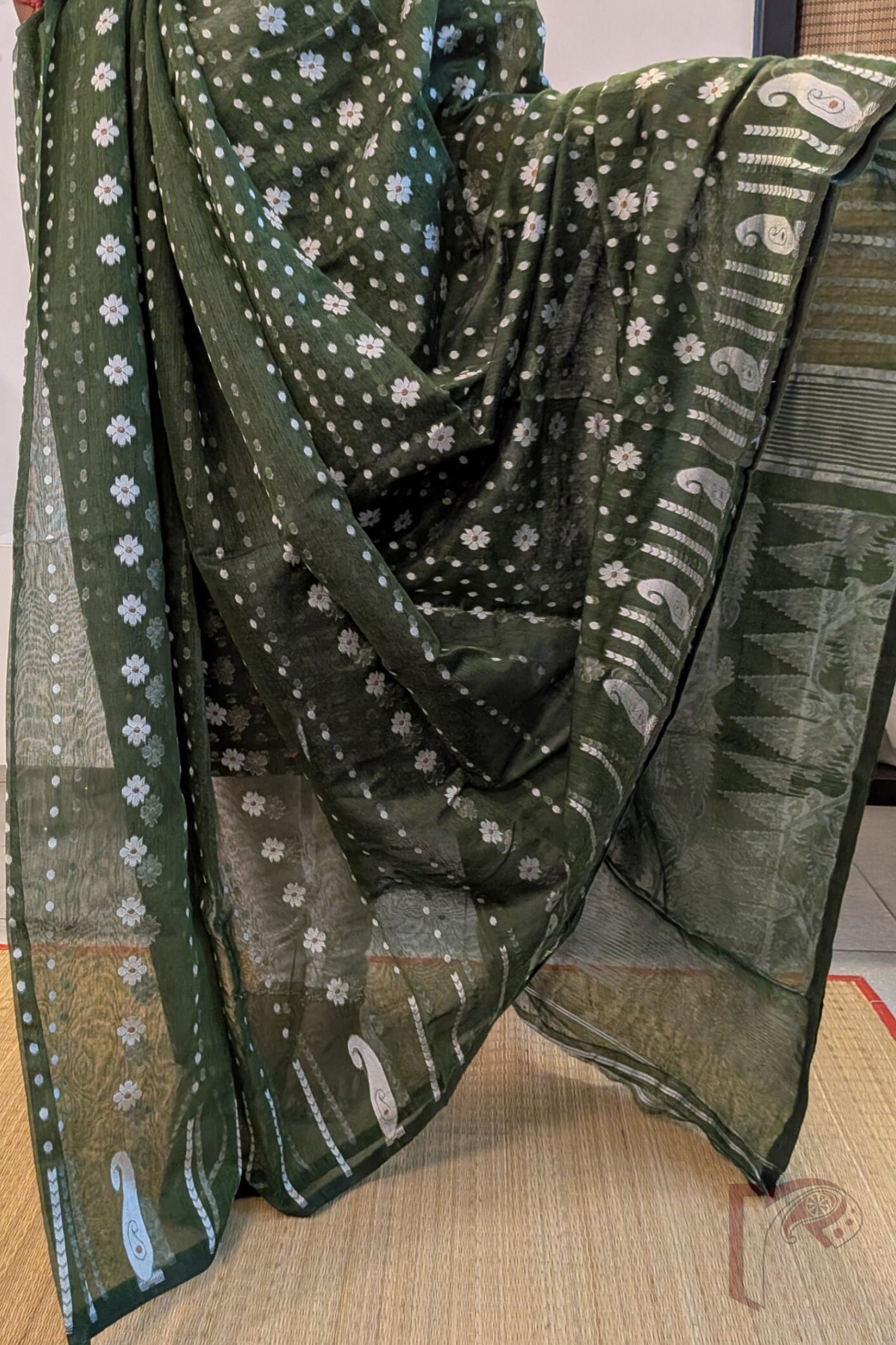 Jamdani Joy – Dark Green Jamdani Saree with White Polka Dots, Floral Body and Off White Mango Border