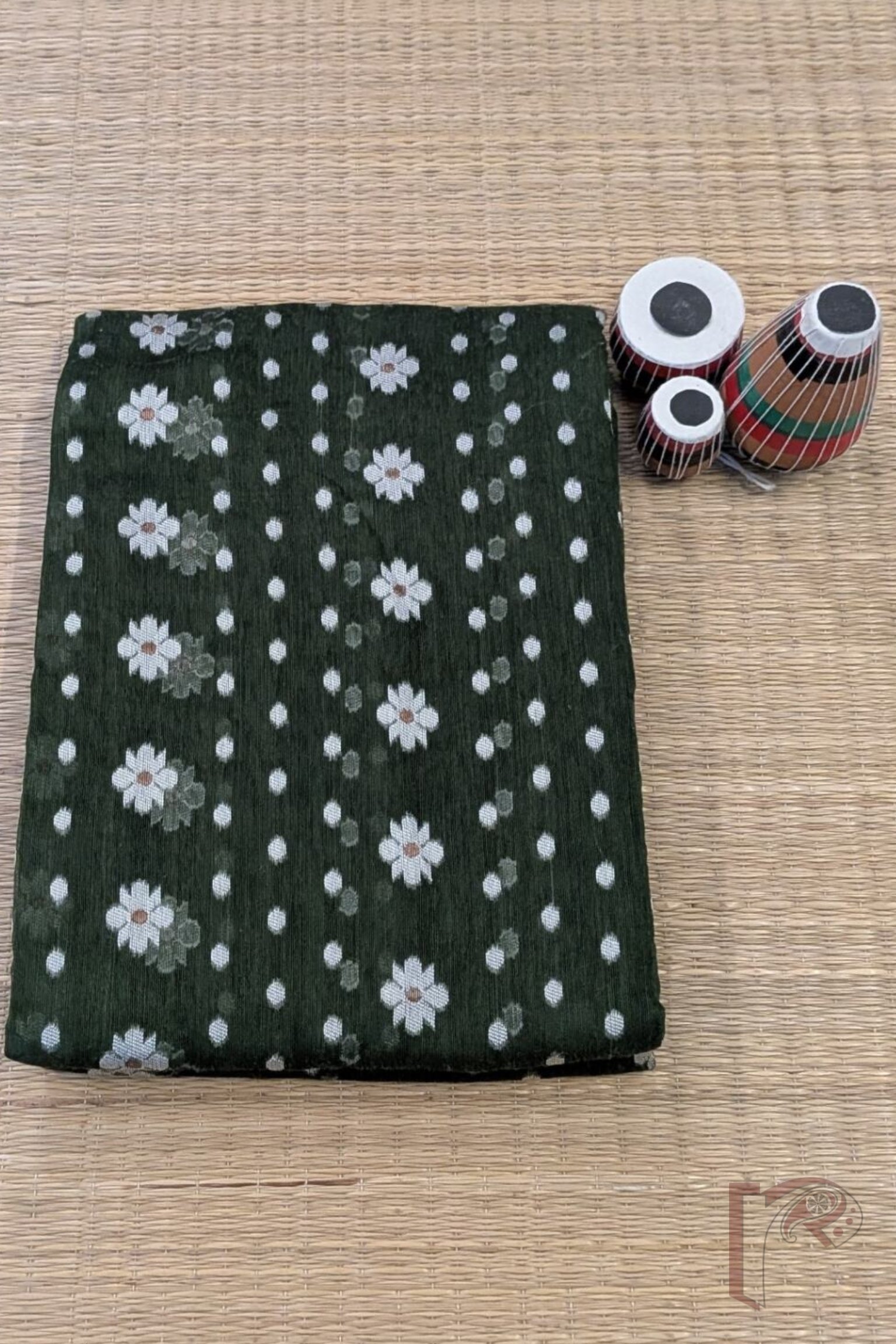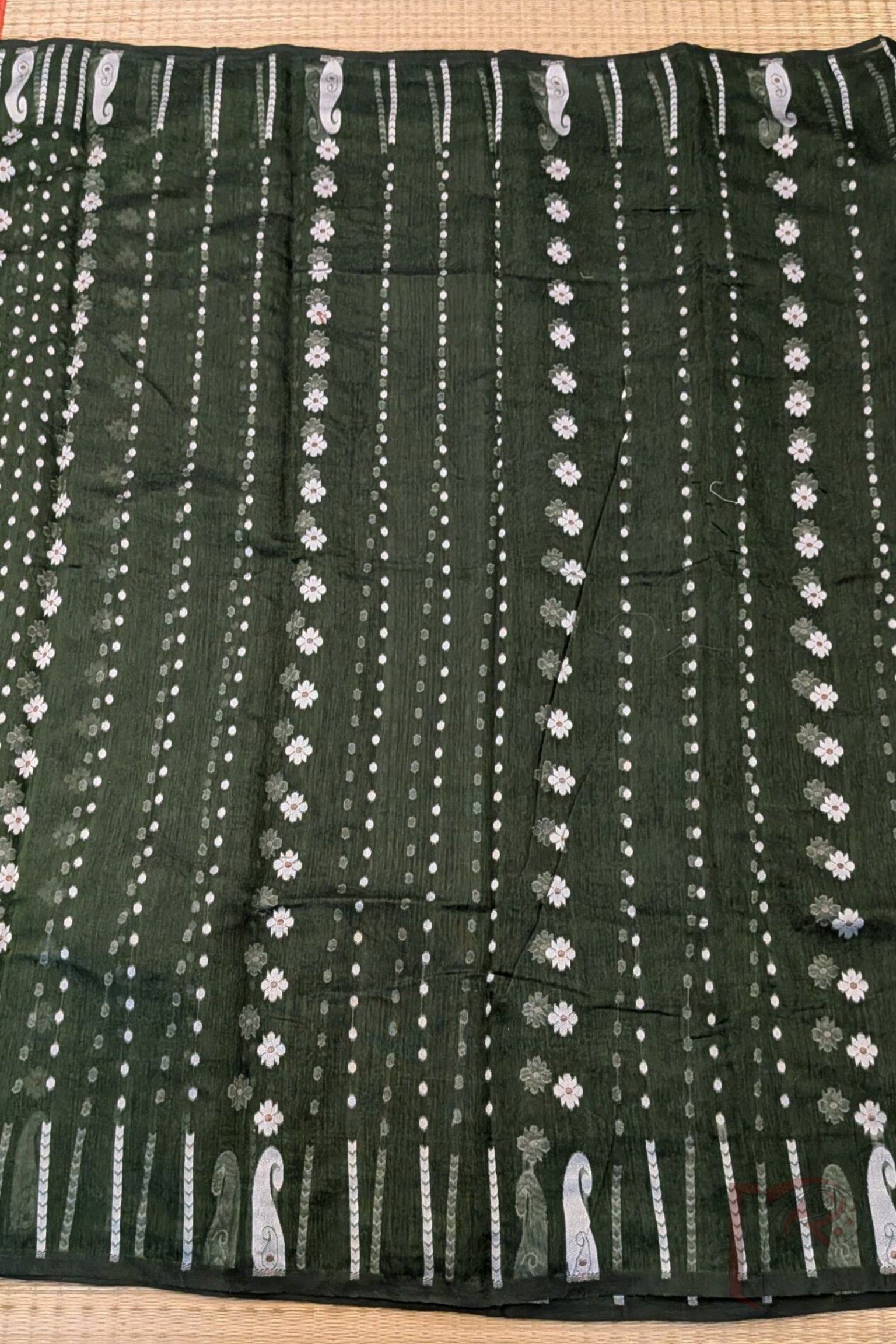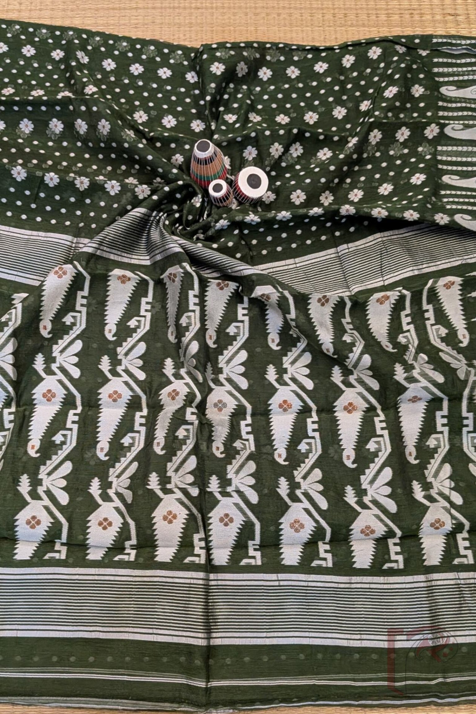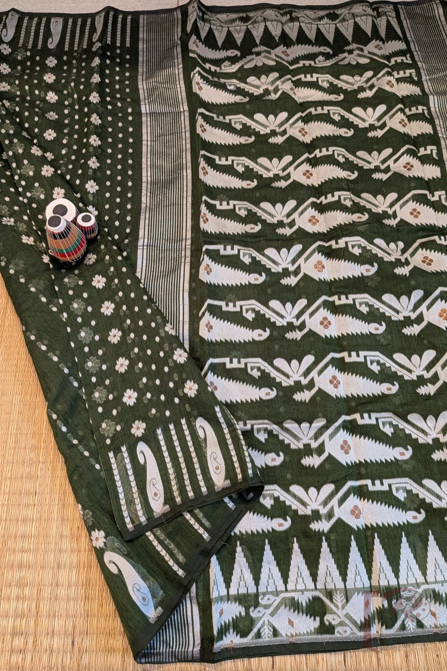 Jamdani Joy – Dark Green Jamdani Saree with White Polka Dots, Floral Body and Off White Mango Border