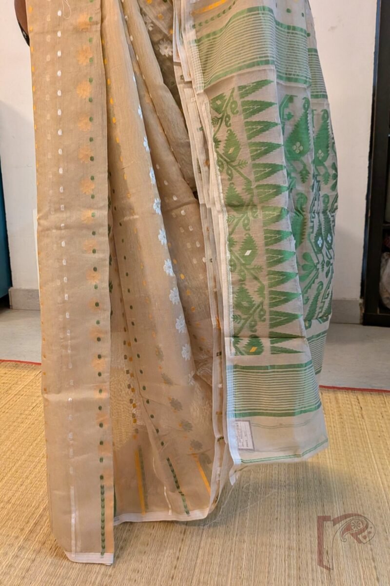 Jamdani Joy – Fawn Cotton Jamdani Saree with Polka Dots, Floral Motifs, Mango Border and Multicolor Leaf Woven Pallu