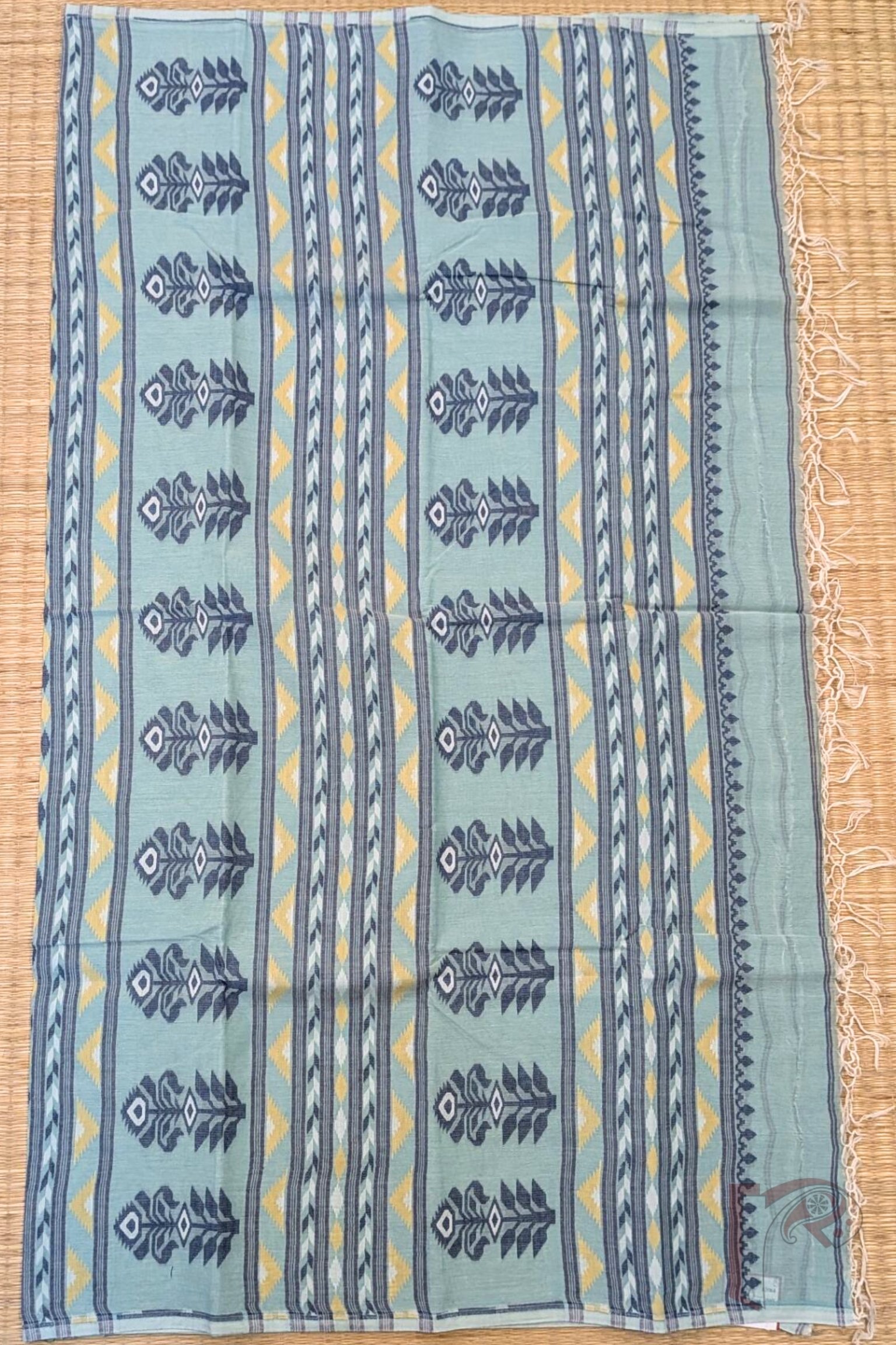 This light pista green Bengal cotton Jamdani saree is a graceful handloom treasure that blends simplicity with elegance. The body is adorned with delicate bootis woven in navy blue, lemon yellow, and off-white threads, creating a soft yet striking contrast against the pastel green base. The saree features a non-traditional border on both sides, crafted with long leaf stem motifs in alternating shades of dark blue and lemon, adding a modern artistic edge to this traditional weave. The lightweight cotton fabric makes it comfortable for long wear, while its intricate motifs highlight the finesse of Bengal weaving. Perfect for casual gatherings, daytime festivities, or cultural occasions, this saree celebrates the timeless charm of Jamdani with a refreshing contemporary twist. Please note, this saree does not include a blouse piece, allowing you to pair it creatively with contrasting blouses for a versatile look.