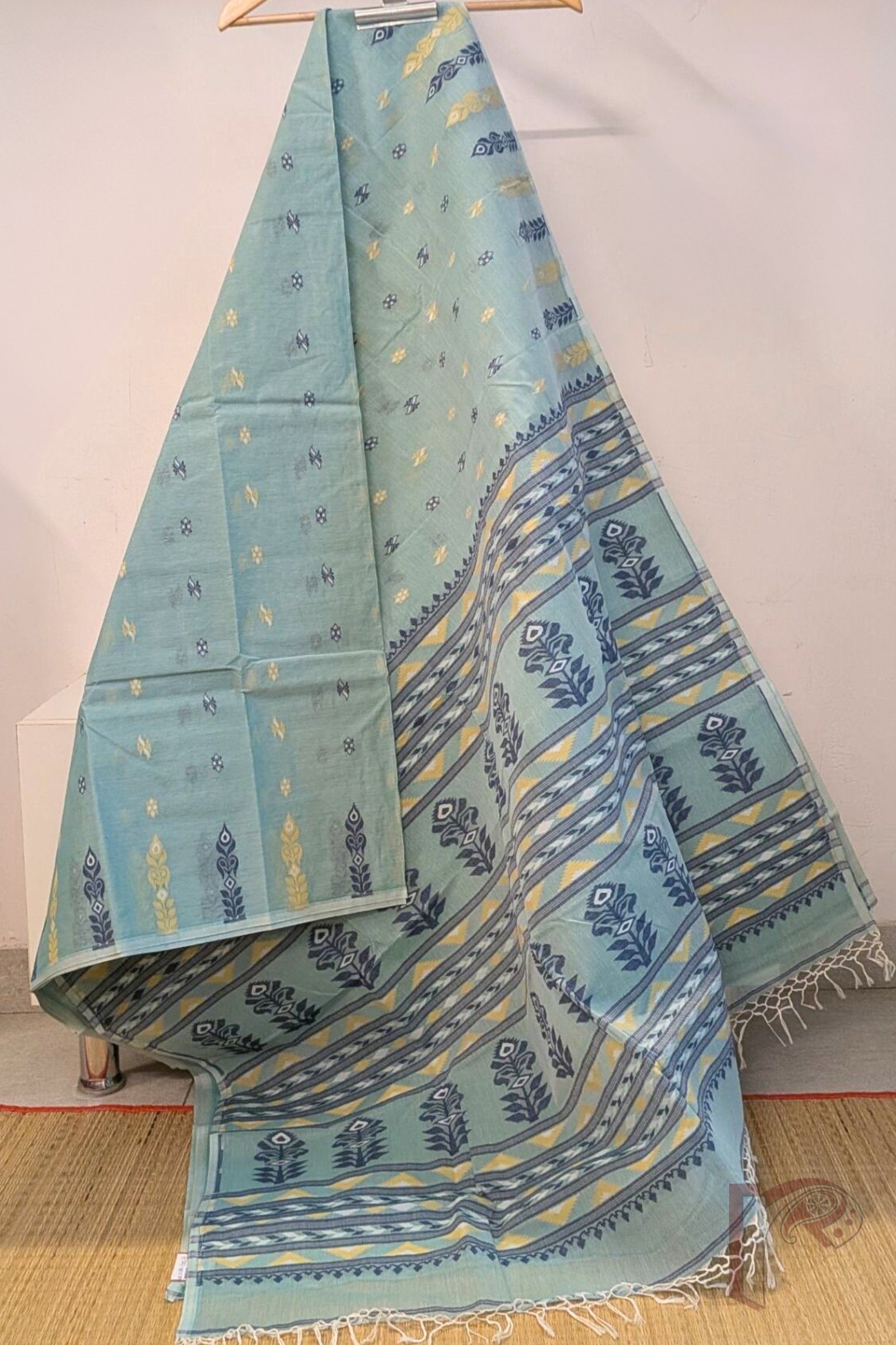 Jamdani Joy – Light Pista Green Bengal Cotton Jamdani Saree with Leaf Stem Border