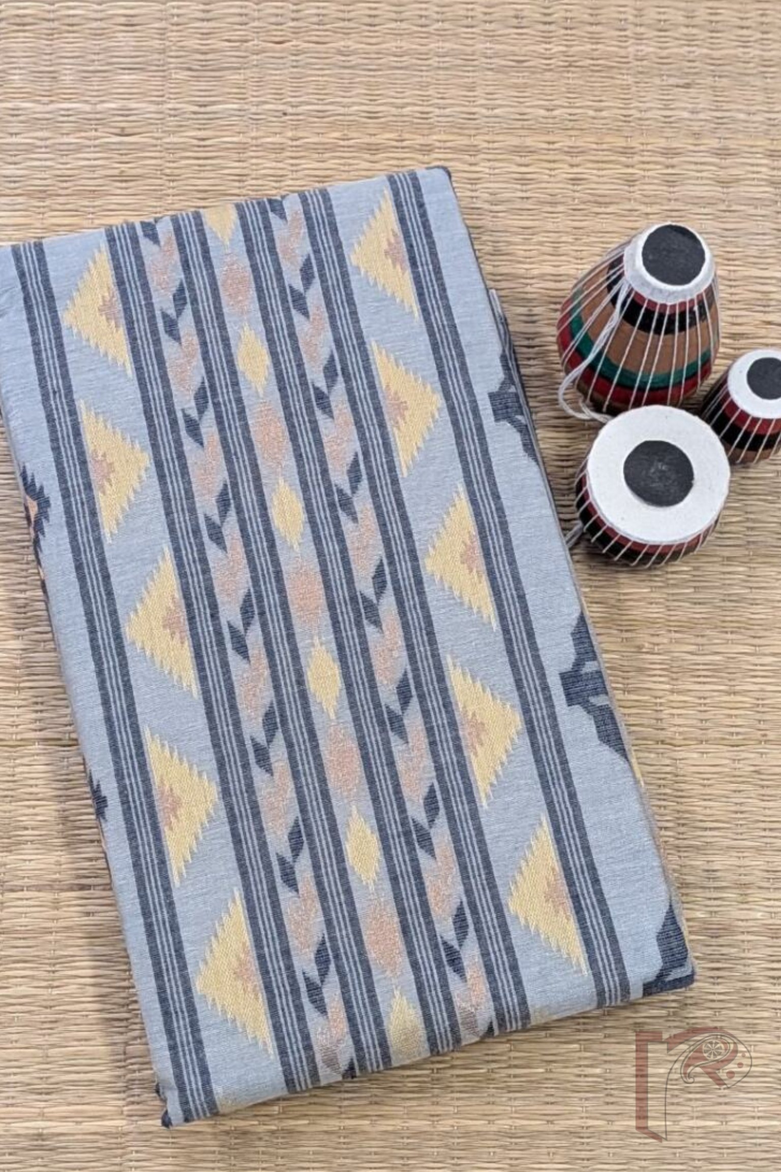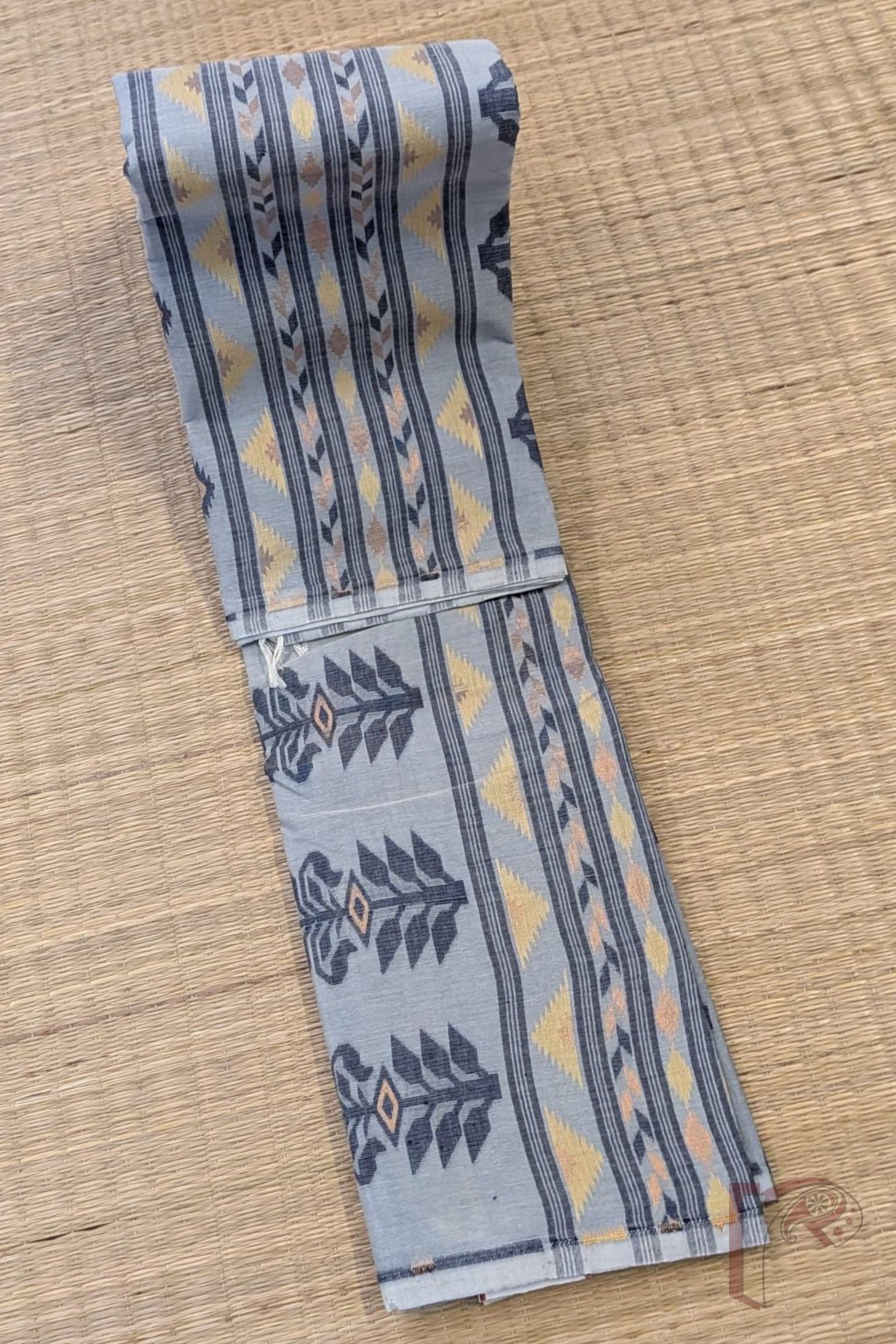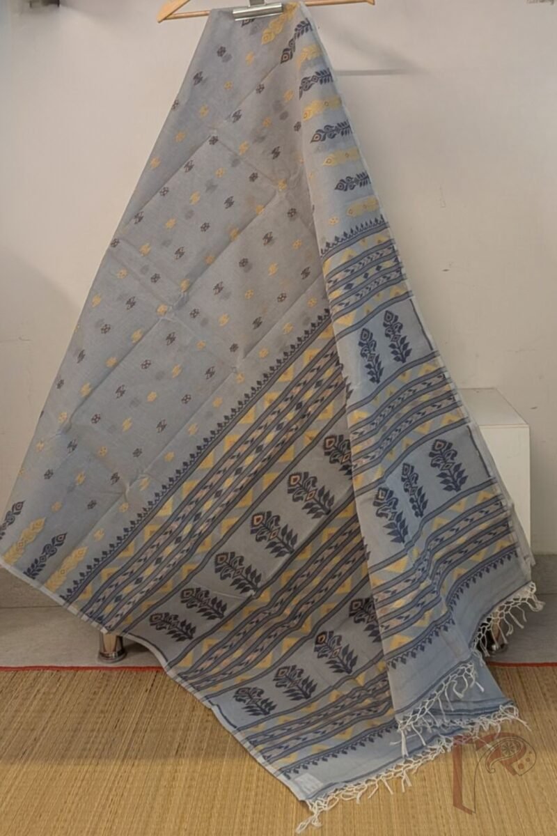 Jamdani Joy – Light Grey Bengal Cotton Jamdani Saree with Black and Yellow Booti Weave and Leaf Stem Border