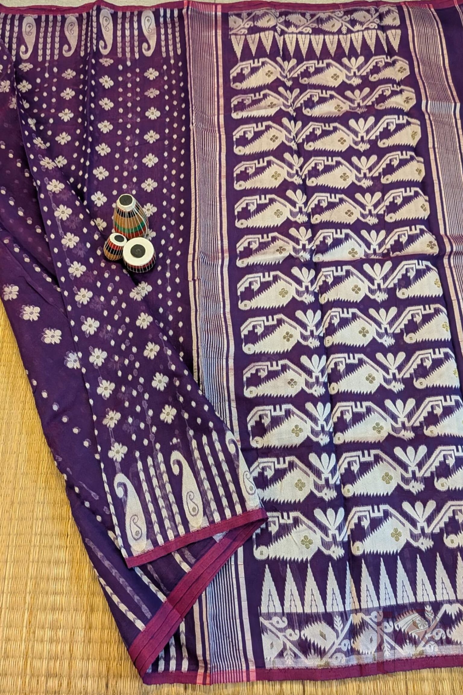 This Purple Jamdani Saree is a masterpiece of traditional weaving, combining elegance with intricate artistry. The body is beautifully decorated with off white polka dots and delicate floral motifs, lending a graceful charm to the drape. Its border stands out with mango motifs and vertical off white lines, giving it a distinctive character compared to conventional Jamdani sarees. The highlight of the design is its richly woven pallu, adorned with striking leaf motifs in off white and shimmering gold threads, creating a regal finish. Lightweight and breathable, this saree is perfect for festive occasions, cultural gatherings, or elegant celebrations, where comfort meets timeless sophistication.