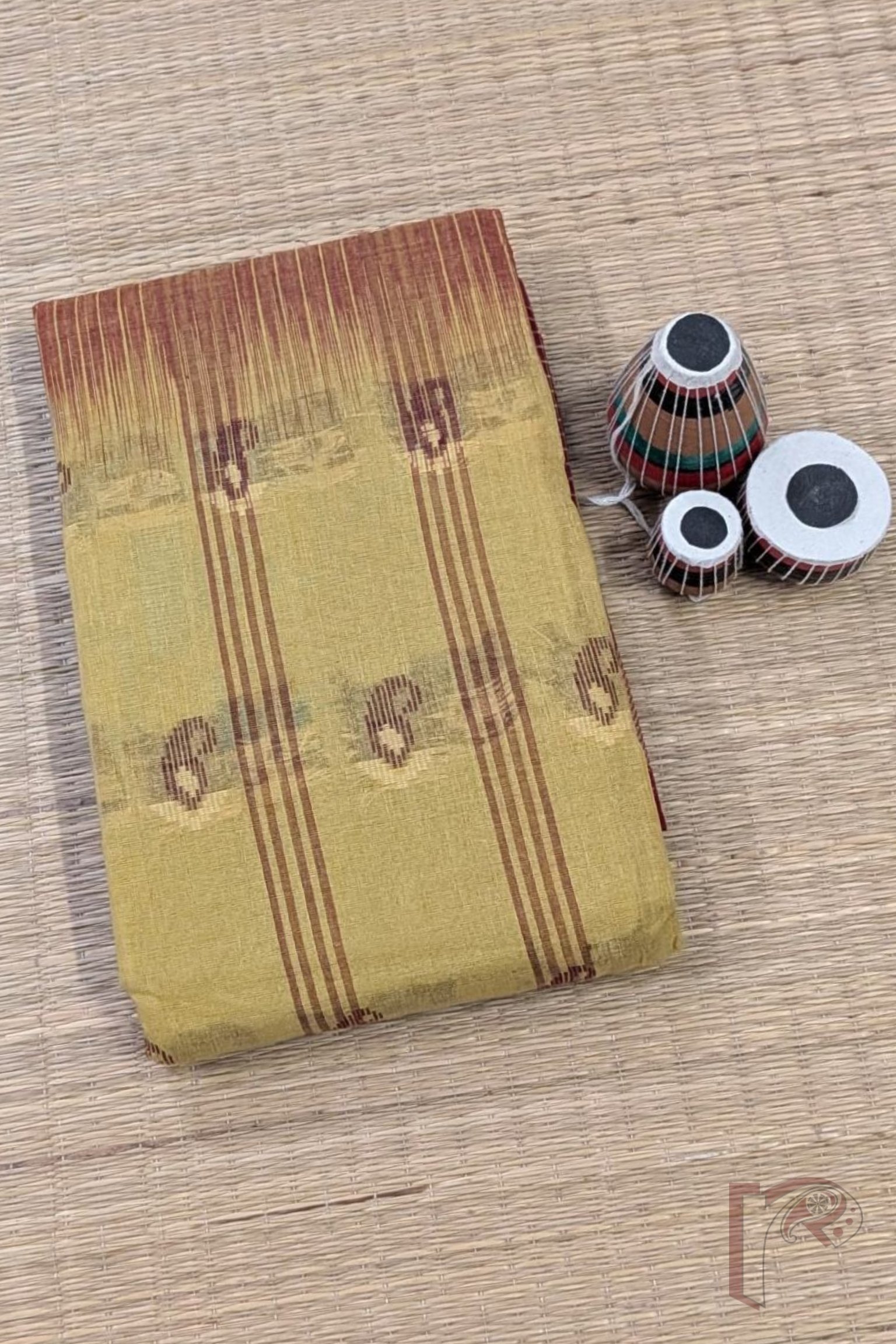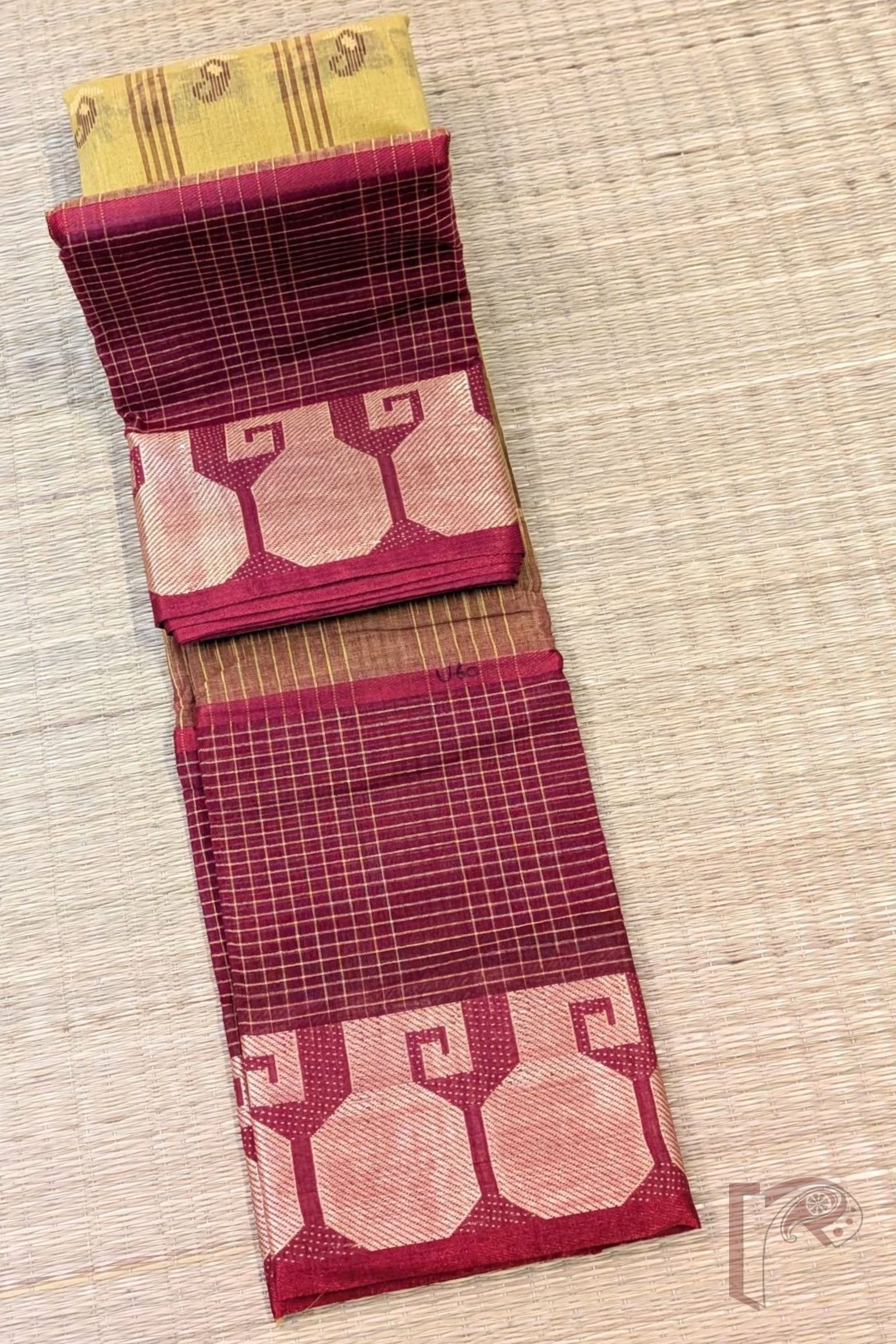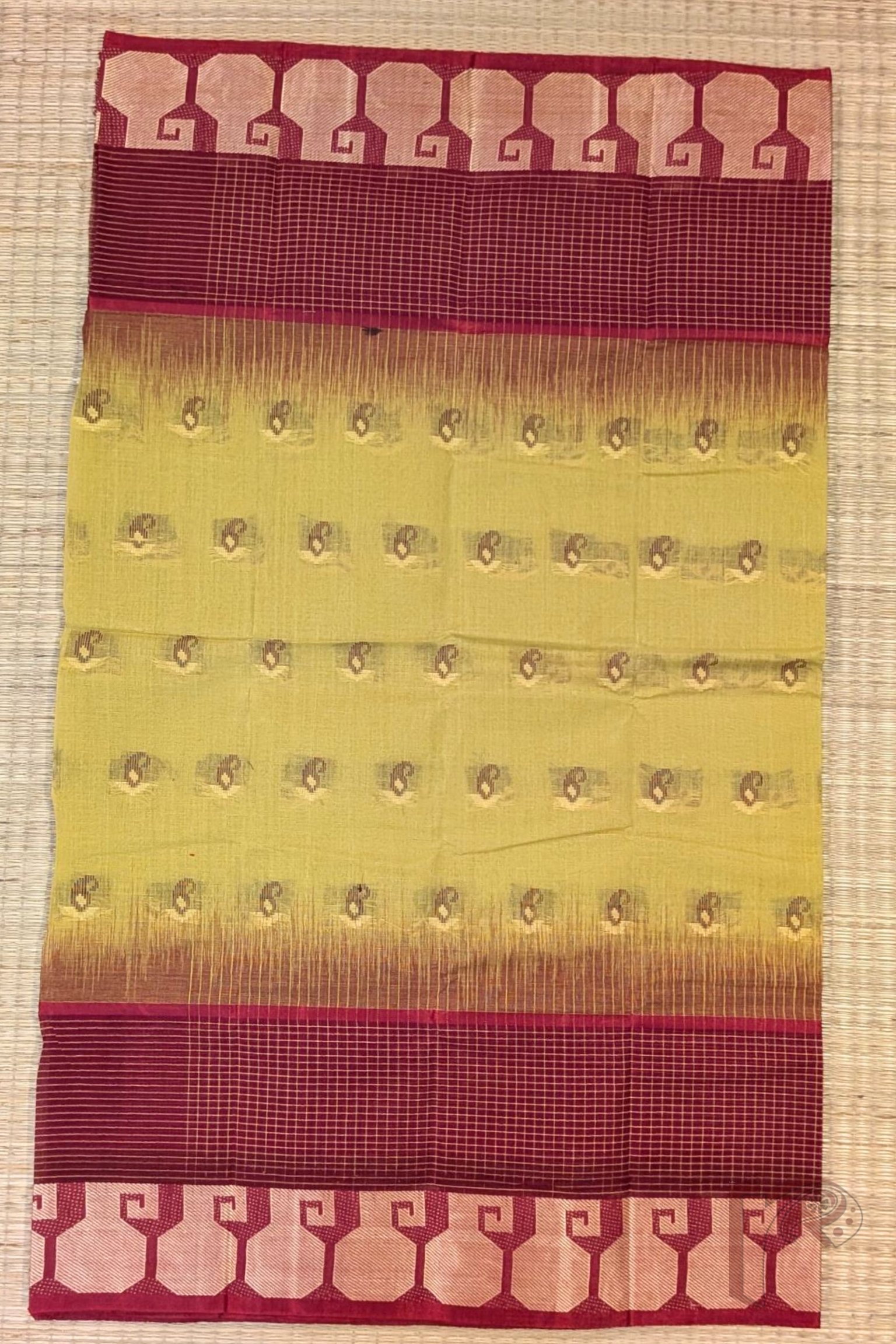 Jamdani Joy – Mustard Yellow Bengal Cotton Jamdani Saree with Maroon Checks Border and Cary Weaves