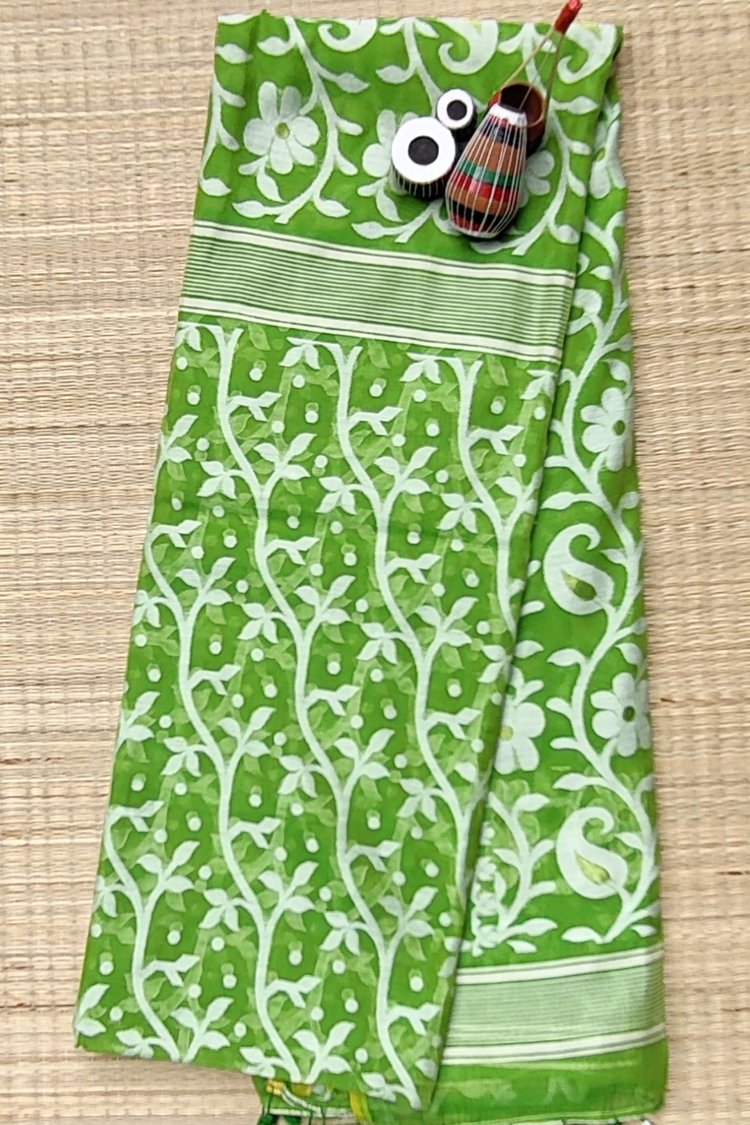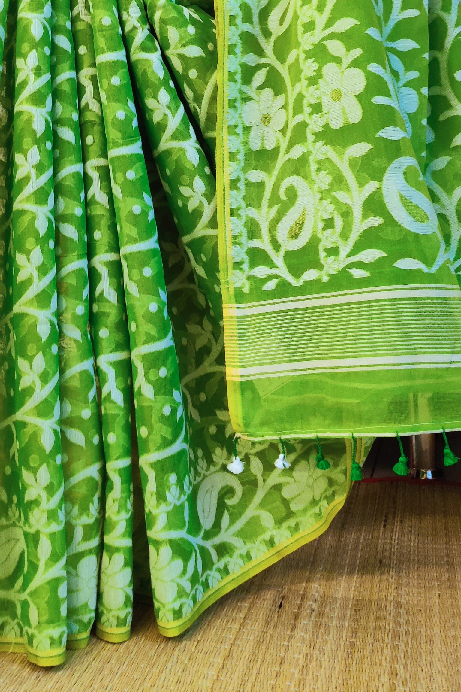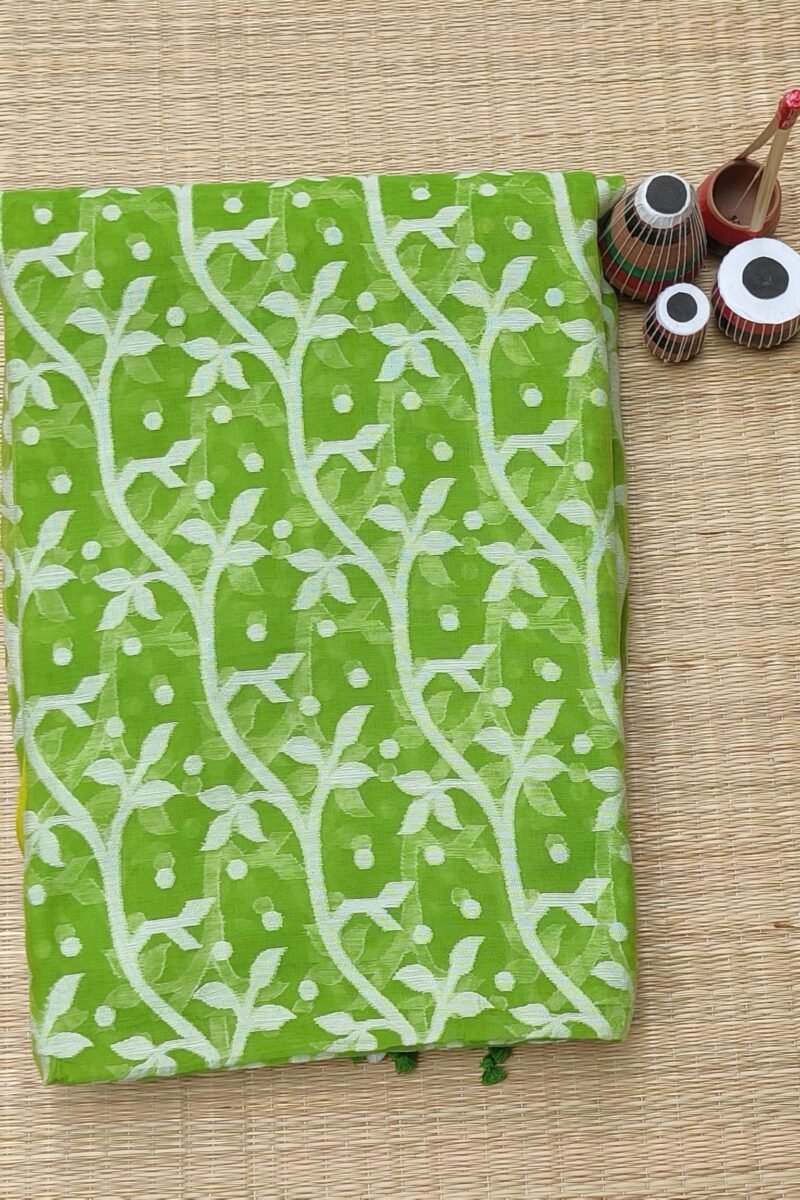 Jamdani Joy – Parrot Green Mul Cotton and Silk Handwoven Jamdani Saree
