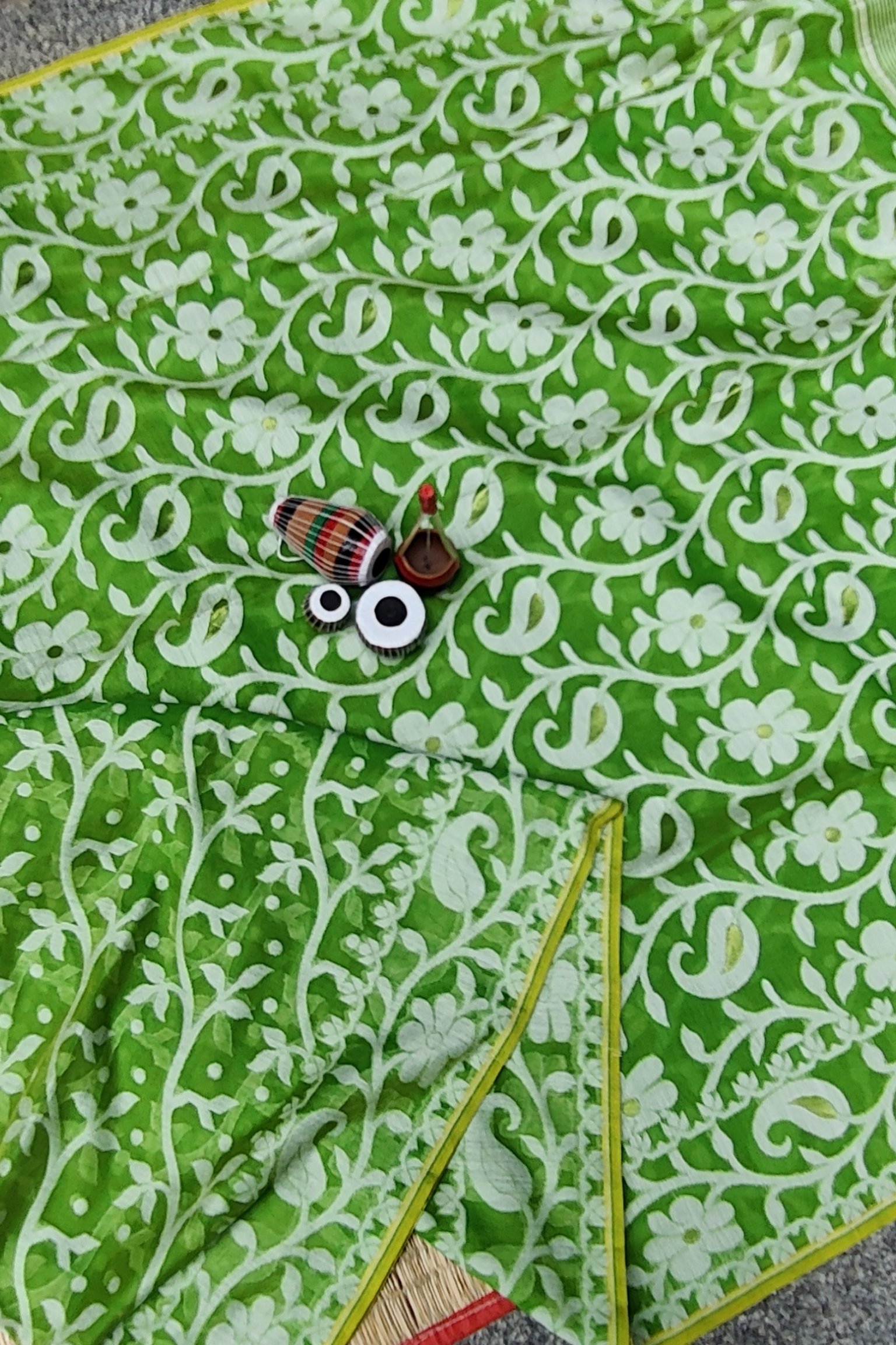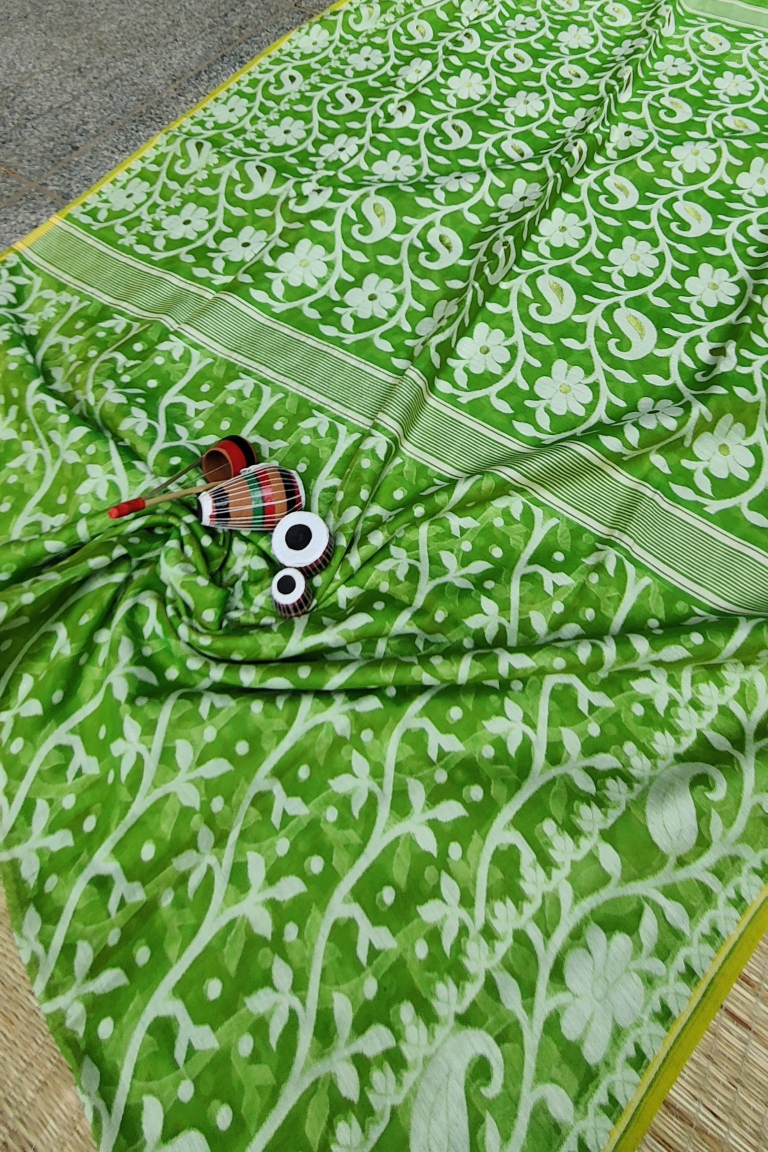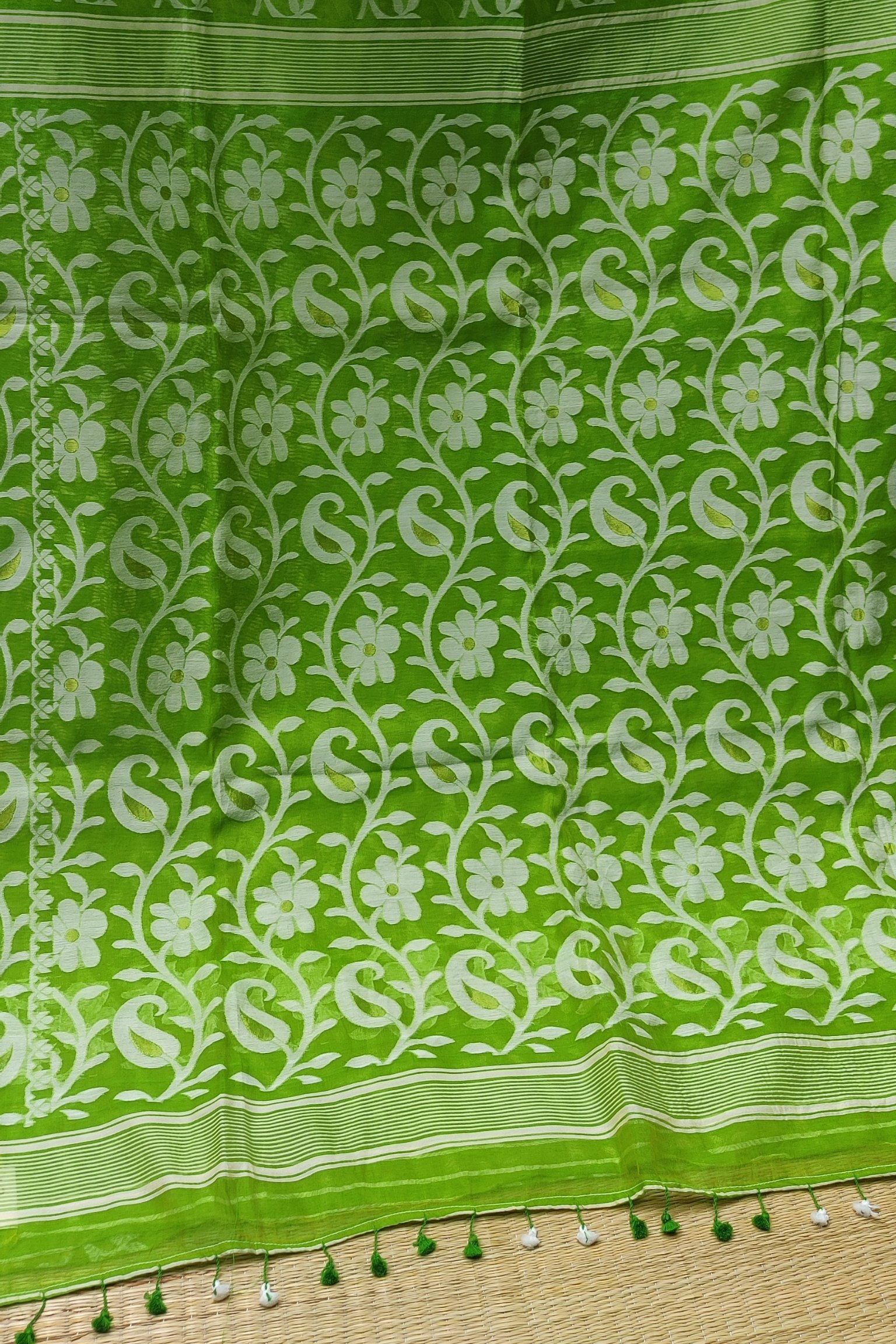 Jamdani Joy – Parrot Green Mul Cotton and Silk Handwoven Jamdani Saree