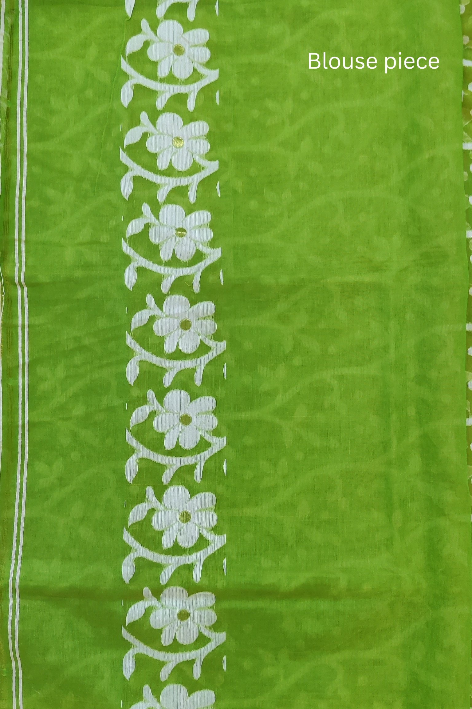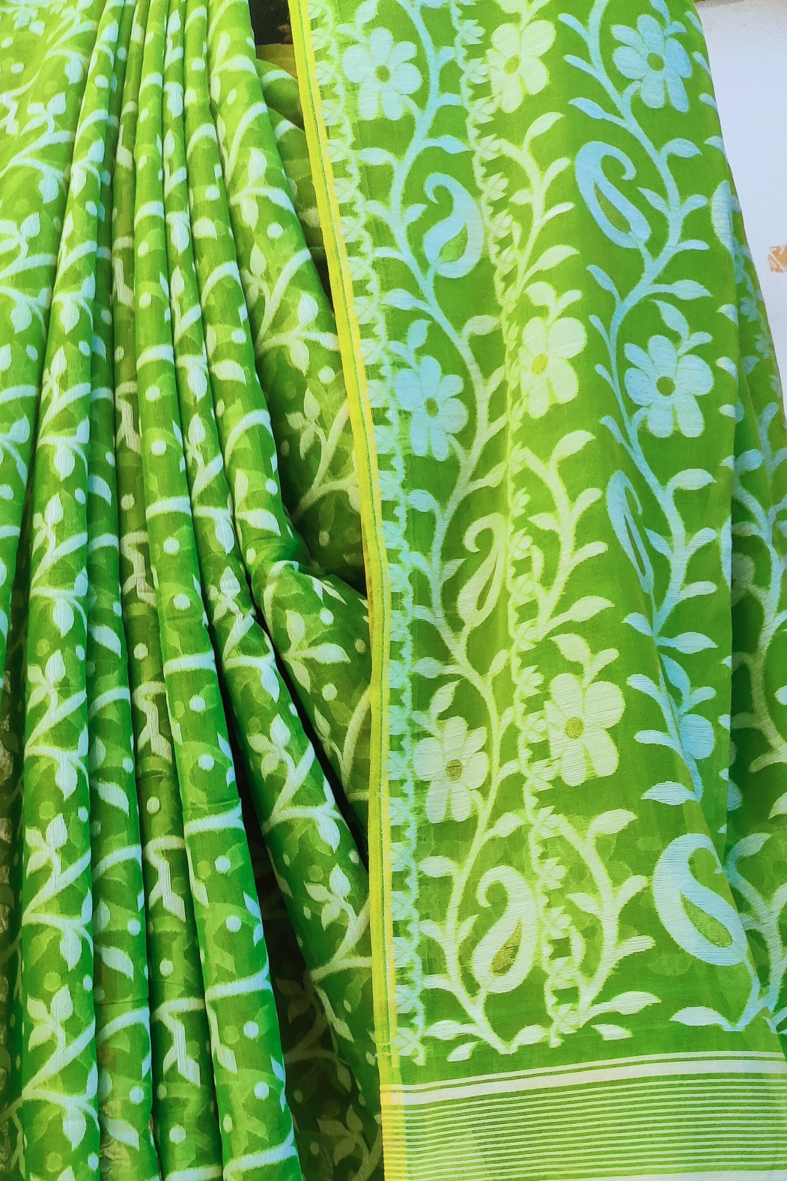 This parrot green mulmul cotton and silk Jamdani saree is a stunning blend of lightweight elegance and intricate craftsmanship. Adorned with delicate white floral motifs across the body, the saree is further accentuated by a pallu featuring beautiful white and cream flowers. Complete with a matching running blouse and a woven border, this handwoven masterpiece is perfect for any occasion, offering a luxurious yet effortless charm.
