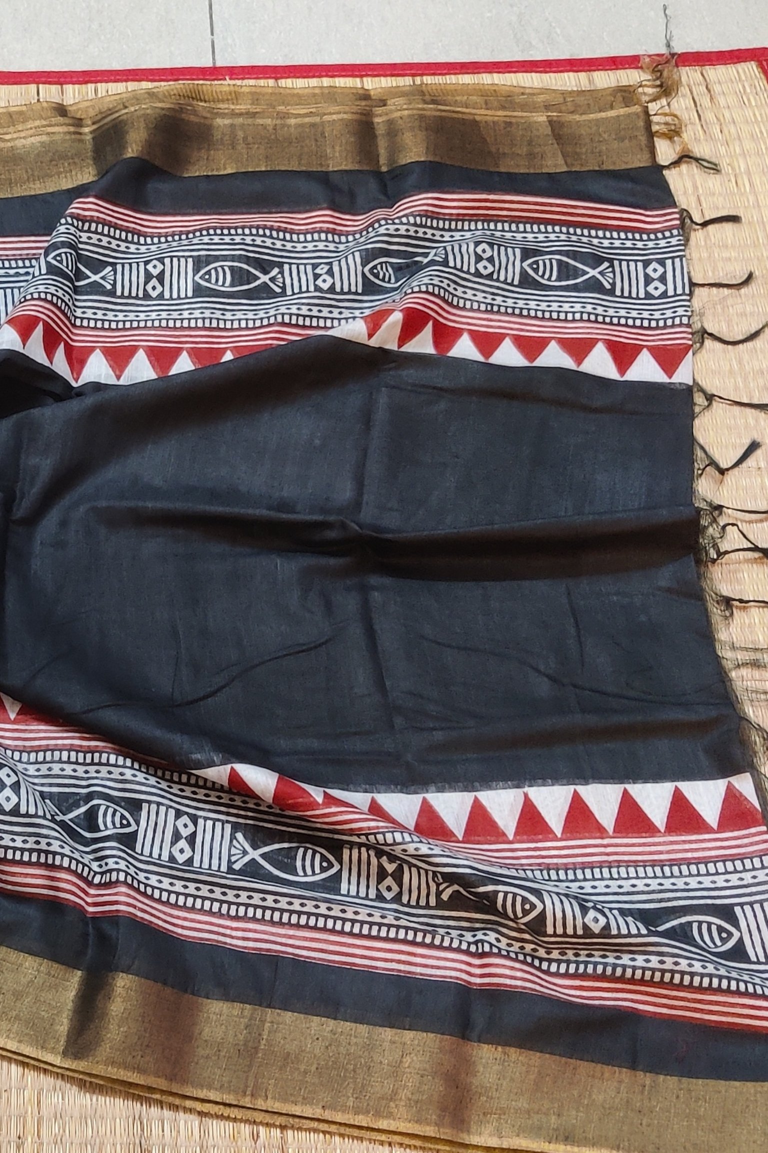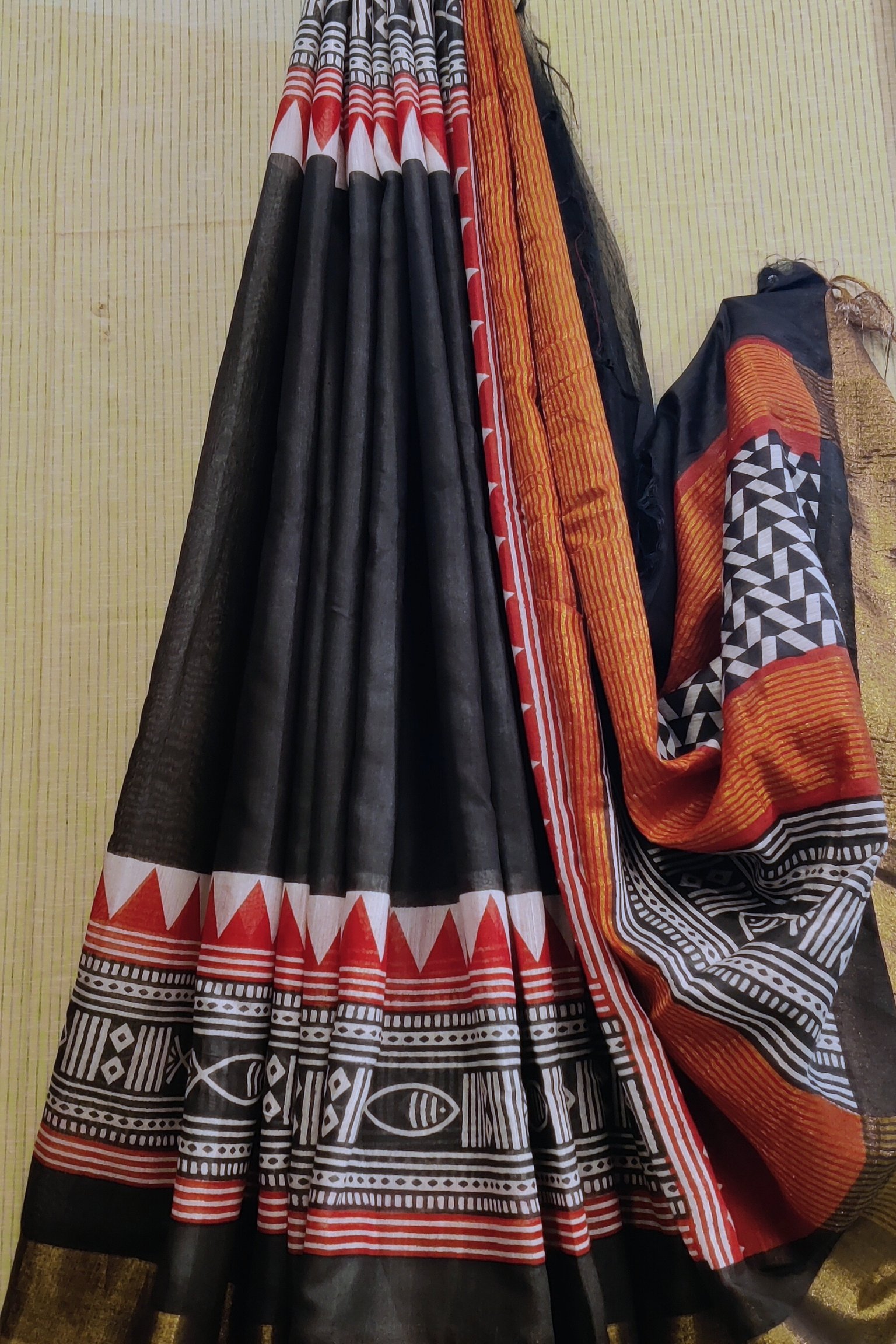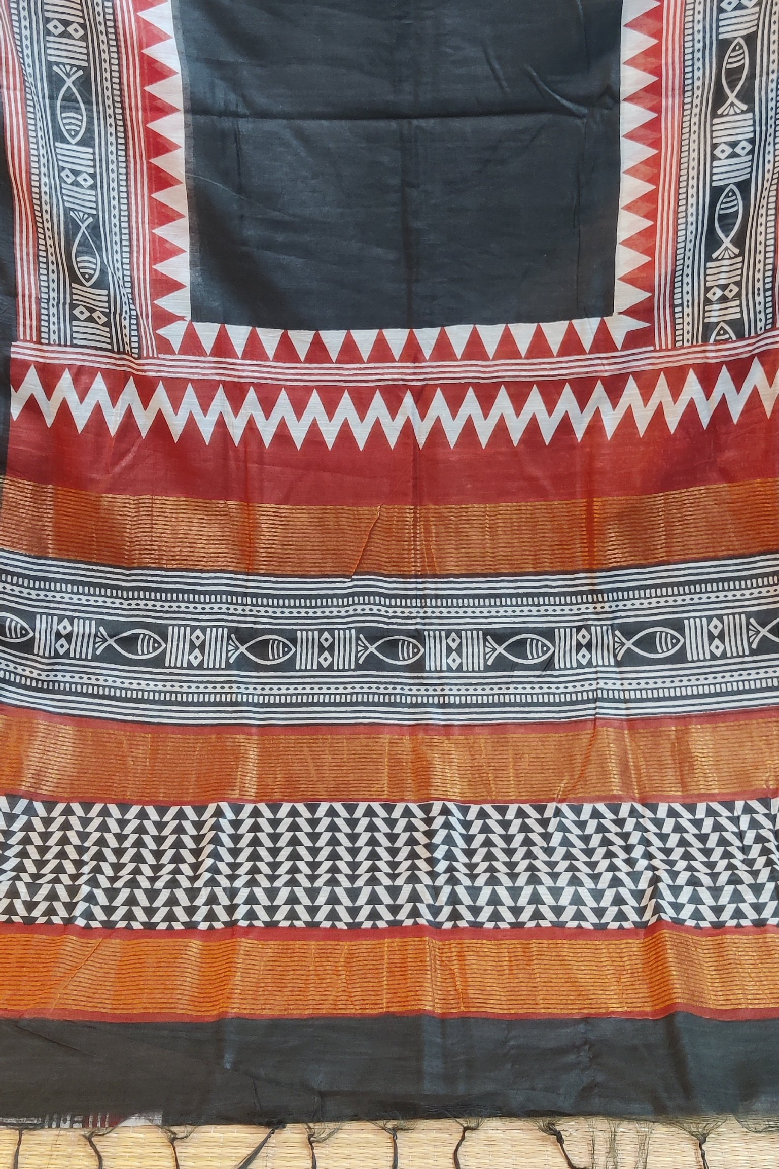 This striking black cotton silk saree features a bold black and white fish print, beautifully accented with a red temple design running along the edges. The intricate fish and temple print border measures an impressive 8 inches, adding a touch of traditional charm to the saree. A dull gold zari border frames the saree elegantly, enhancing its richness. Paired with a solid black blouse piece, this saree is perfect for making a unique and stylish statement at any occasion.
