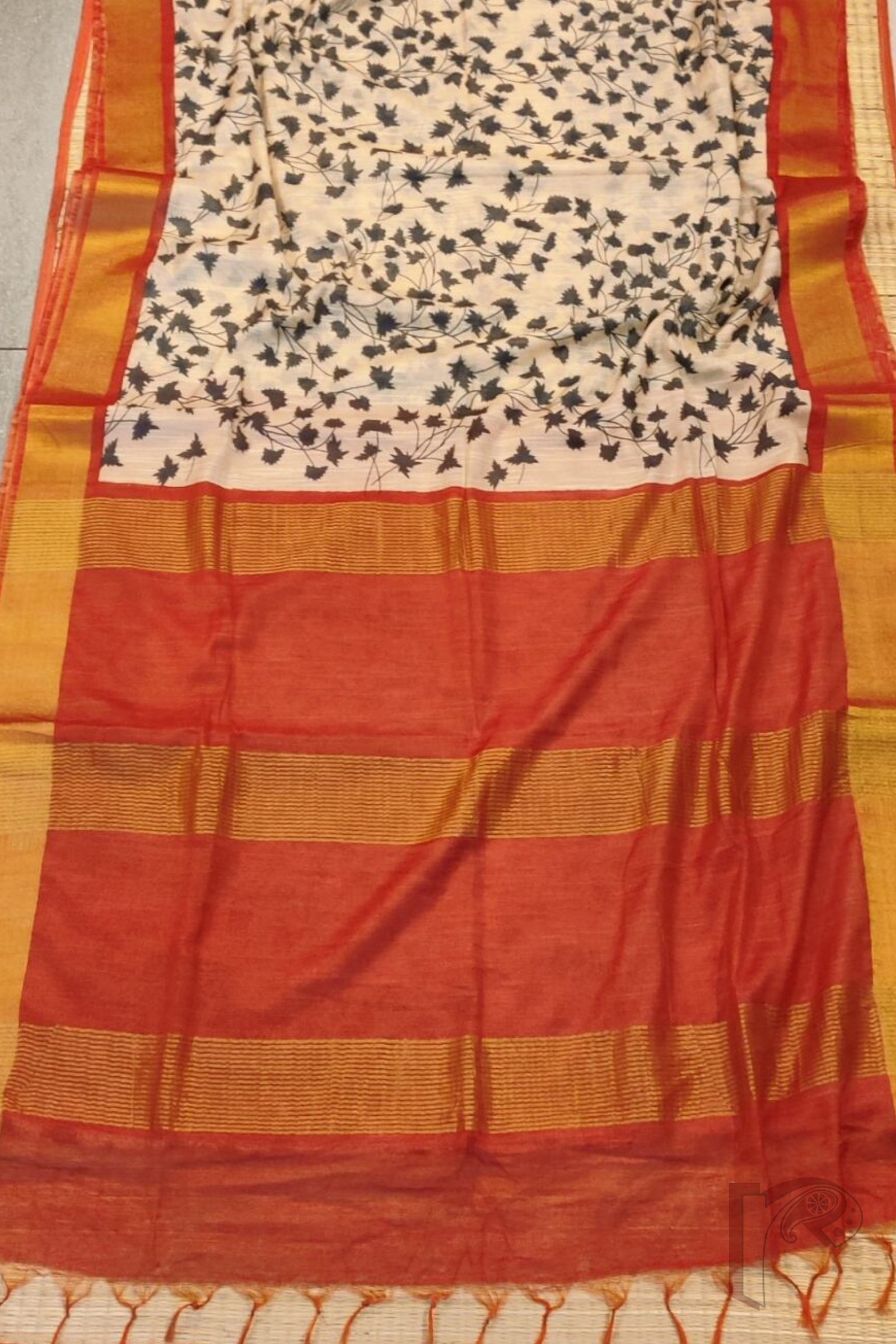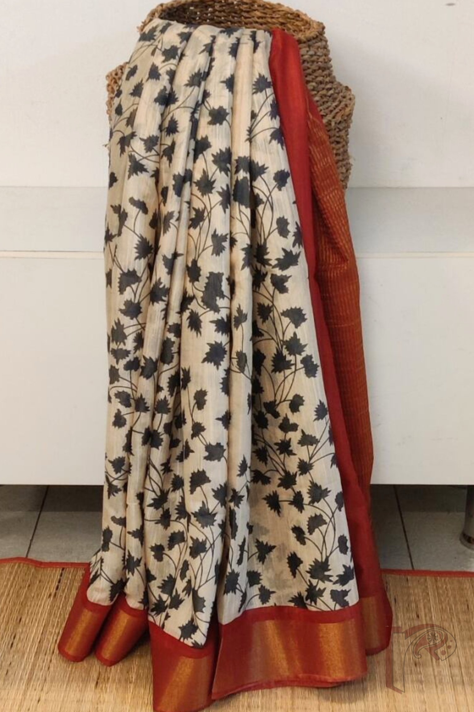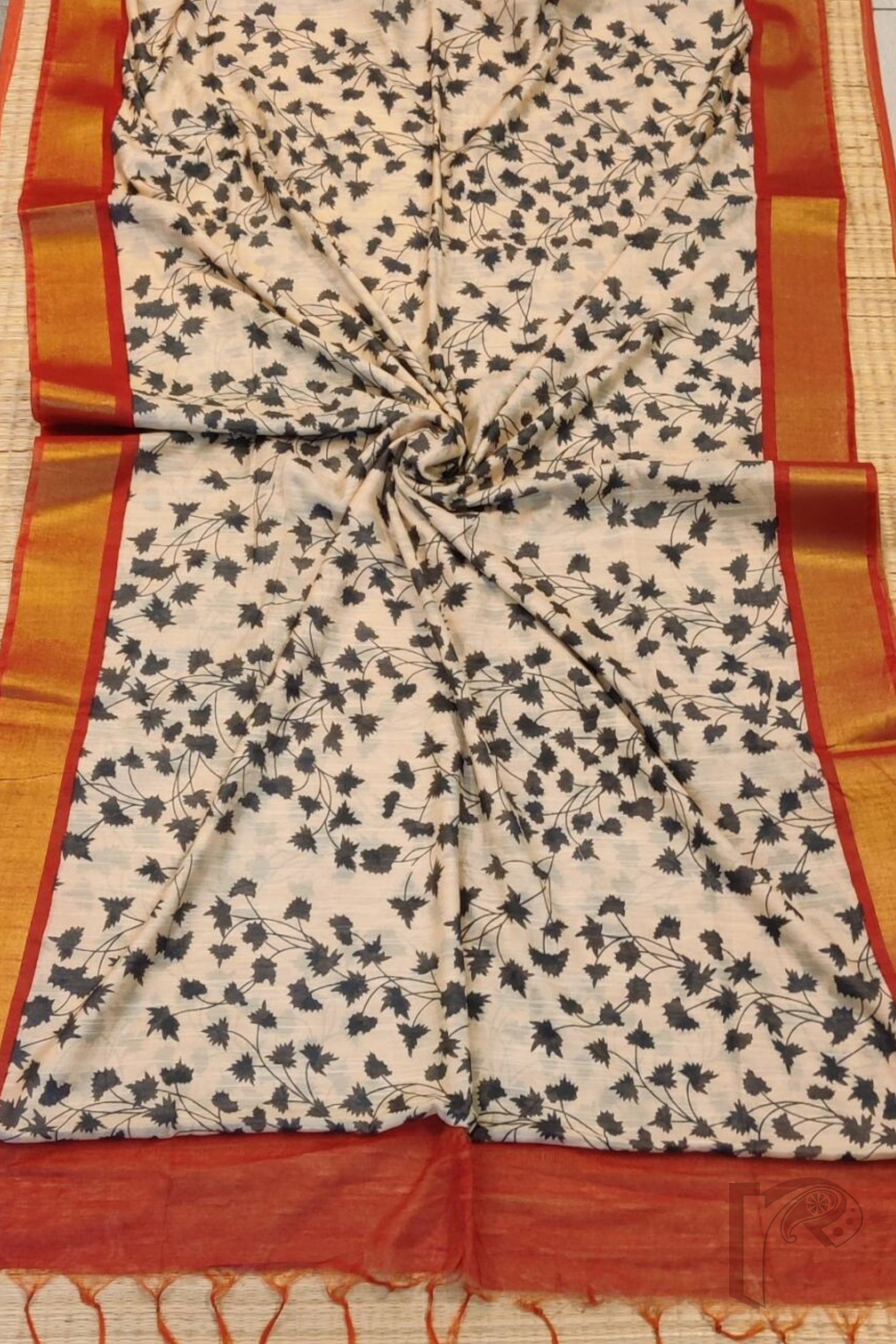 Jayshree Jiva – Cream Jayshree Staple Cotton Silk Saree with Black Leaf Print and Red-Gold Accents