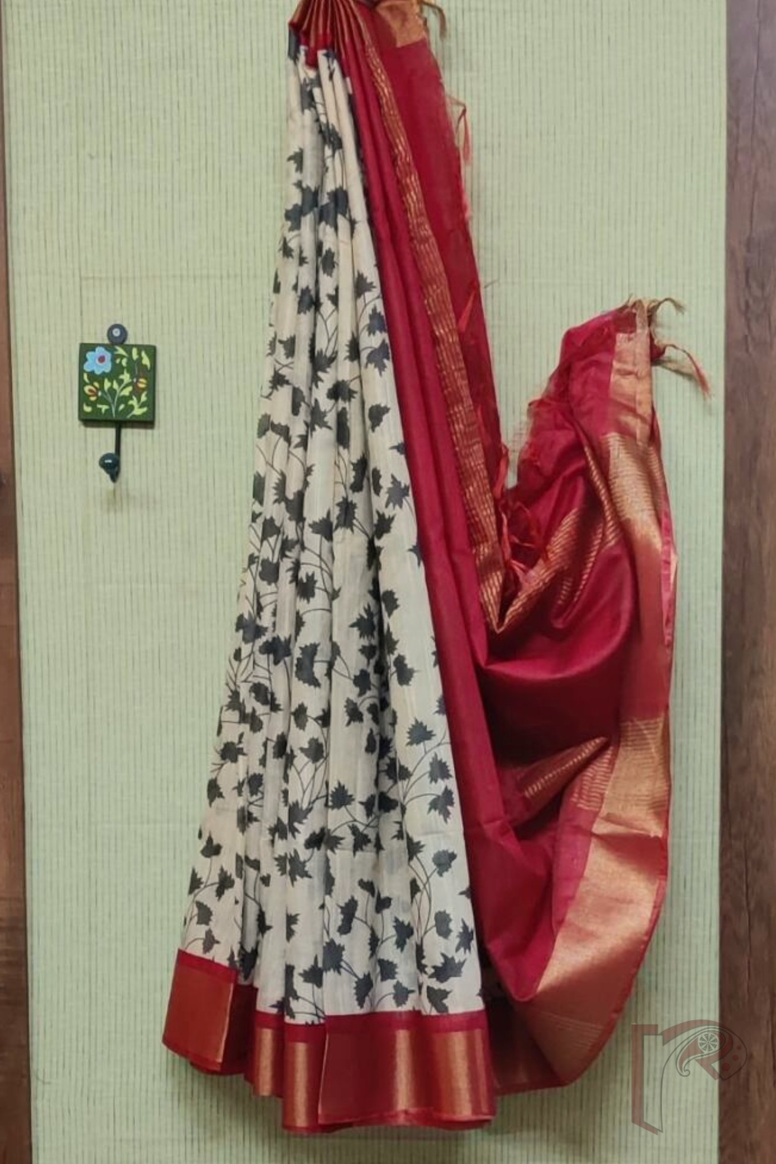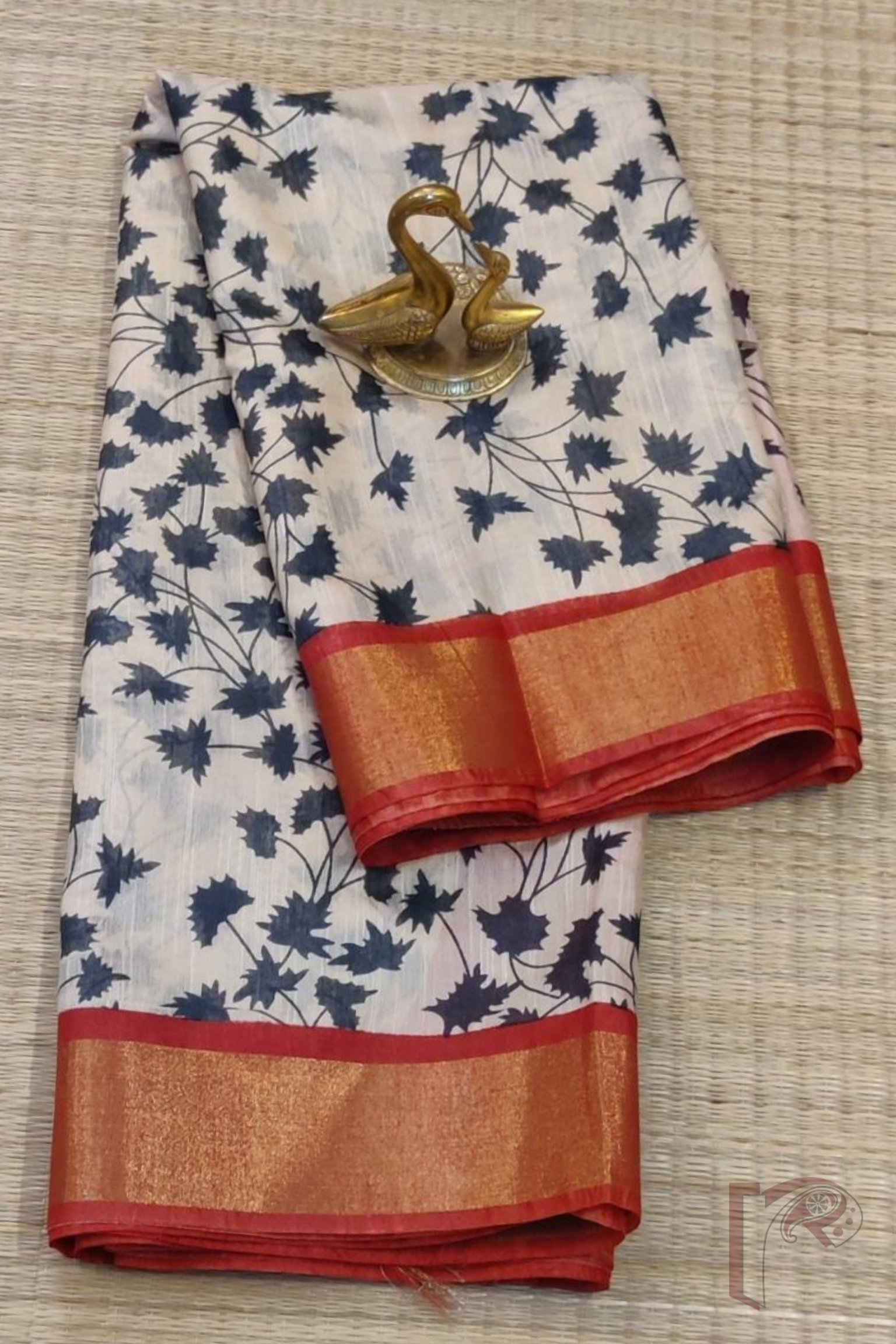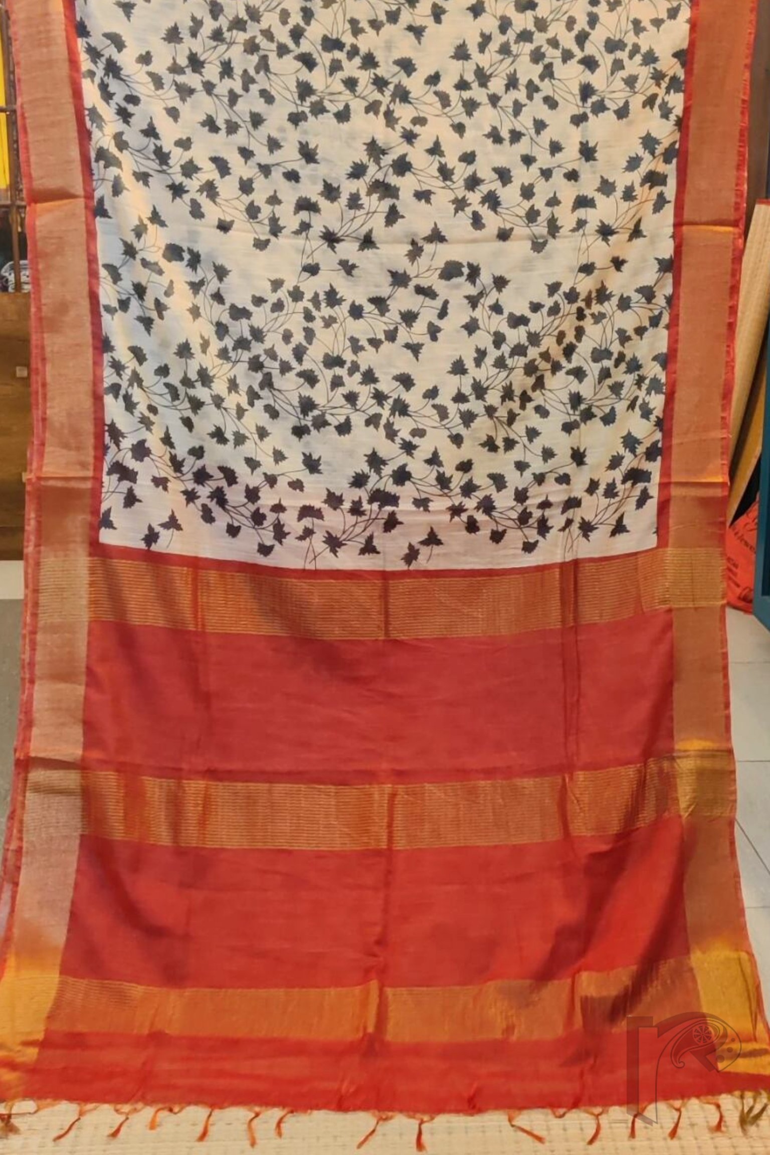 Jayshree Jiva – Cream Jayshree Staple Cotton Silk Saree with Black Leaf Print and Red-Gold Accents