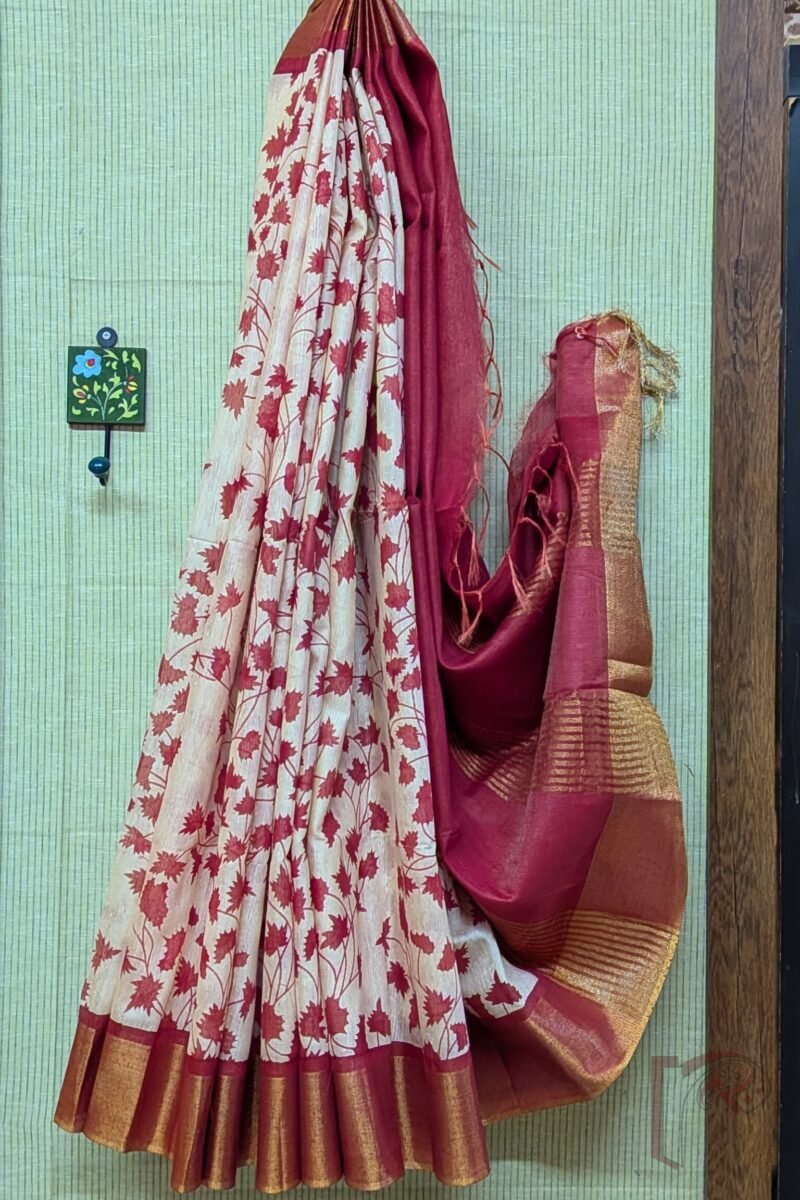 Jayshree Jiva – Cream Jayshree Staple Cotton Silk Saree with Red Leaf Stem Print and Red-Gold Accents