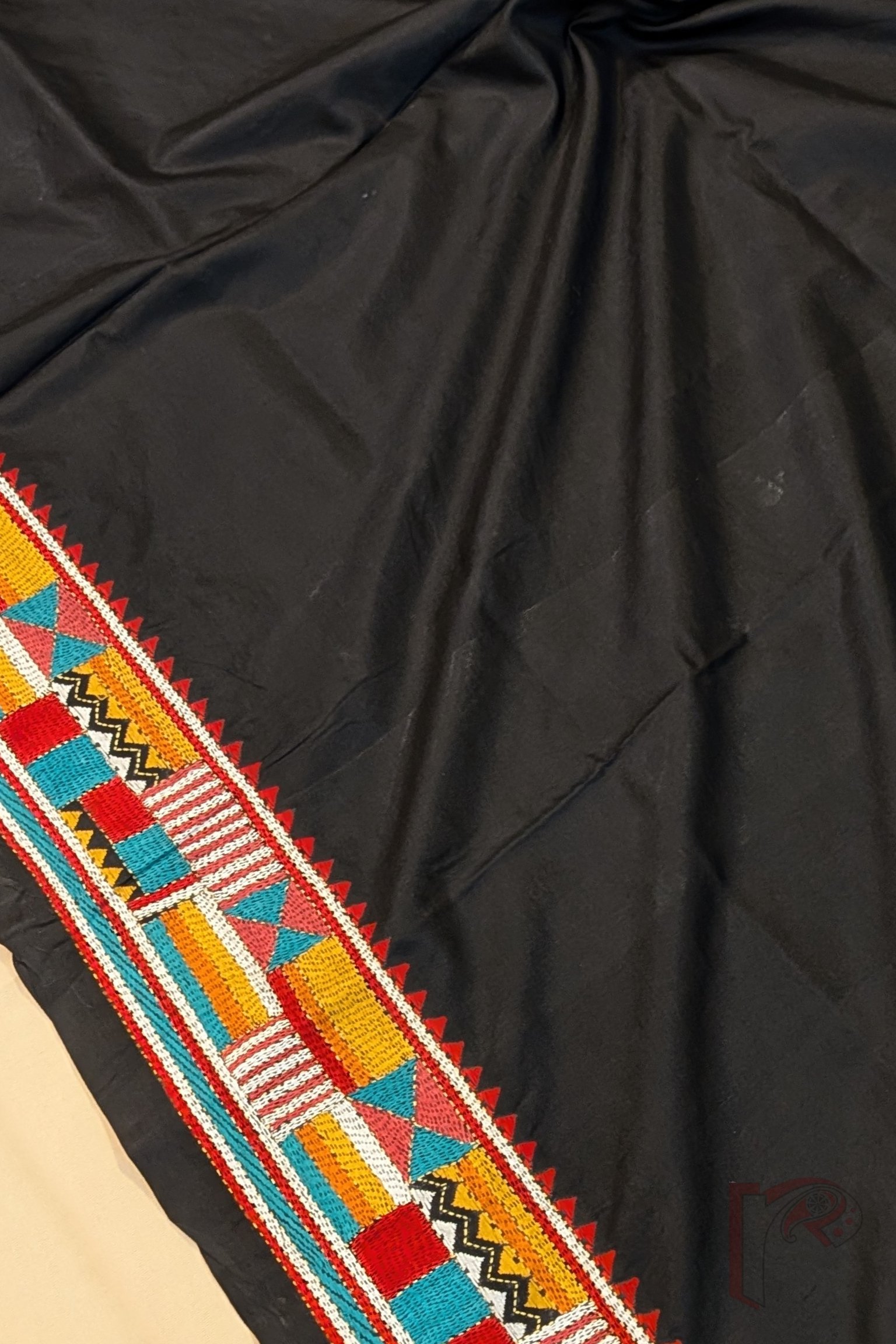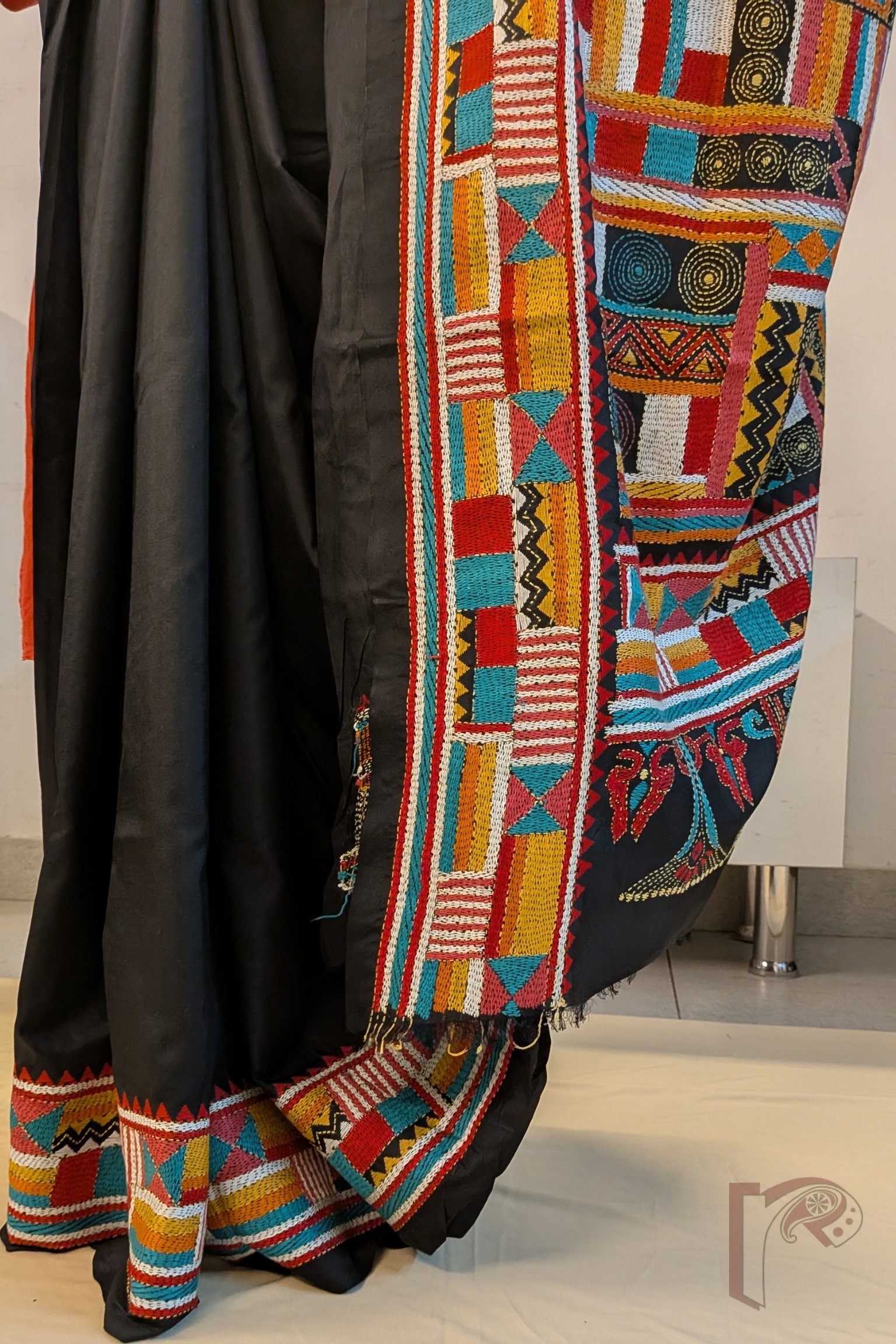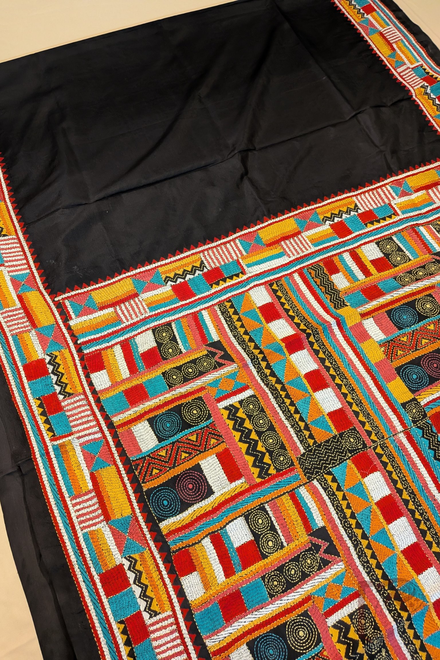Kantha Keepsakes – Black Pure Bangalore Silk Saree with Multicolour Geometric Kantha Embroidery
