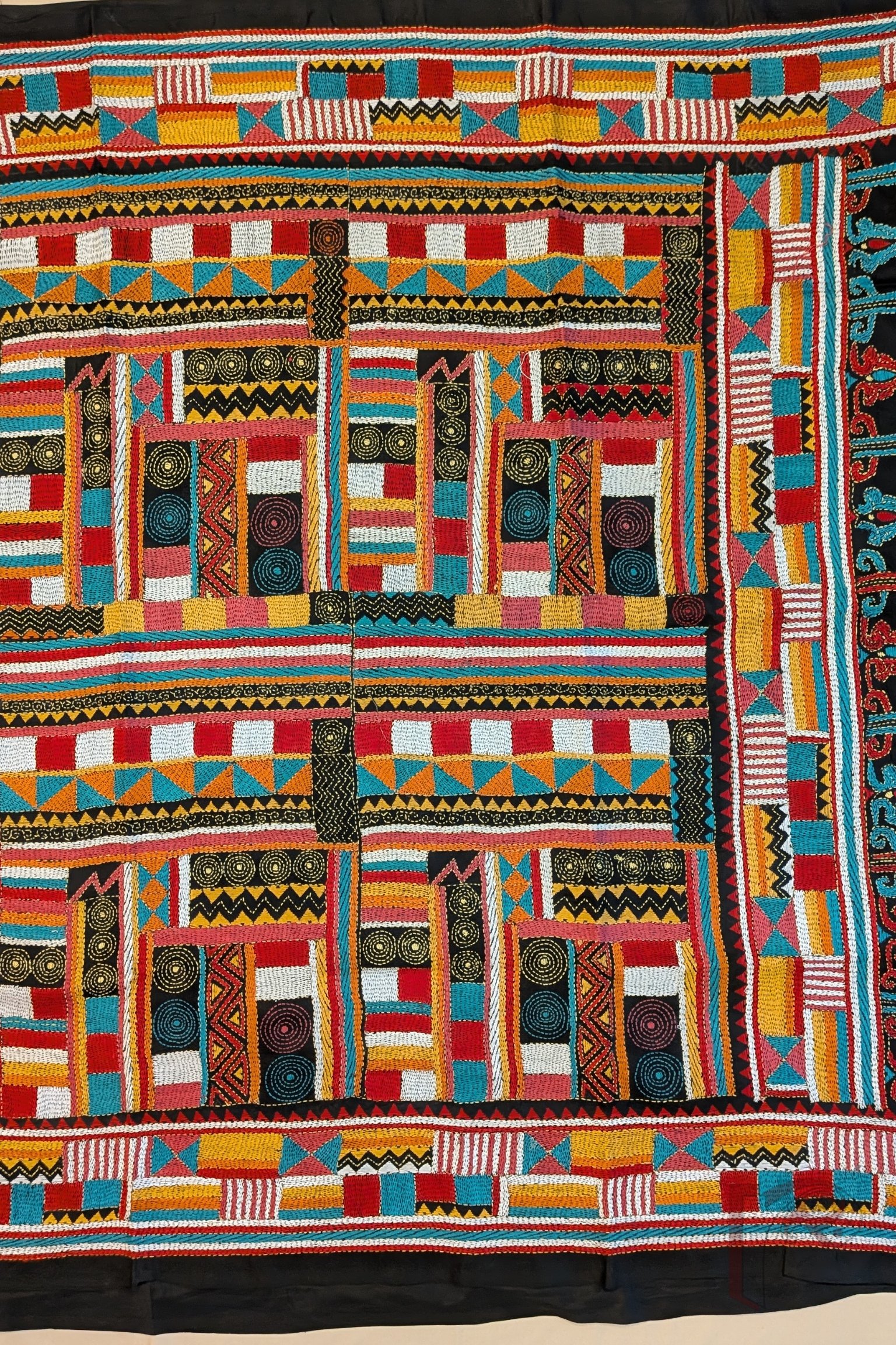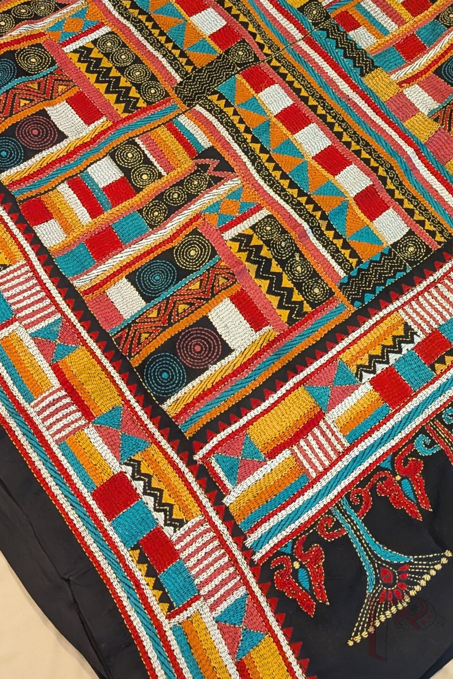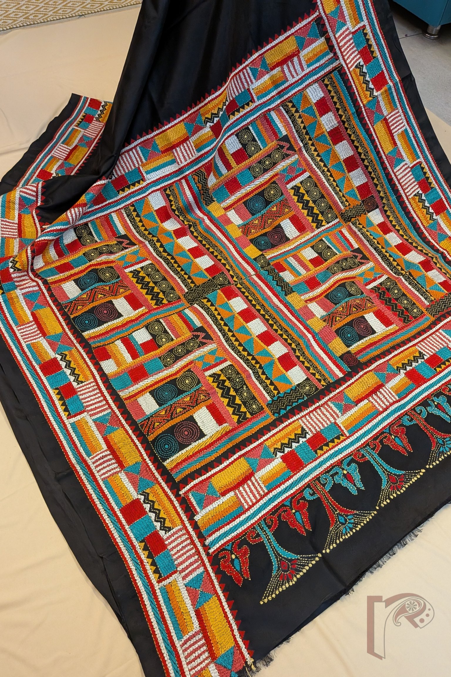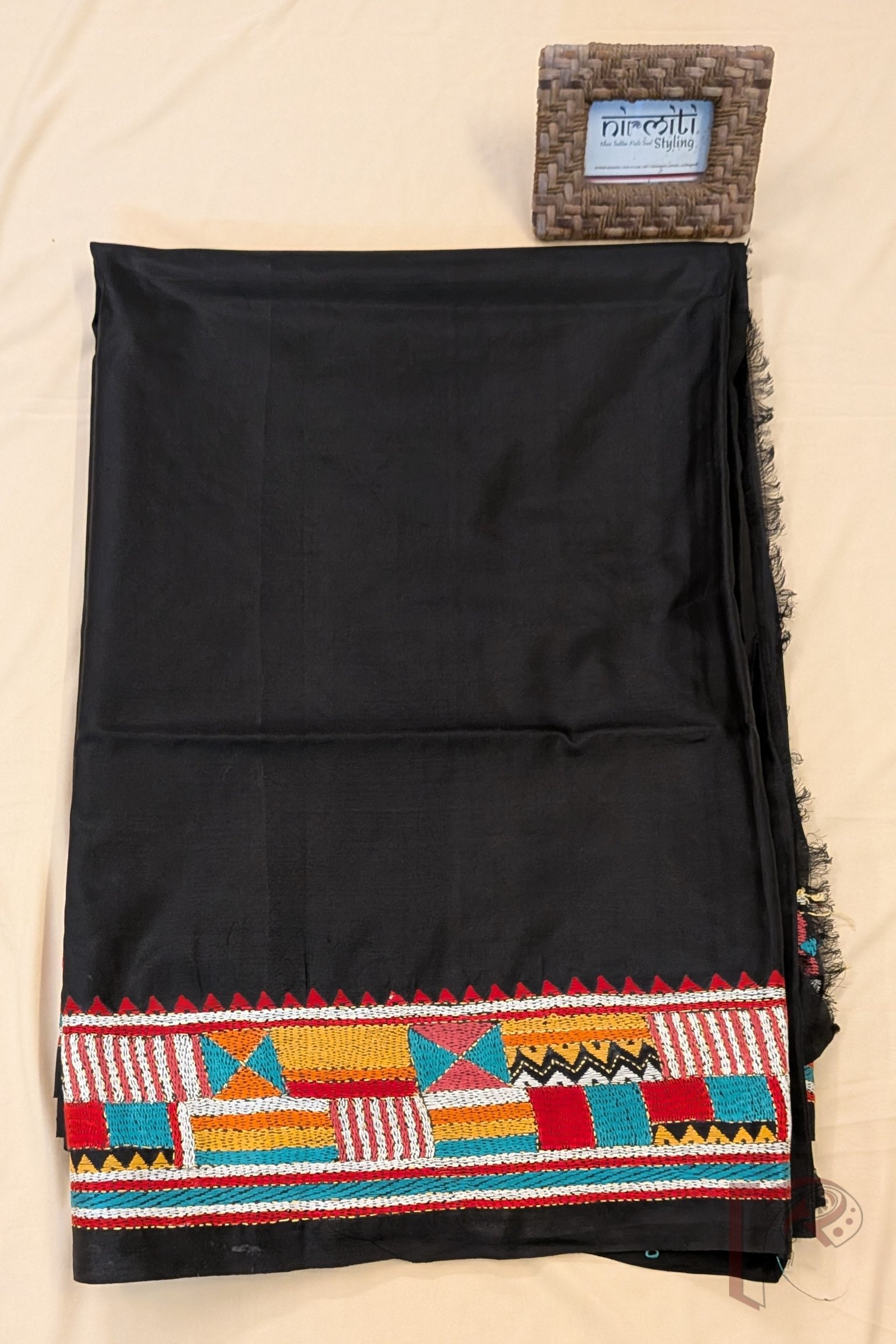 Kantha Keepsakes – Black Pure Bangalore Silk Saree with Multicolour Geometric Kantha Embroidery