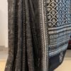 Bold and contemporary, this black pure Bangalore silk saree brings together modern design and timeless hand embroidery. The saree is adorned with intricate multicolour Kantha embroidery on the pallu and borders, forming a striking geometric composition of squares, rectangles, triangles and curved circular lines. The vibrant stitches create a beautiful contrast against the deep black silk base, turning the saree into a powerful statement of handcrafted elegance and modern design sensibility. The smooth drape of Bangalore silk enhances the structure of the geometric patterns while maintaining graceful movement. The saree comes with a plain black silk blouse piece with a matching multicolour embroidered border, completing an ensemble that feels artistic, refined, and distinctly contemporary.