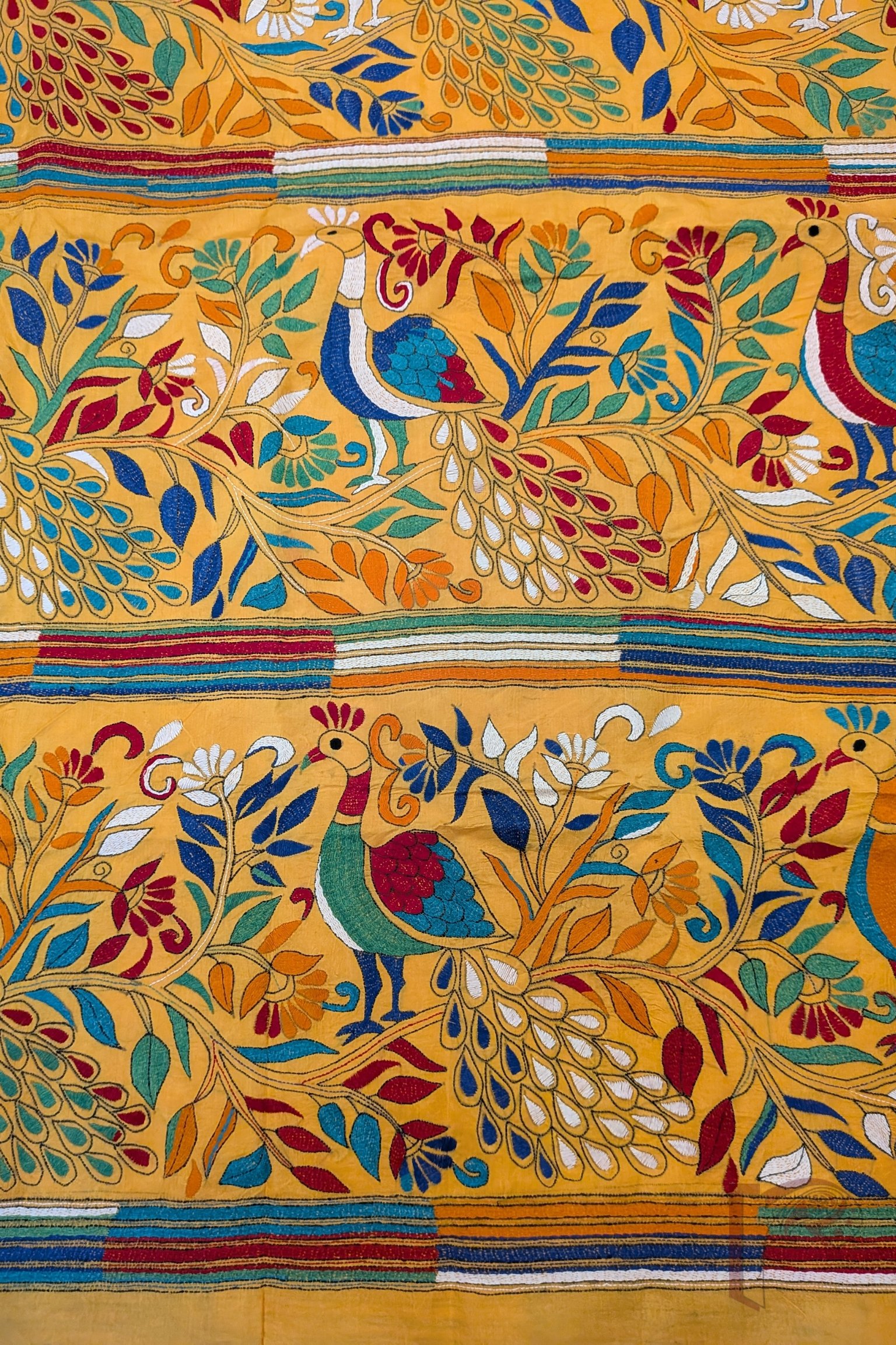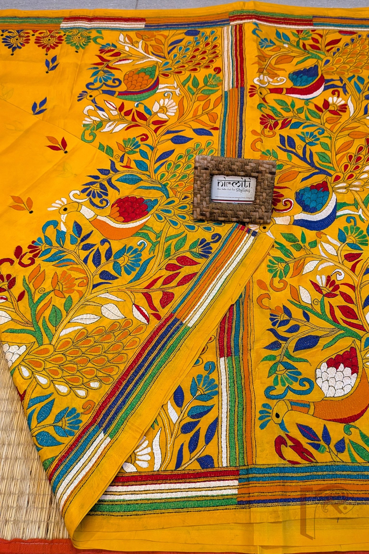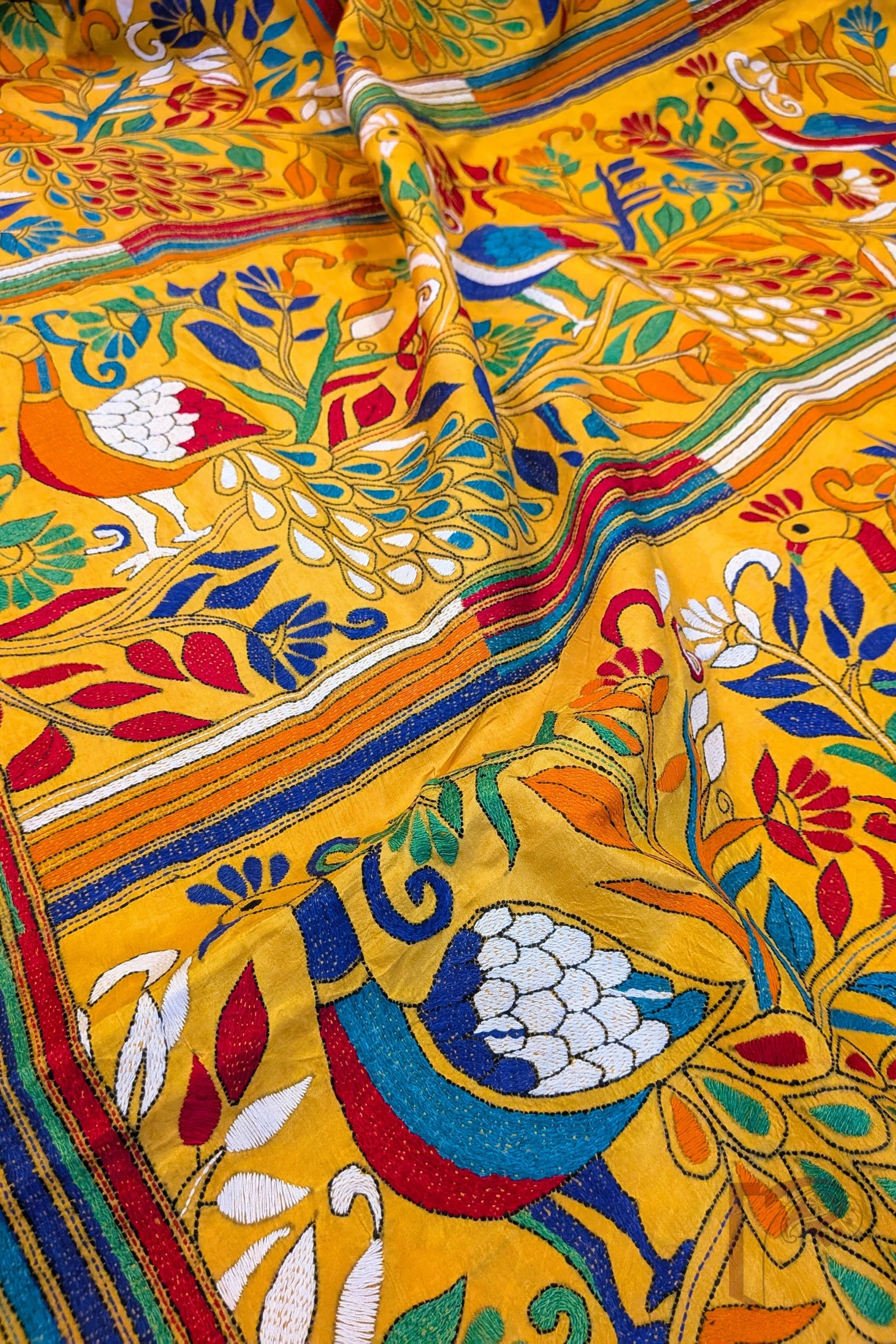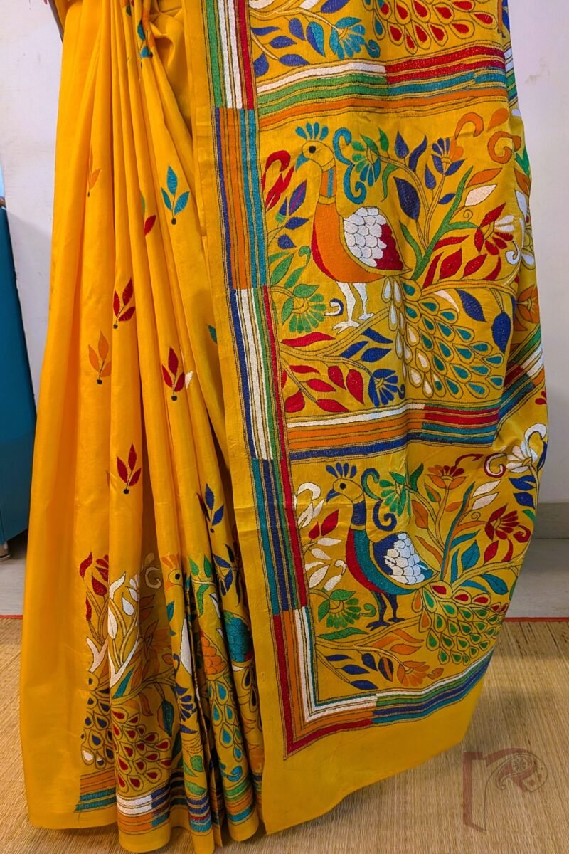 The interplay of vibrant silks — from glowing mango yellow to jewel-toned purples and deep rusts — adds character and richness to the collection. Some sarees feature dense floral vines, others hold symmetric borders of kantha lines, and yet others burst into colorful blooms or traditional tribal forms. Whether it’s a festive occasion or a statement day event, these sarees carry a unique blend of grace and boldness, tradition and modernity.