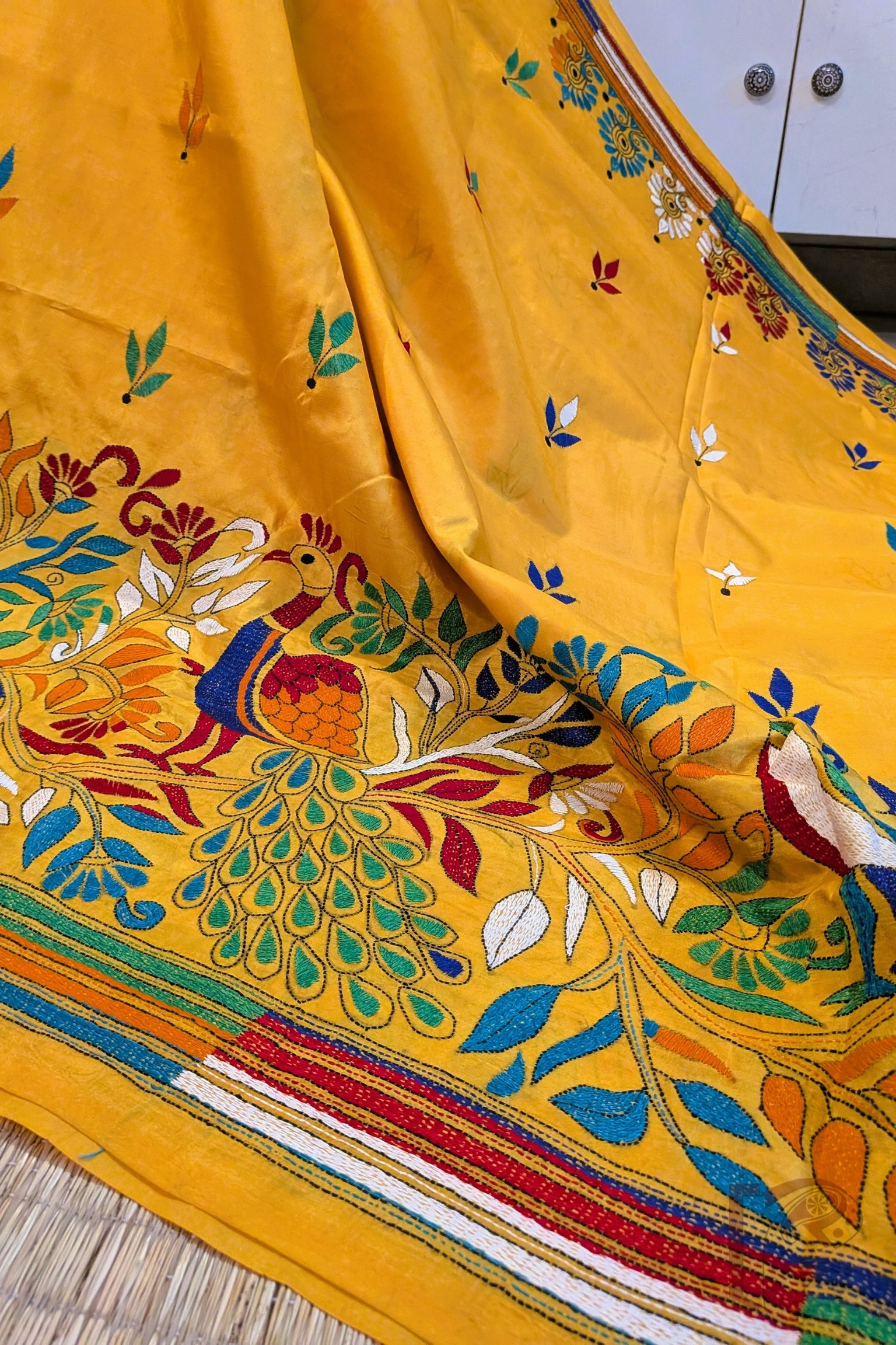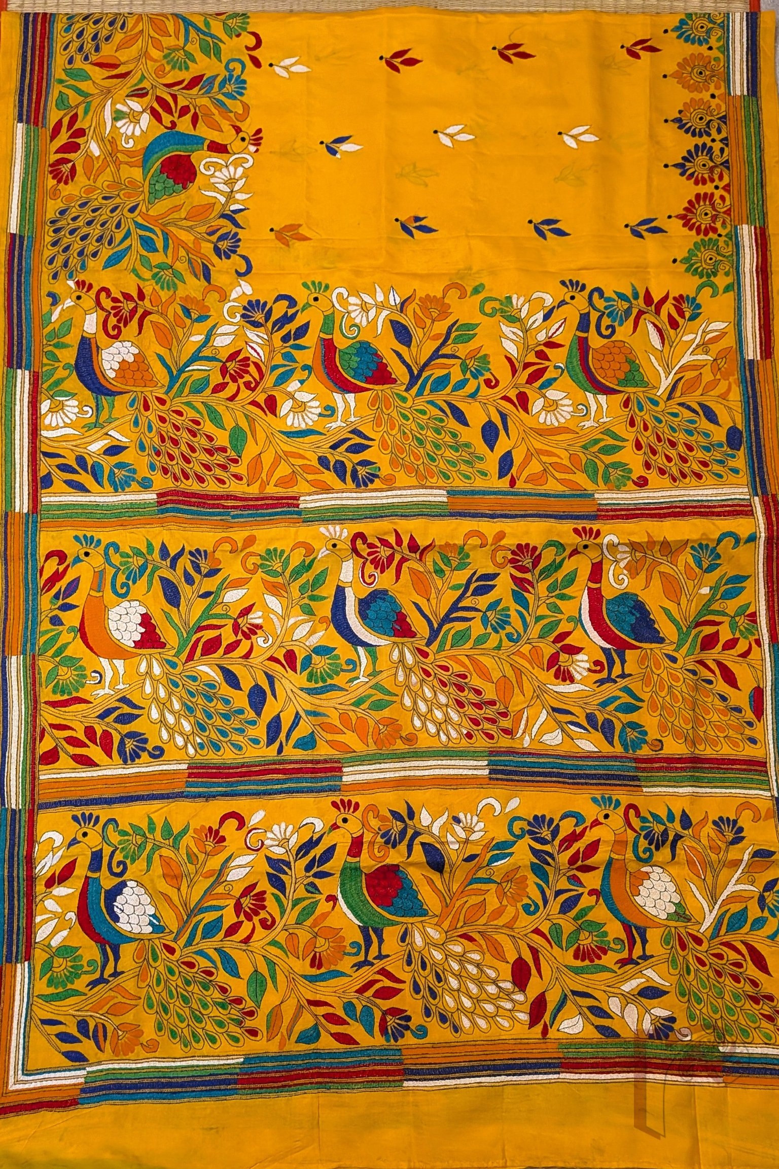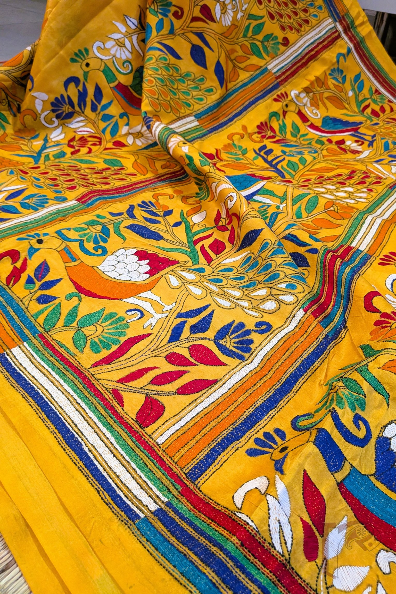 The interplay of vibrant silks — from glowing mango yellow to jewel-toned purples and deep rusts — adds character and richness to the collection. Some sarees feature dense floral vines, others hold symmetric borders of kantha lines, and yet others burst into colorful blooms or traditional tribal forms. Whether it’s a festive occasion or a statement day event, these sarees carry a unique blend of grace and boldness, tradition and modernity.
