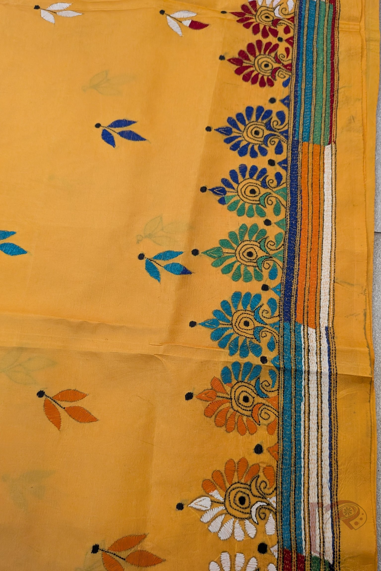 From the vibrant heart of Bengal’s handcraft legacy comes a collection woven with stories — our Kantha Silk Sarees are more than textiles; they are living heirlooms. Crafted from exquisite Tussar and blended silks, each saree carries the warmth of handmade artistry and the elegance of heritage embroidery. Kantha, traditionally an age-old rural craft of Bengal, has evolved from quilting to become one of the most poetic forms of textile expression.