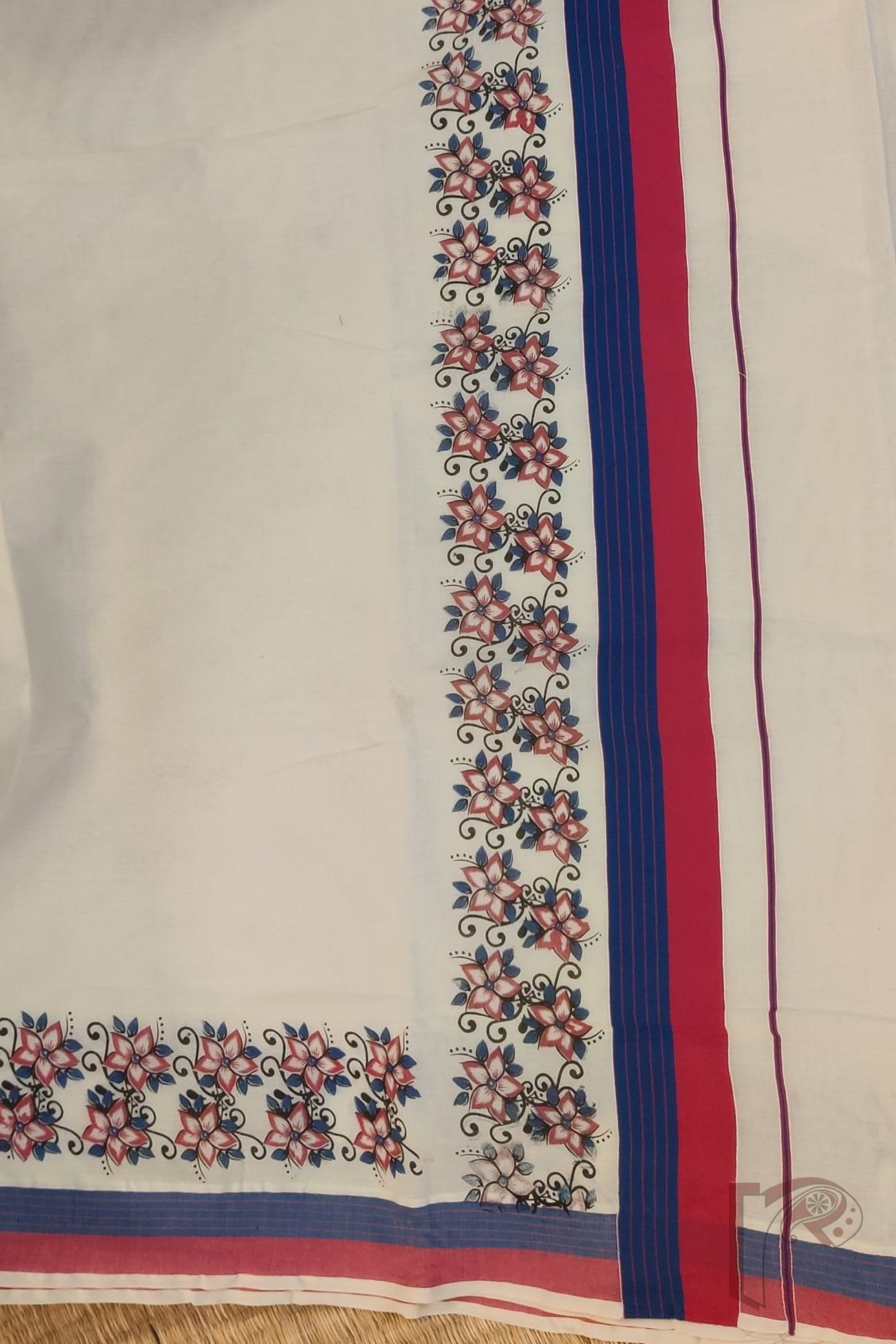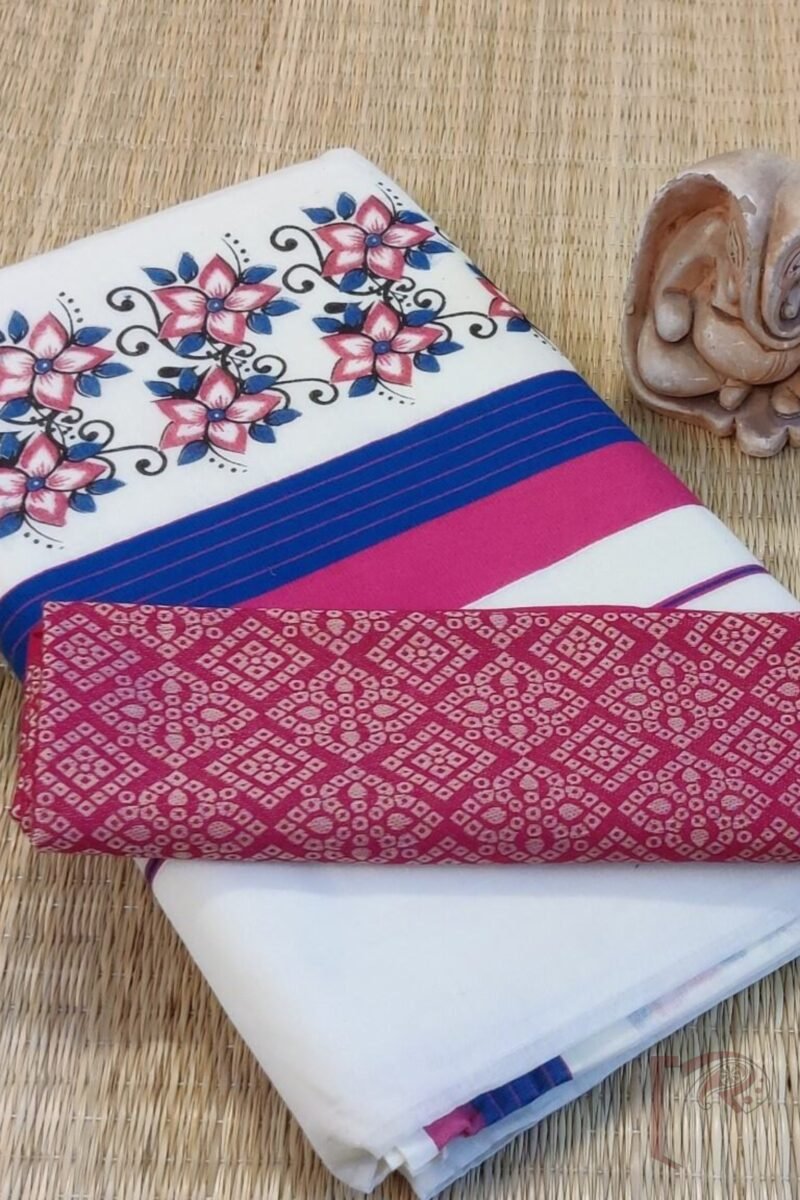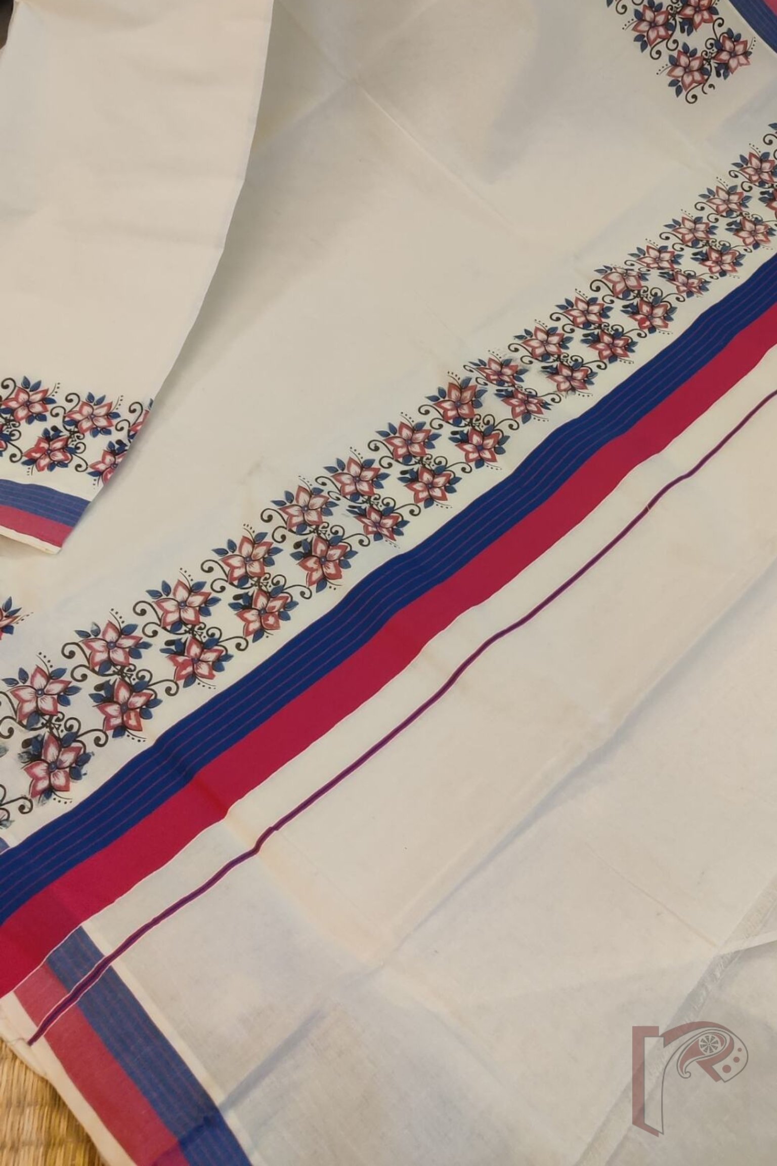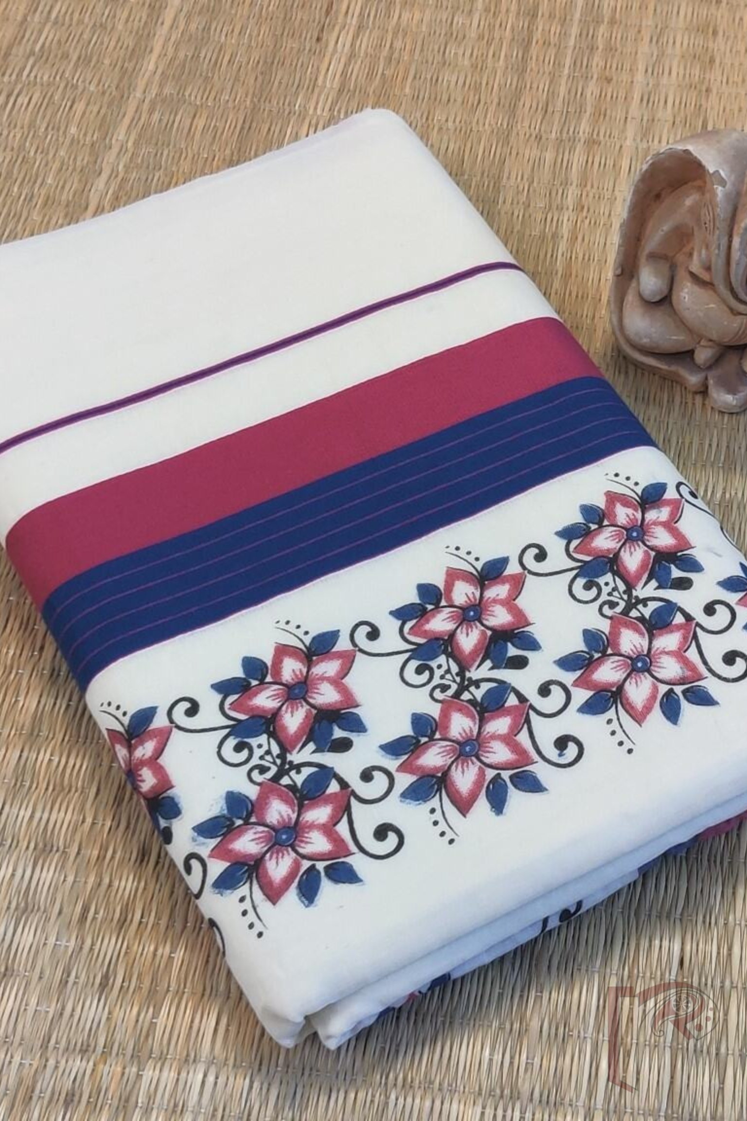 Kasavu Krithi – Off-White Cotton Kasavu Saree with Hot Pink and Blue Floral Border and Pink Pallu Stripe Saree