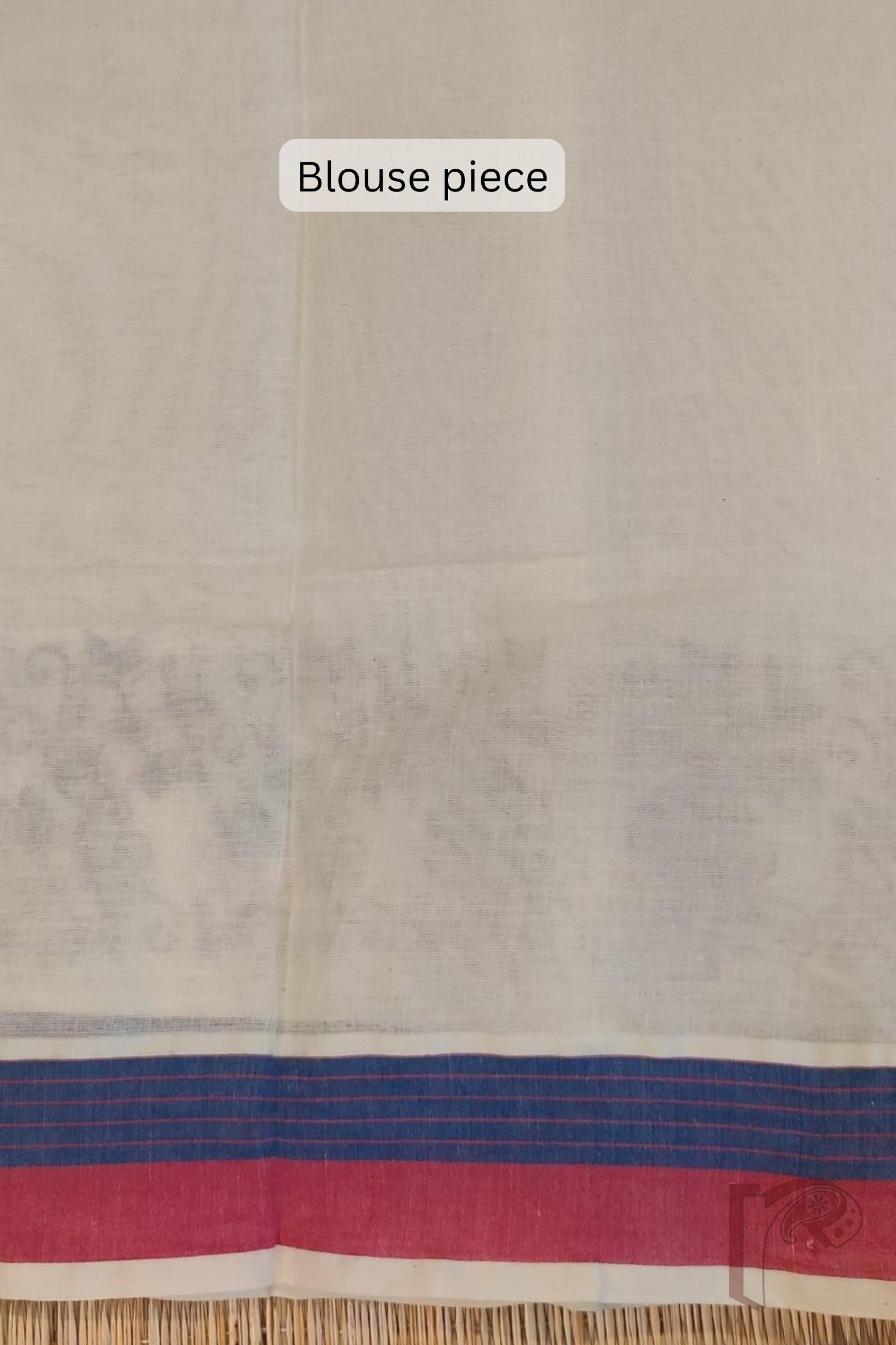 Bright and refreshing, this off-white cotton Kasavu saree is adorned with hot pink and blue floral designs outlined in black for striking definition. A pink pallu stripe and matching dull pink borders on both sides add a lively charm. Complete with a running blouse piece with border, this saree is perfect for festive gatherings and day events. Its vibrant florals and airy cotton weave create a cheerful and graceful look, making it a versatile addition to any collection. Please note the additional blouse piece shown in picture is not a part of the package and can be purchased separately from our blouses section.