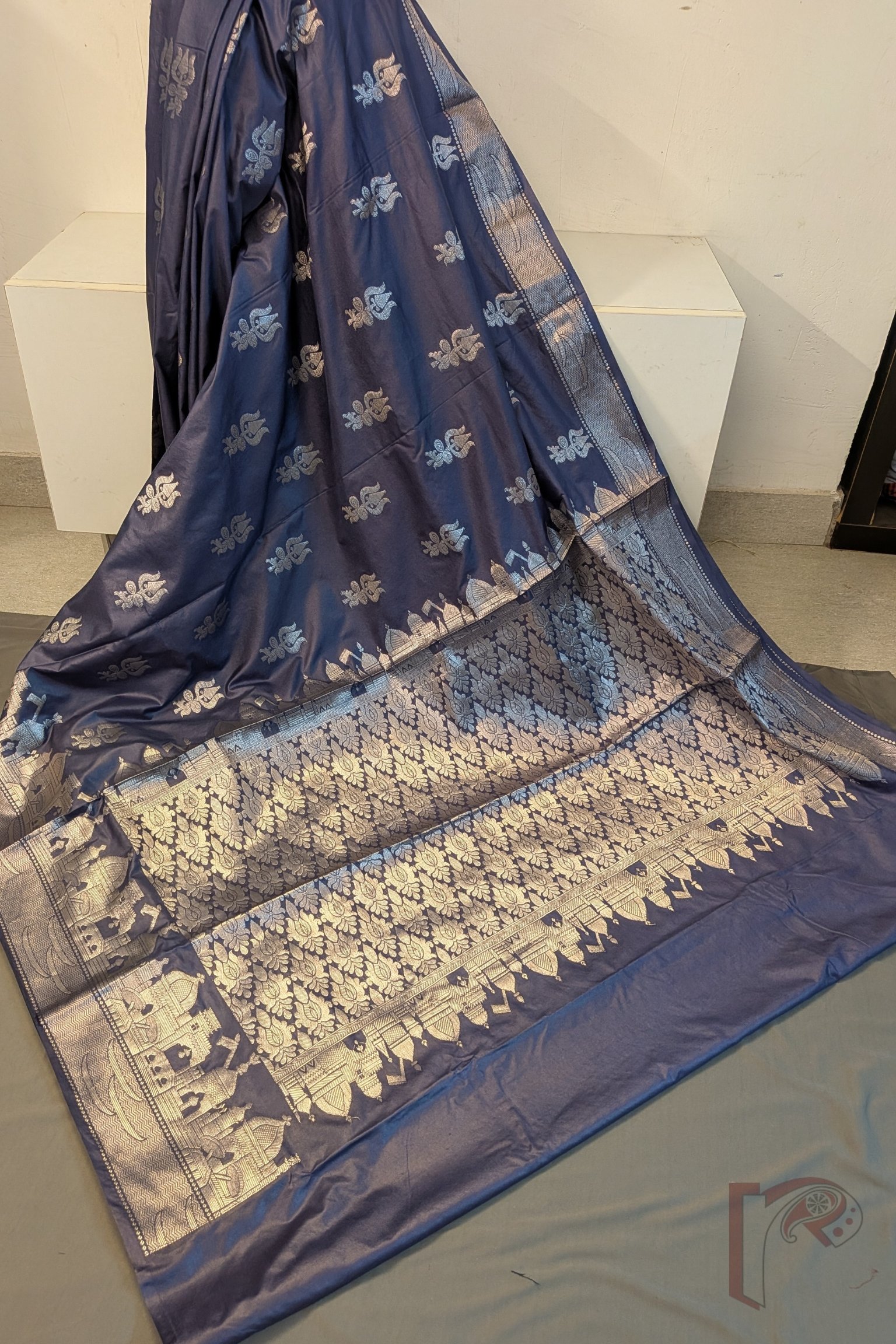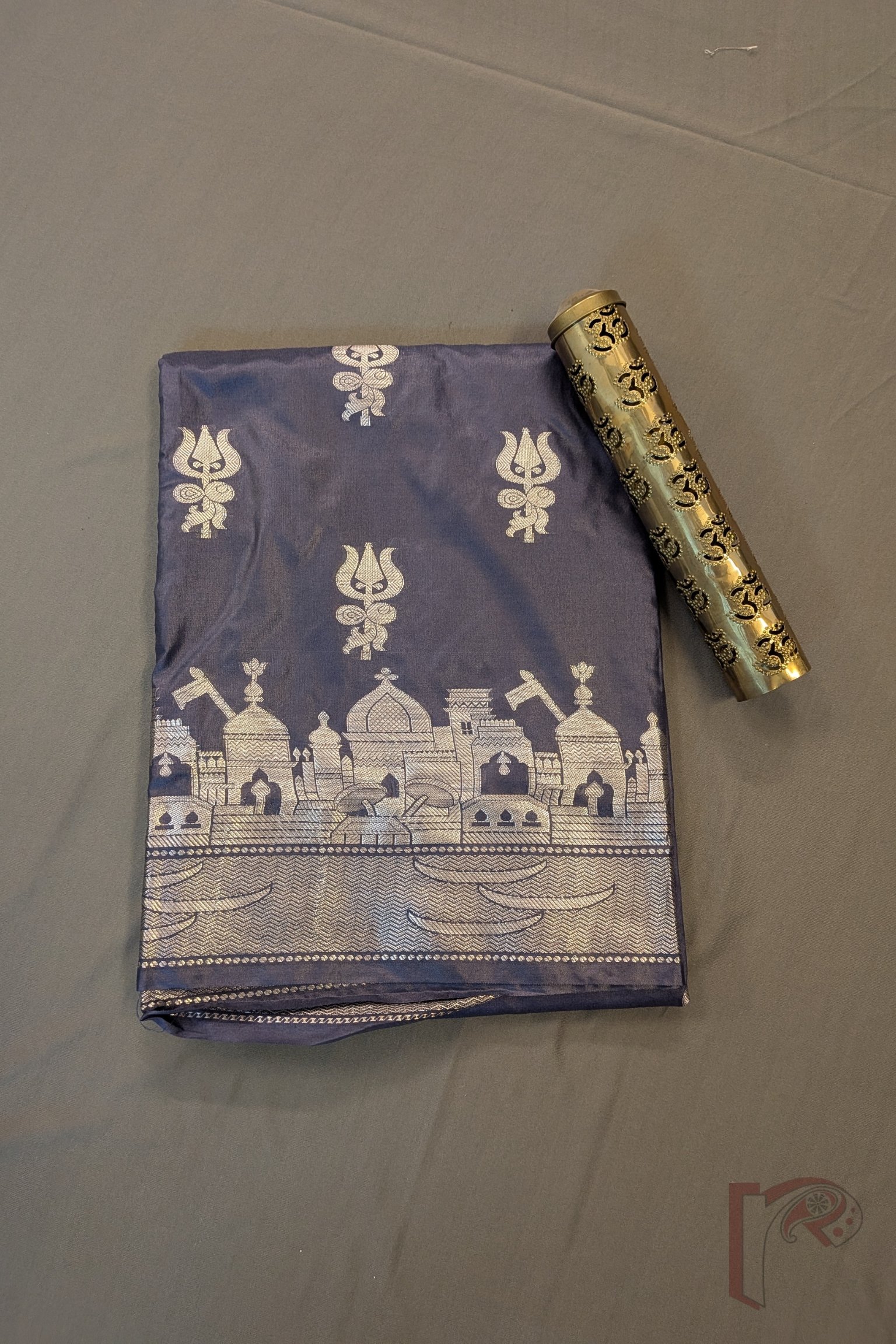 Katan Charm – Bluish Grey Katan Soft Silk Regal Saree with Trishul Motifs, Dull Gold Zari Pallu and Heritage Temple Boat Border