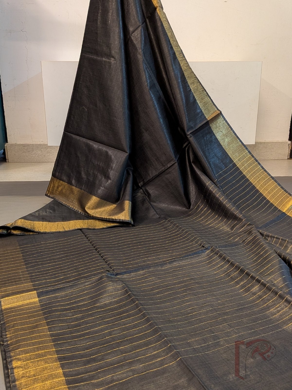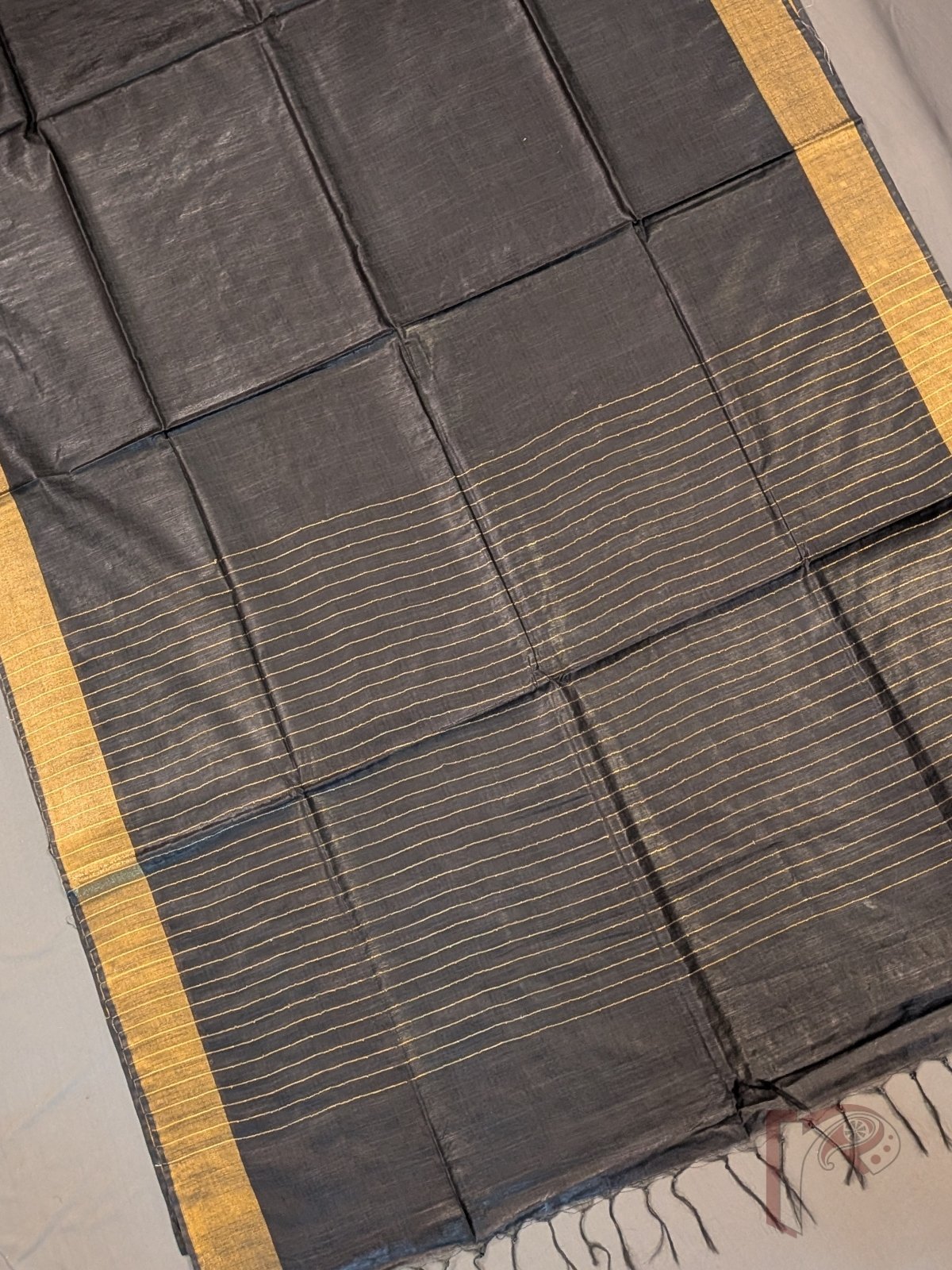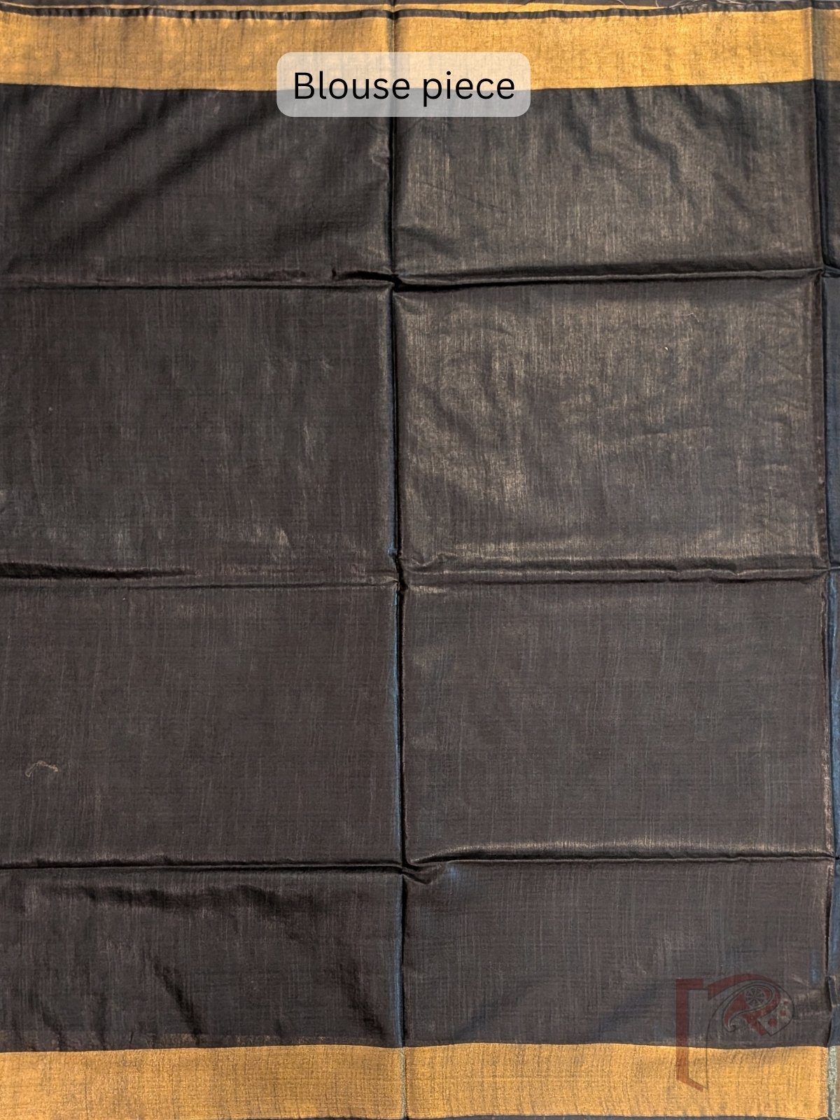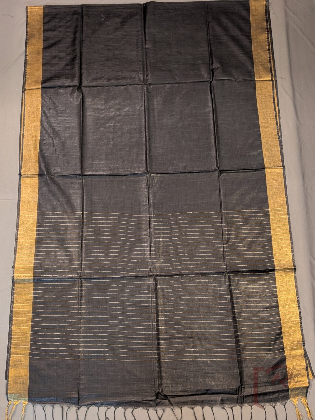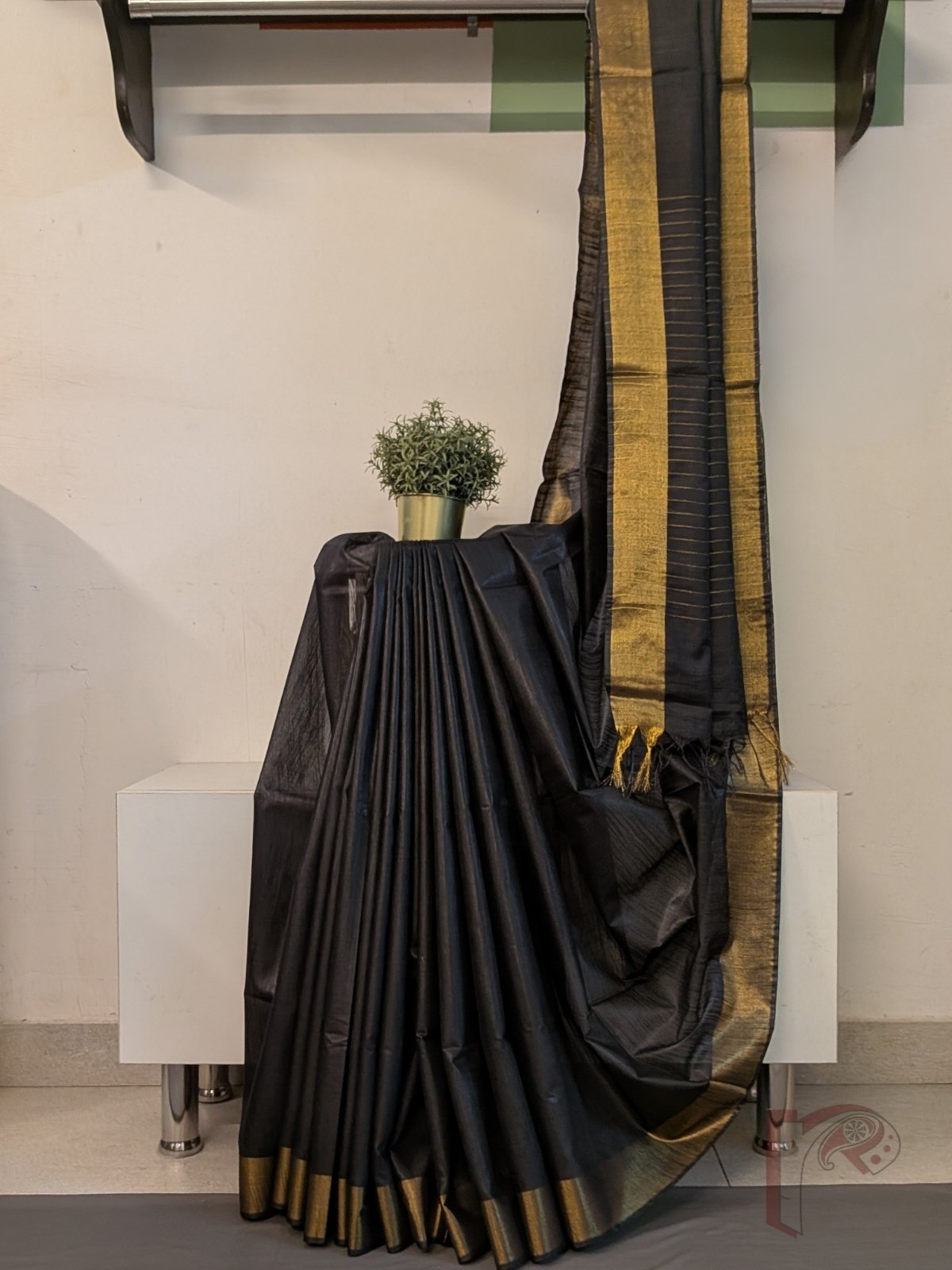 Striking and timeless, this classic black Katan silk saree exudes sophistication with its plain woven body and rich silk sheen. The 3-inch gold zari border creates a bold contrast, enhancing the elegance of the saree. The pallu is designed with minimal gold lines, adding subtle detailing while maintaining a clean aesthetic. The smooth drape and lightweight silk make it comfortable for long wear. Paired with a running blouse with zari accents, this saree offers bold elegance, refined simplicity, and versatile festive styling suitable for evening occasions and formal celebrations.