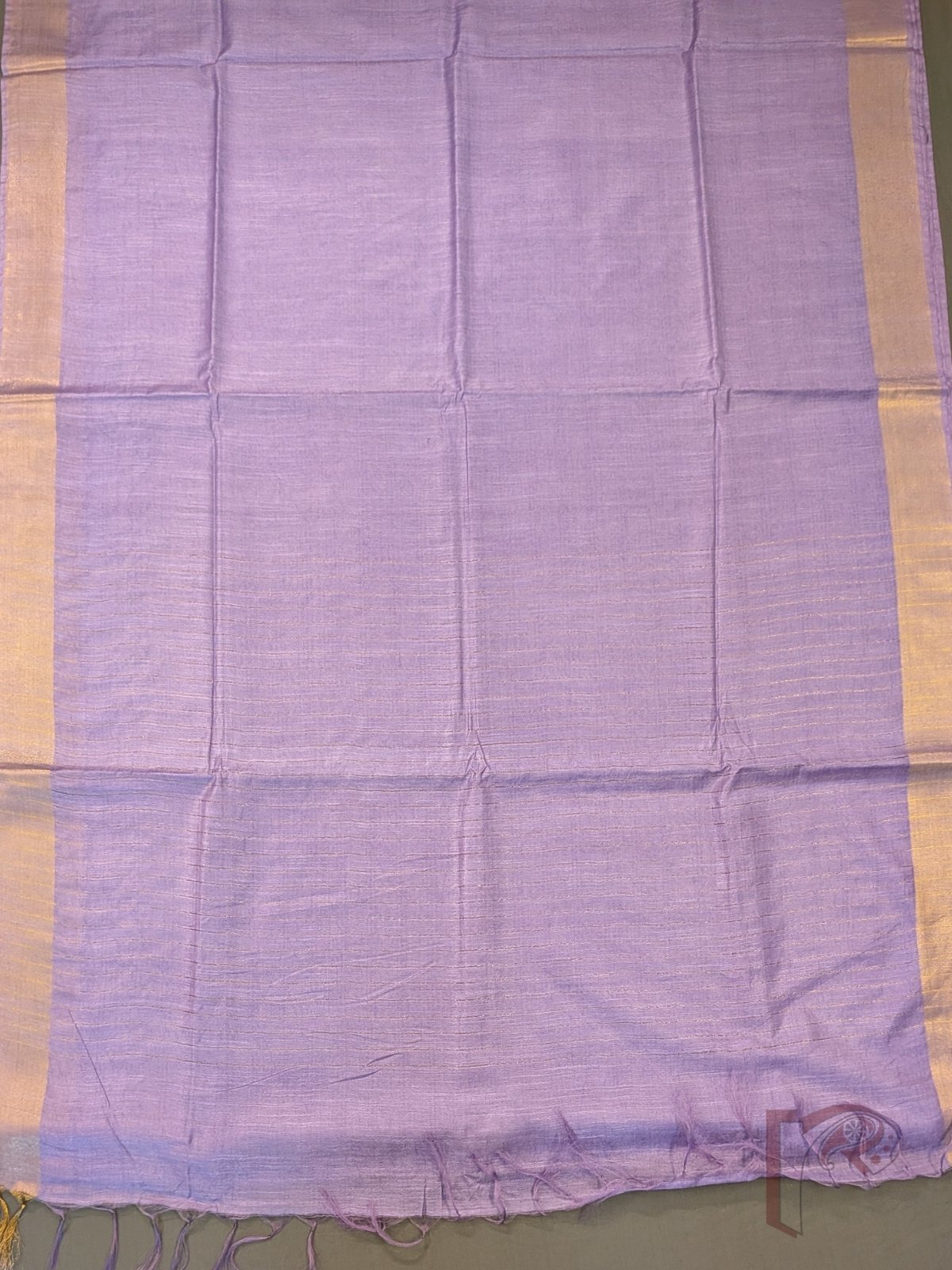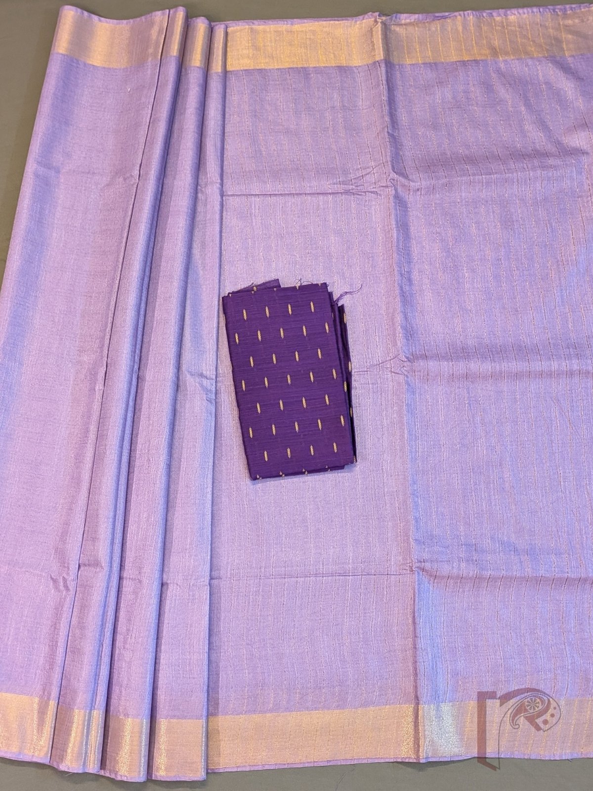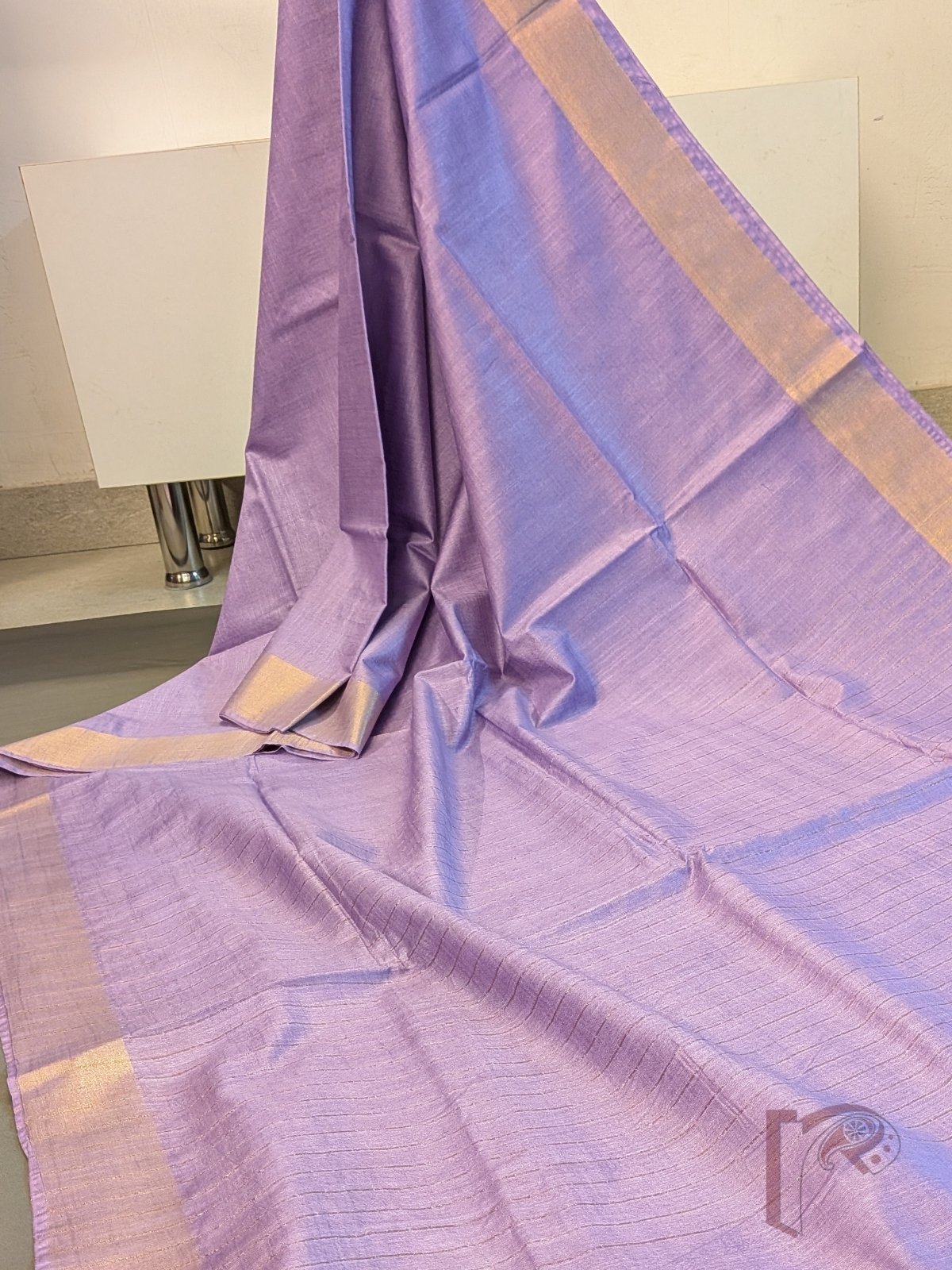 Katan Charm: Pastel Lavender Katan Silk Plain Saree with 3 Inch Gold Zari Border and Minimal Gold Line Pallu