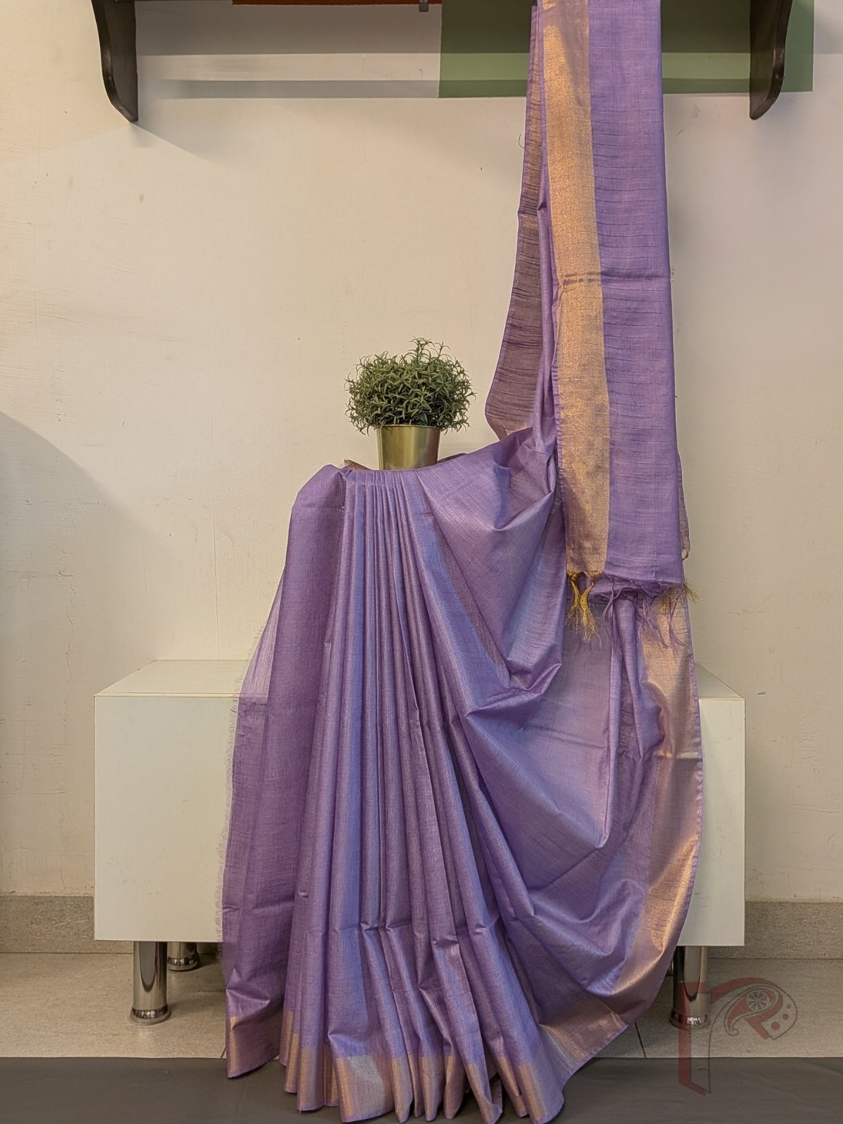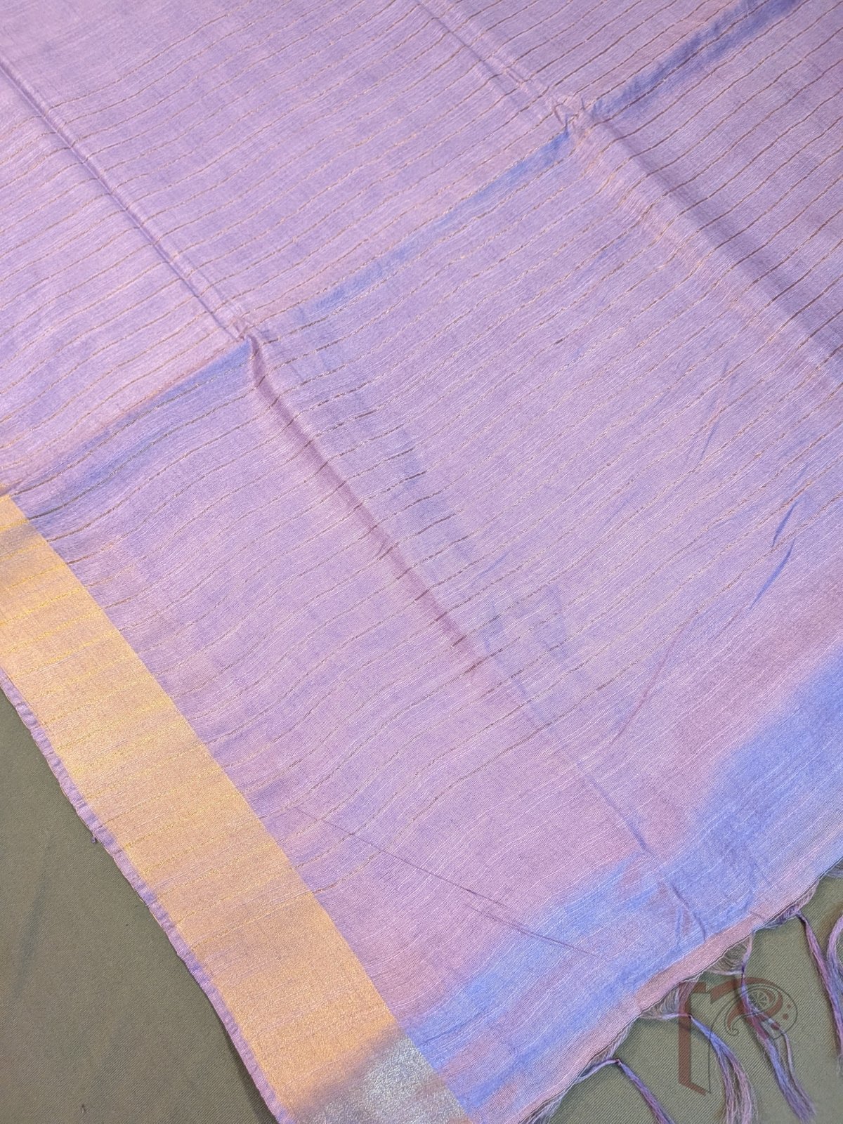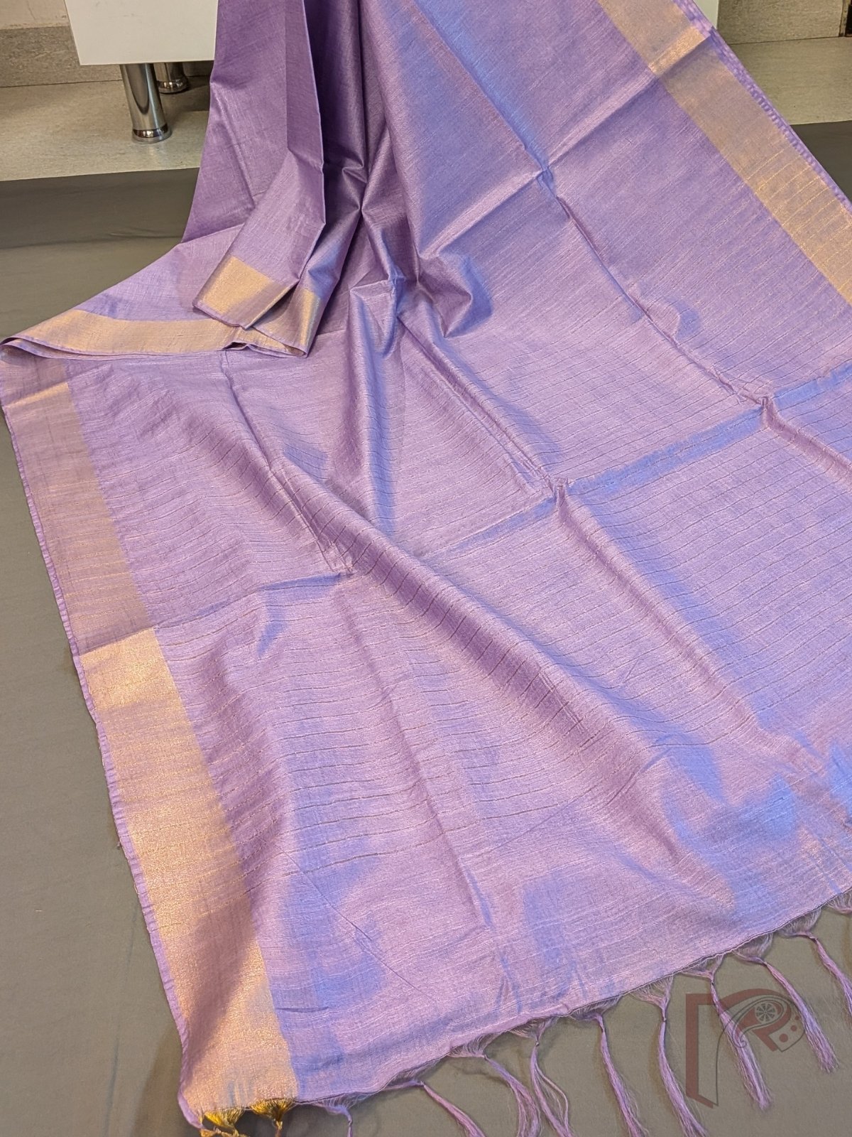 Katan Charm: Pastel Lavender Katan Silk Plain Saree with 3 Inch Gold Zari Border and Minimal Gold Line Pallu