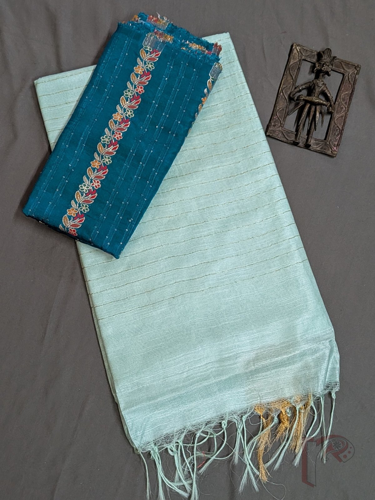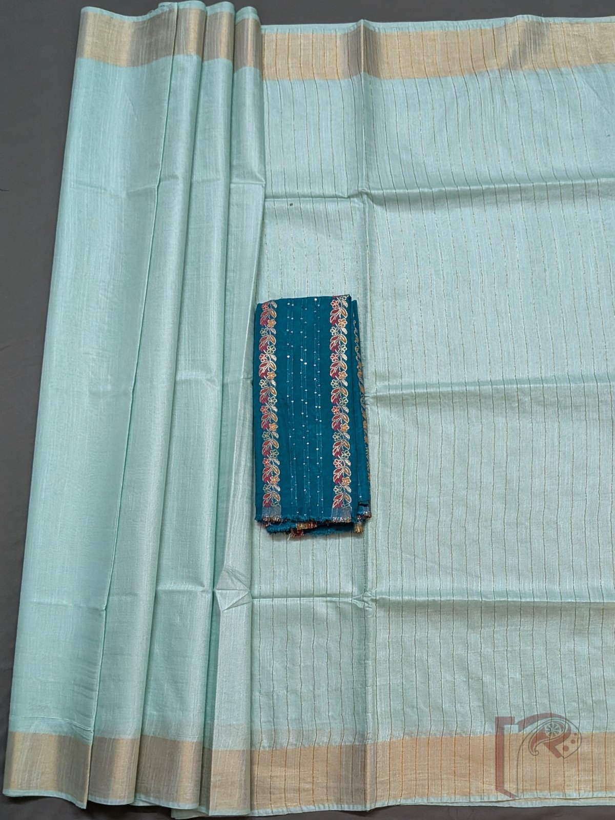 This pastel sky blue Katan silk saree offers a soothing and elegant appeal with its clean plain weave and delicate sheen. The saree is framed with a 3-inch gold zari border, adding a traditional accent to the soft modern color. The pallu is beautifully highlighted with simple gold zari lines, maintaining the understated charm of the saree. The lightweight silk drapes smoothly and holds its structure well, making it suitable for both formal and festive wear. Finished with a running blouse with zari detailing, this saree reflects graceful simplicity, breathable silk comfort, and timeless sophistication.