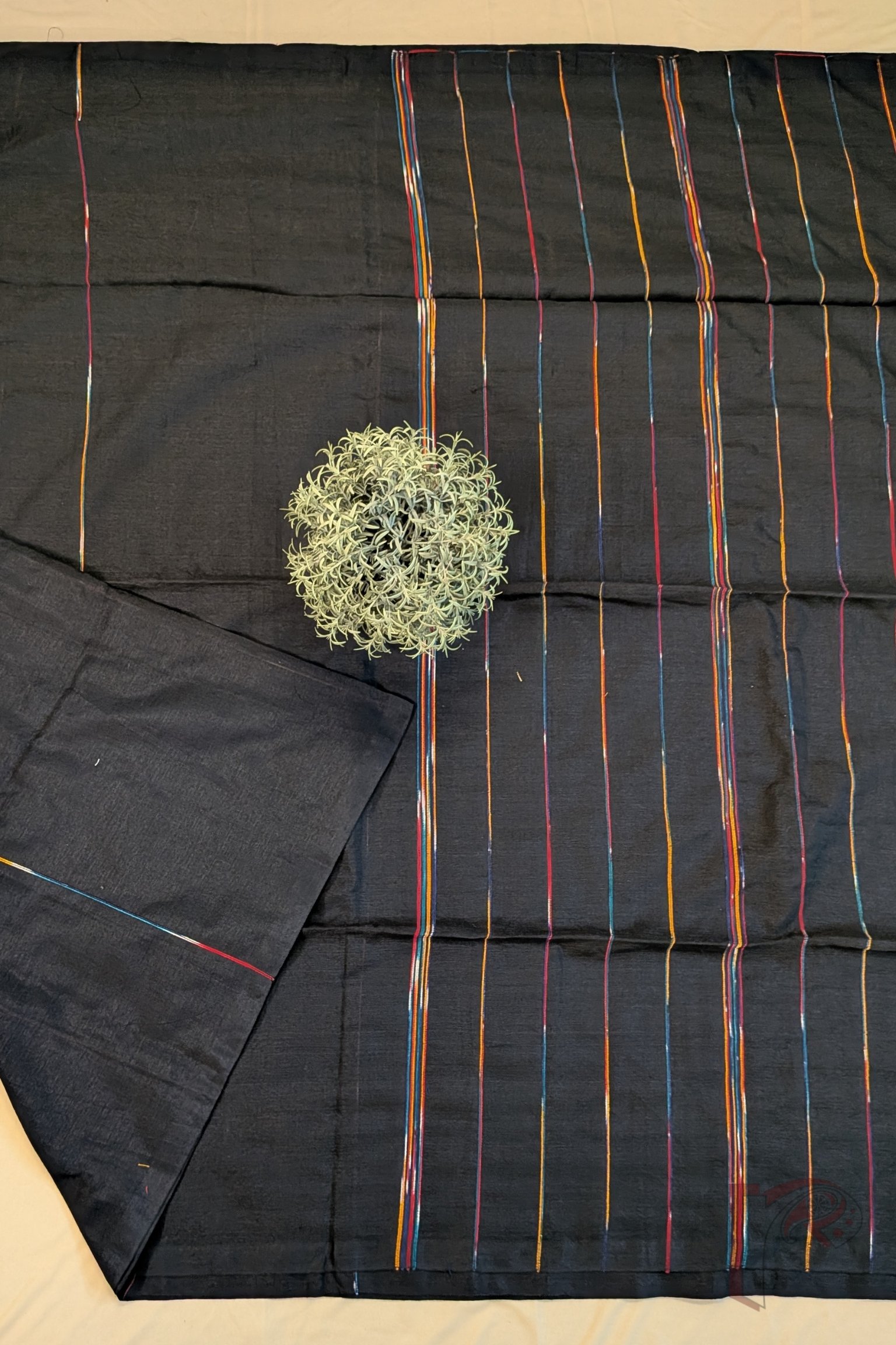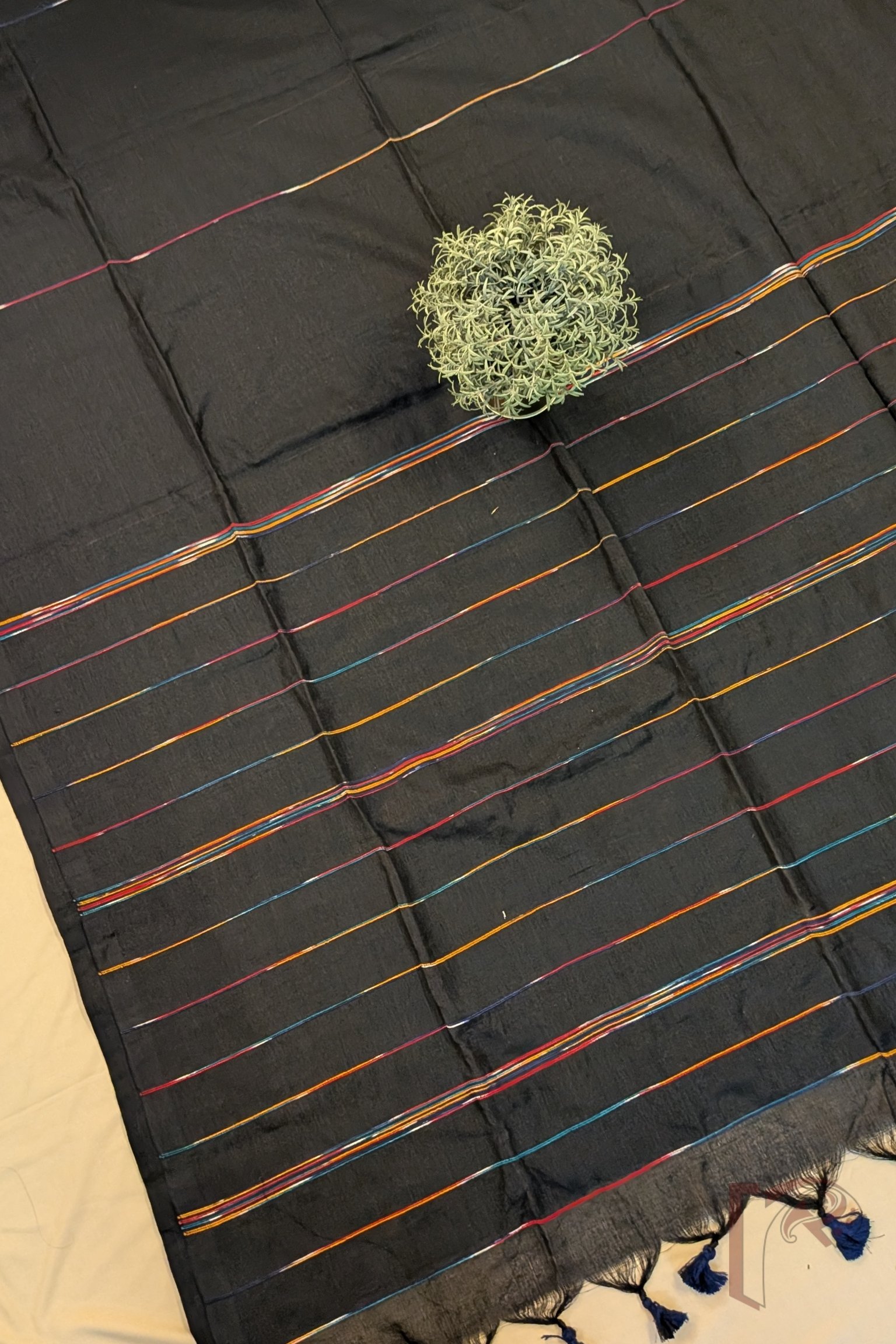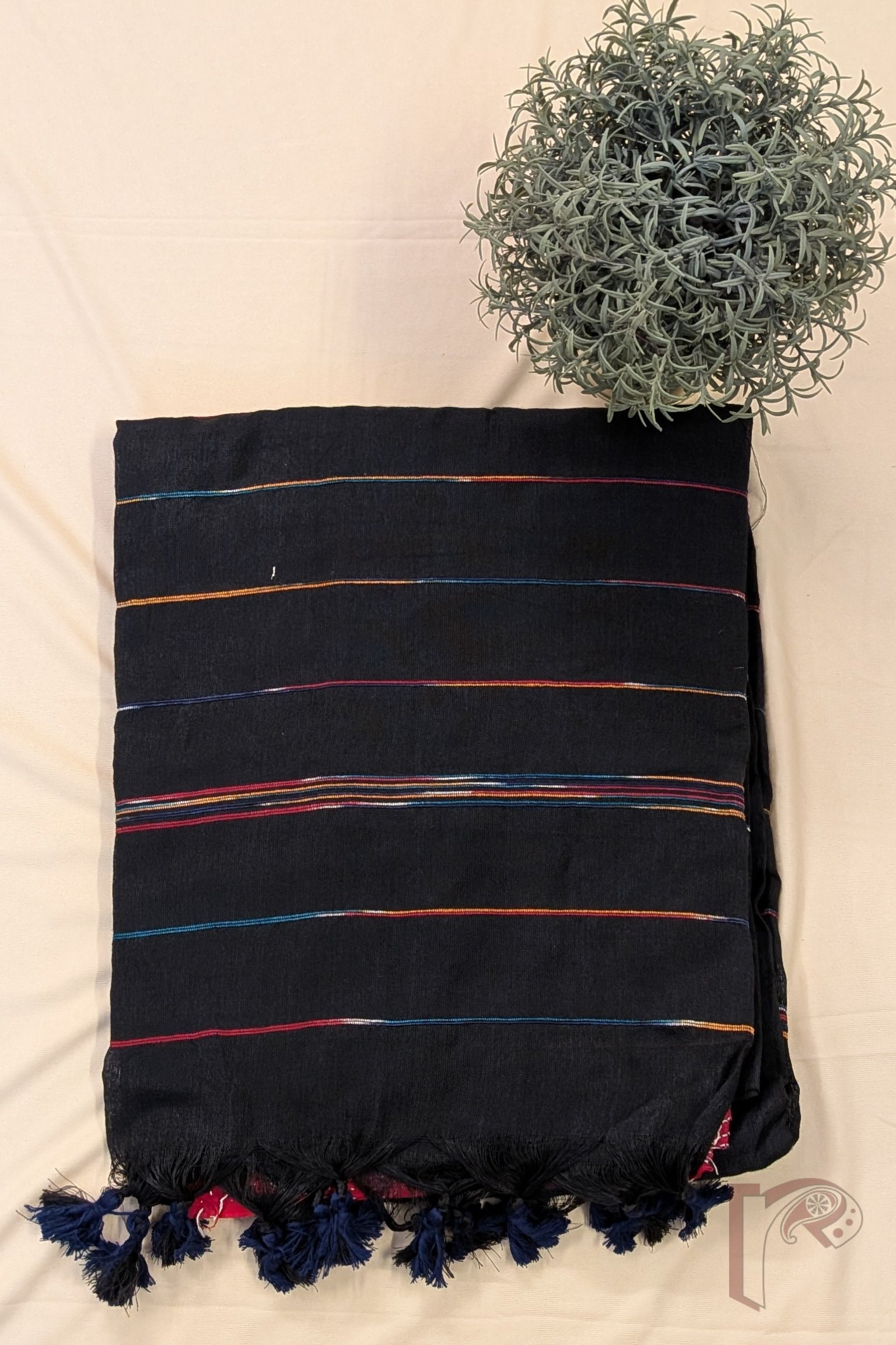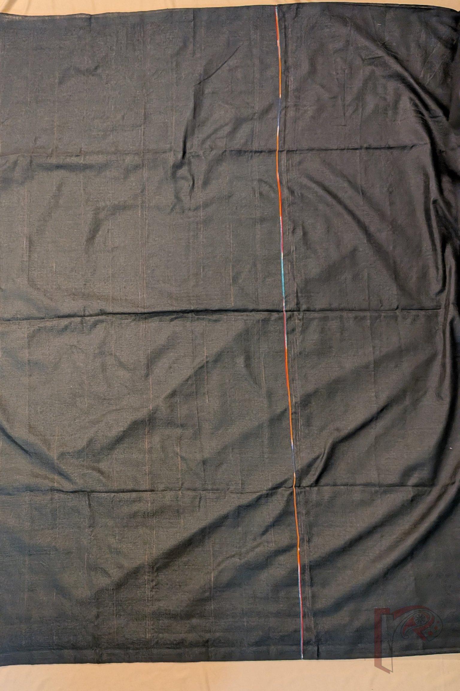 Bold and timeless, this black Khesh cotton saree is a stunning example of minimal design enhanced with handcrafted detail. The saree features multicolour woven thread lines spaced gracefully across the plain black body, creating a delicate yet striking contrast. On the pallu, the same lines appear closer together, forming a beautiful handcrafted highlight that elevates the drape. Woven using the traditional Khesh method, the fabric carries a distinct rustic texture and sustainable artisanal charm. Its versatile design makes it an excellent pairing with printed, Ajrakh, or Kantha blouses for a unique statement look.