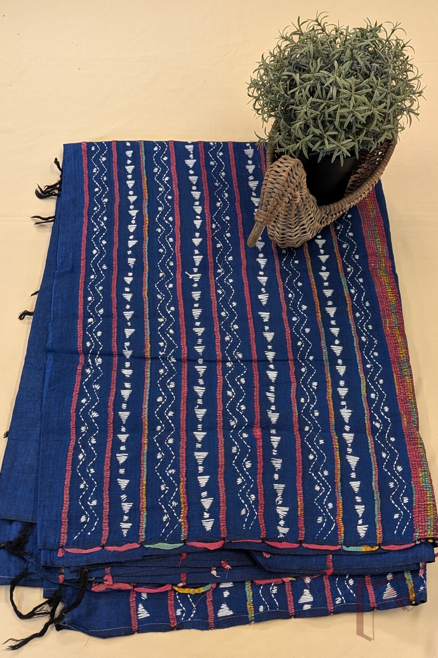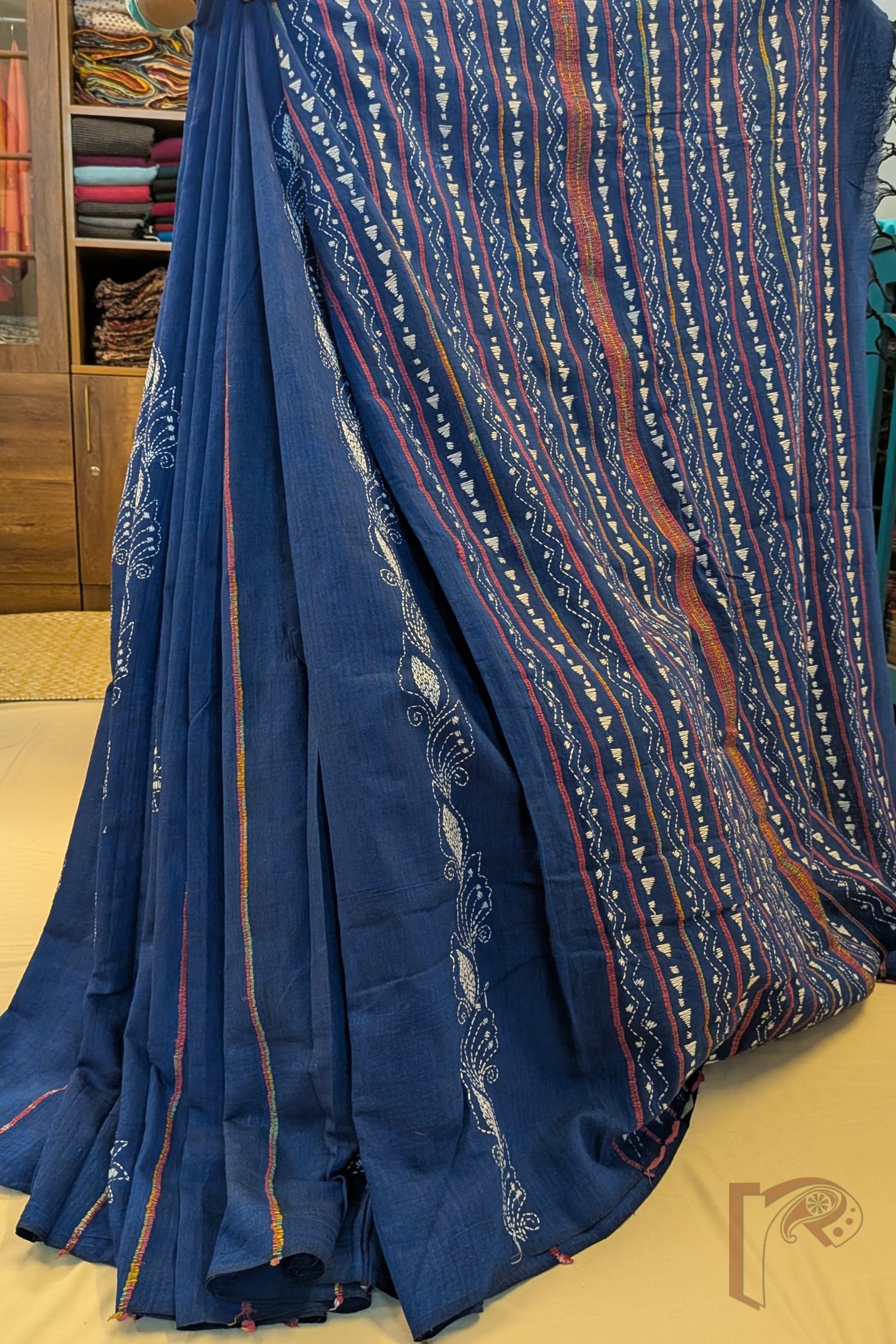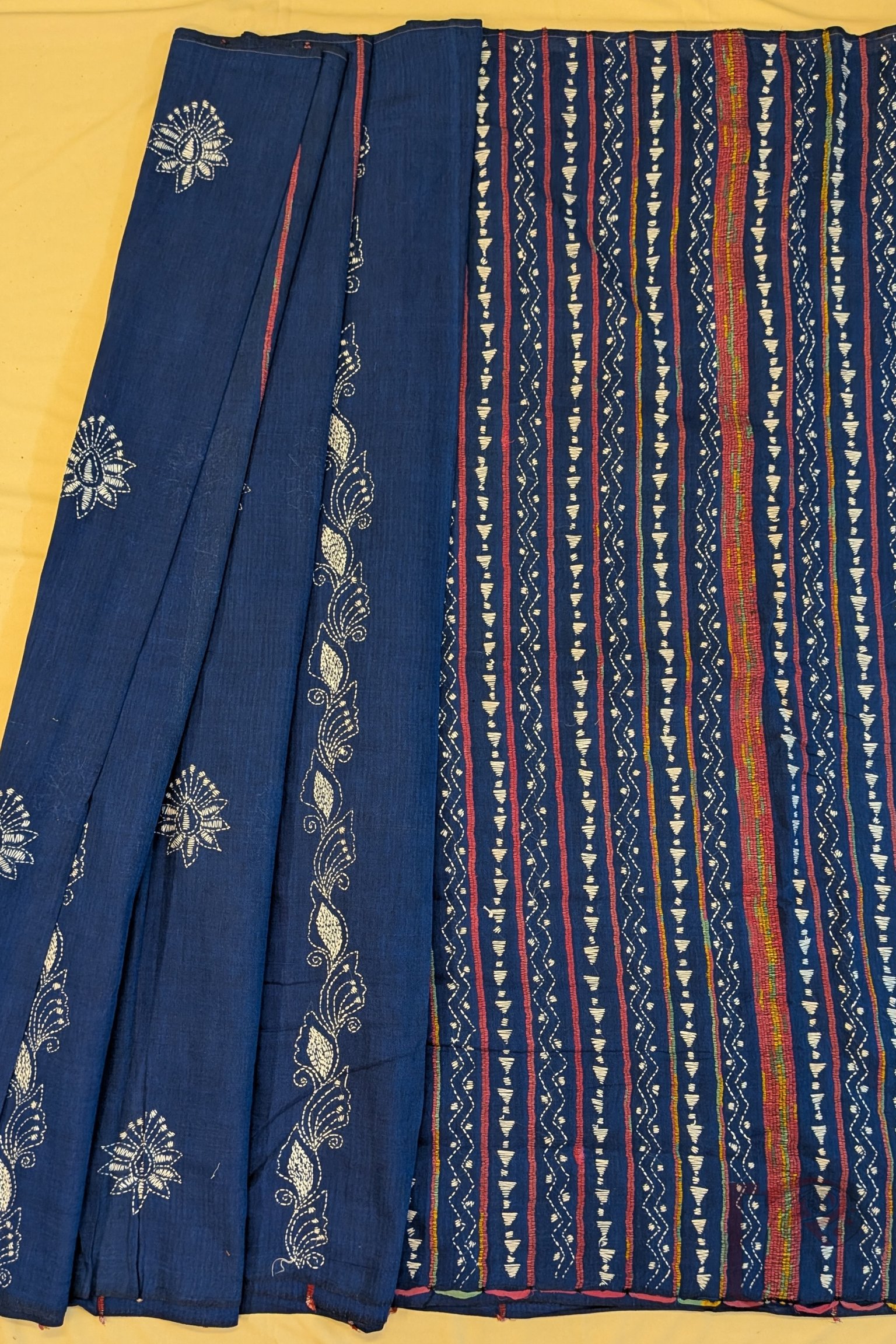 What makes these sarees even more enchanting is the age-old Kantha embroidery—an artistic expression passed down generations, typically crafted by rural women of Bengal. This collection showcases hand-done Kantha work that ranges from minimal to intricate detailing, rendered in floral, geometric, and symbolic motifs. Each saree takes hours—if not days—of meticulous hand embroidery, turning every piece into a canvas of cultural storytelling. The dense stitches and harmonious color palettes add layers of depth and grace, making them suitable for both everyday elegance and festive charm.